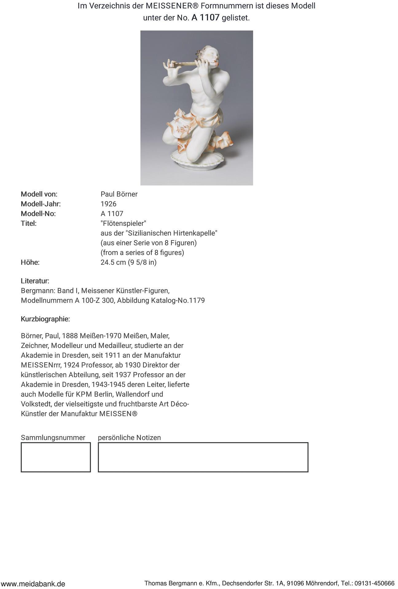 * Börner, Maler, Zeichner, Modelleur und Medailleur, studierte an der Akademie in Dresden. Seit 1911 an der Manufaktur Meissen, 1924 Professor, ab 1930 Direktor der künstlerischen Abteilung, seit 1937 Professor an der Akademie in Dresden, 1943-1945 deren Leiter. Lieferte auch Modelle für KPM Berlin, Wallendorf und Volkstedt, der vielseitigste und fruchtbarste Art déco-Künstler der Manufaktur Meissen.