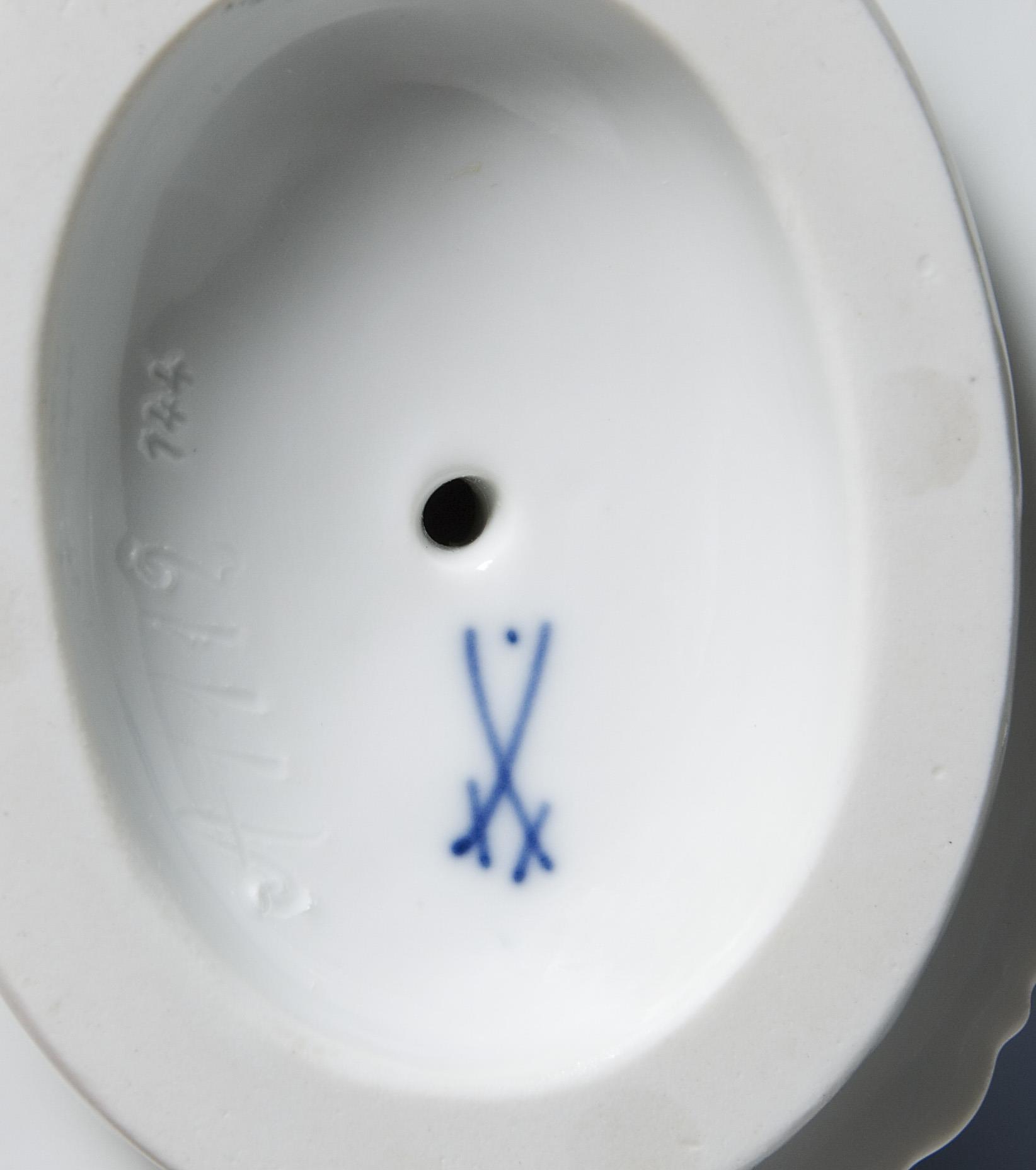Pendant zu Modell-Nr. A 1111, farbig bemalt. Ritzmarke, Pressmarke, Malermarke, Schwertermarke mit Punkt, Künstler-Signet. Eine Hand fachmännisch restauriert.