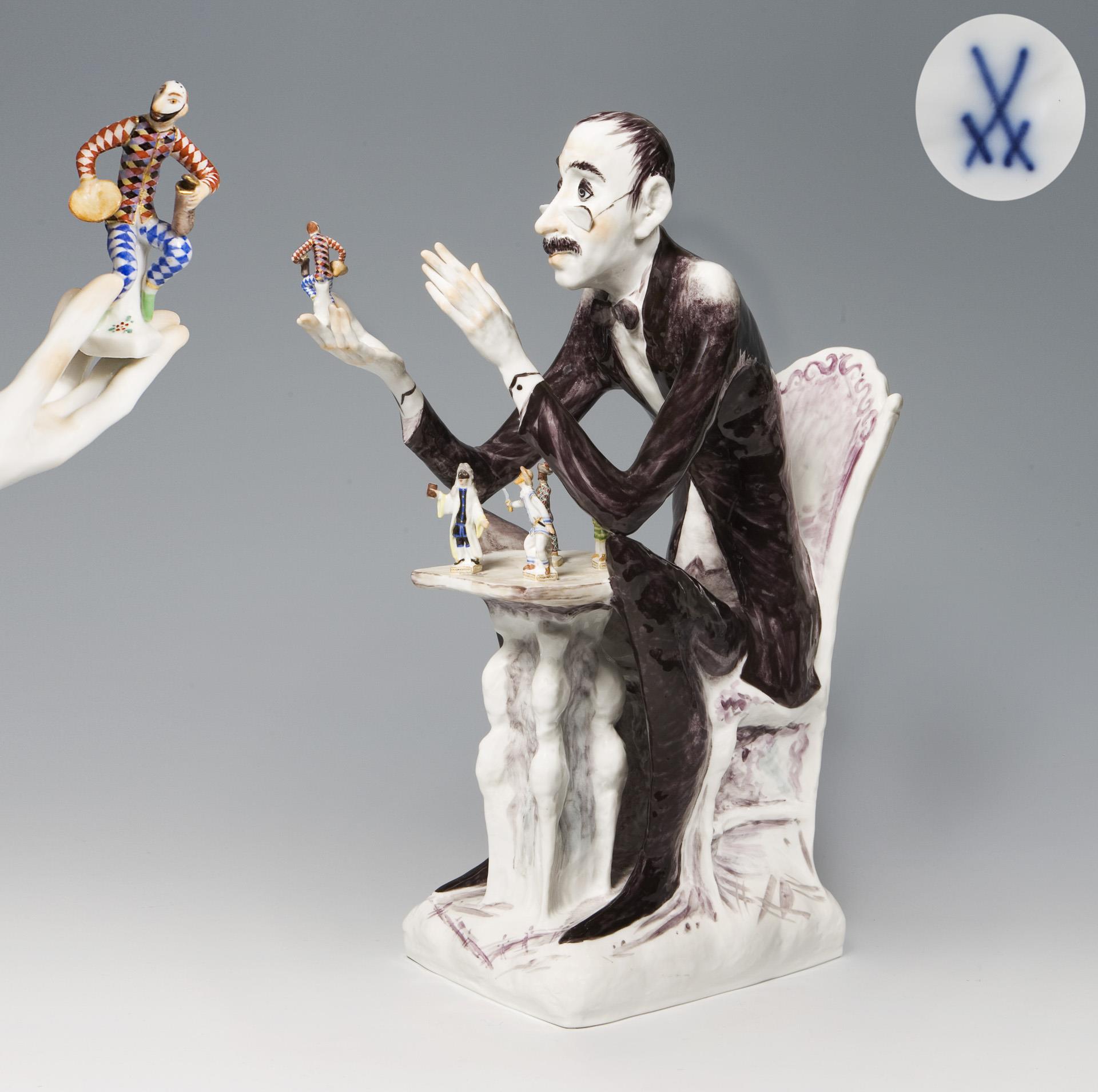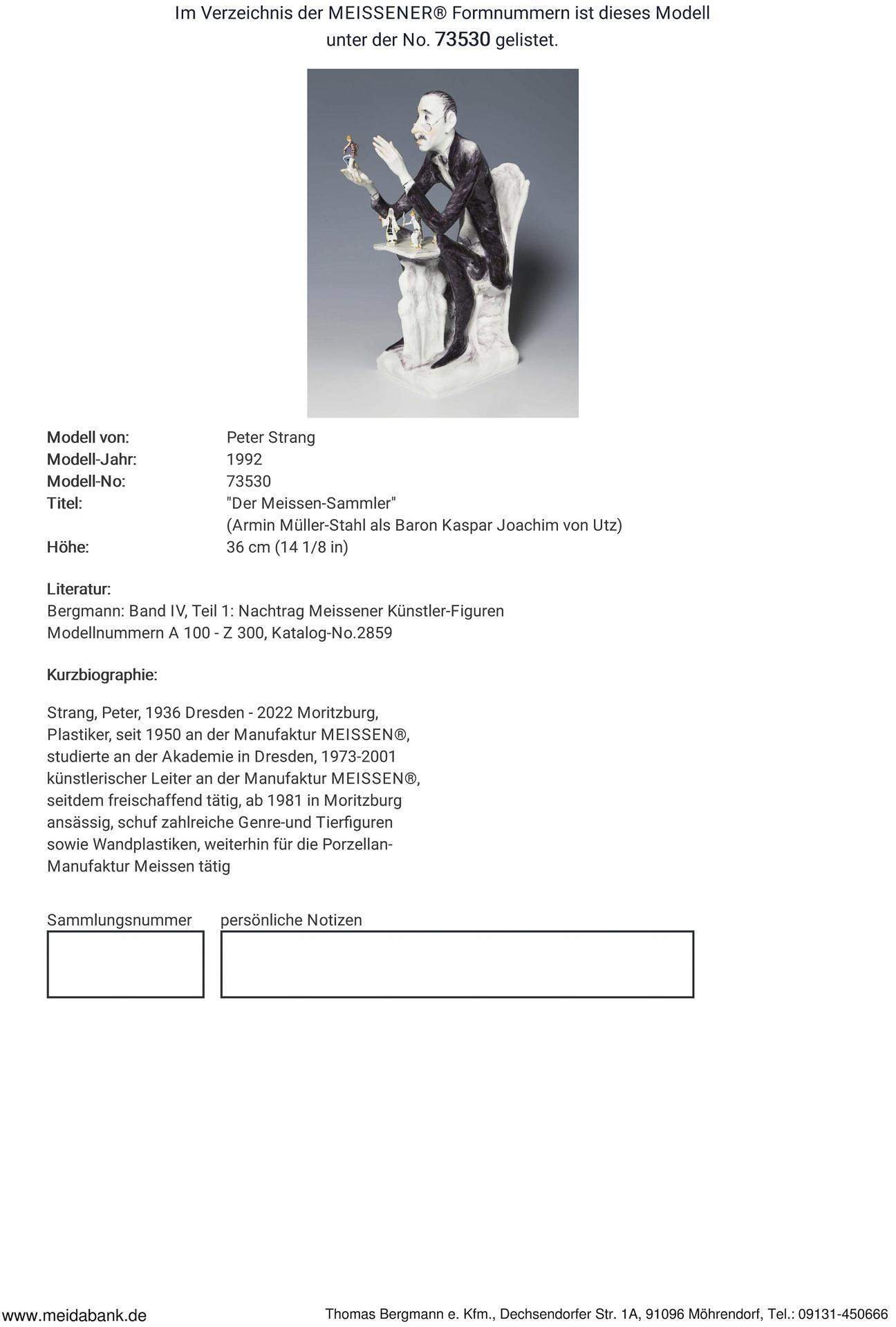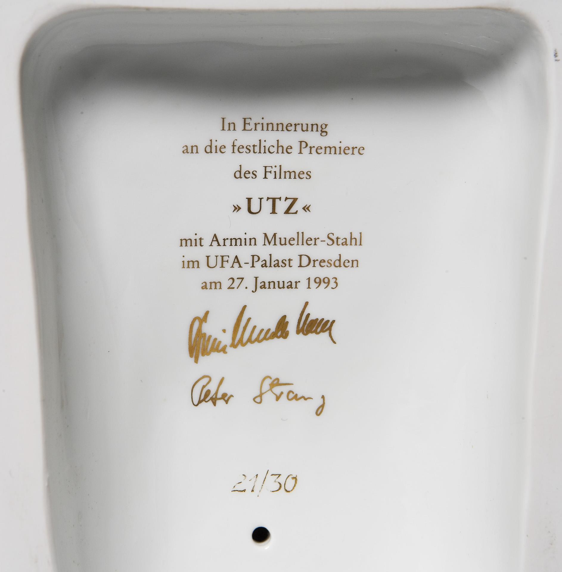Limitierte Edition, nummeriertes Exemplar: 21/30, farbig bemalt. Armin Müller-Stahl als Baron Kaspar Joachim von Utz (Utz ist ein Filmdrama mit Armin Müller-Stahl in der Hauptrolle, es basiert auf den Roman Utz von Bruce Chatwin, Baron von Utz war ein Sammler von Meissener Figuren). Pressmarken, Malermarke, goldene Widmung mit den Unterschriften von Armin Müller-Stahl und Peter Strang, Schwertermarke am Sockel, Künstler-Signet. Säbel der Miniatur-Figur Coviello bestoßen.