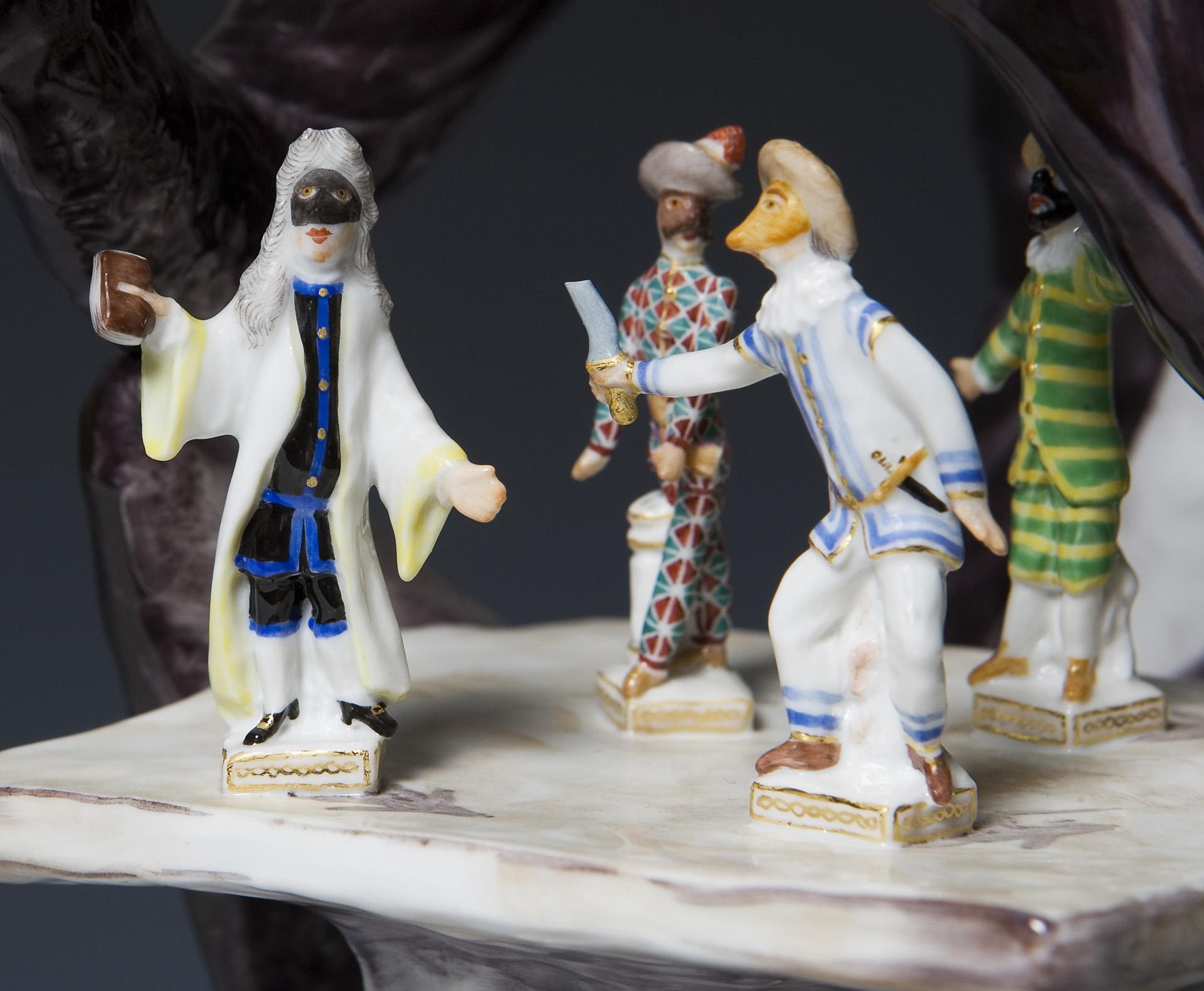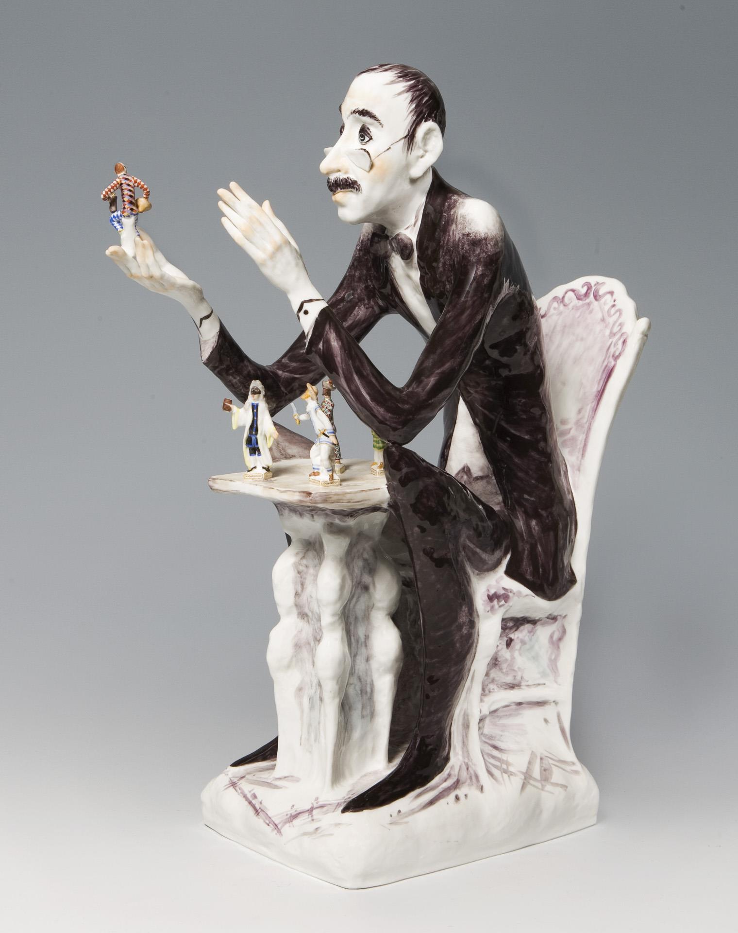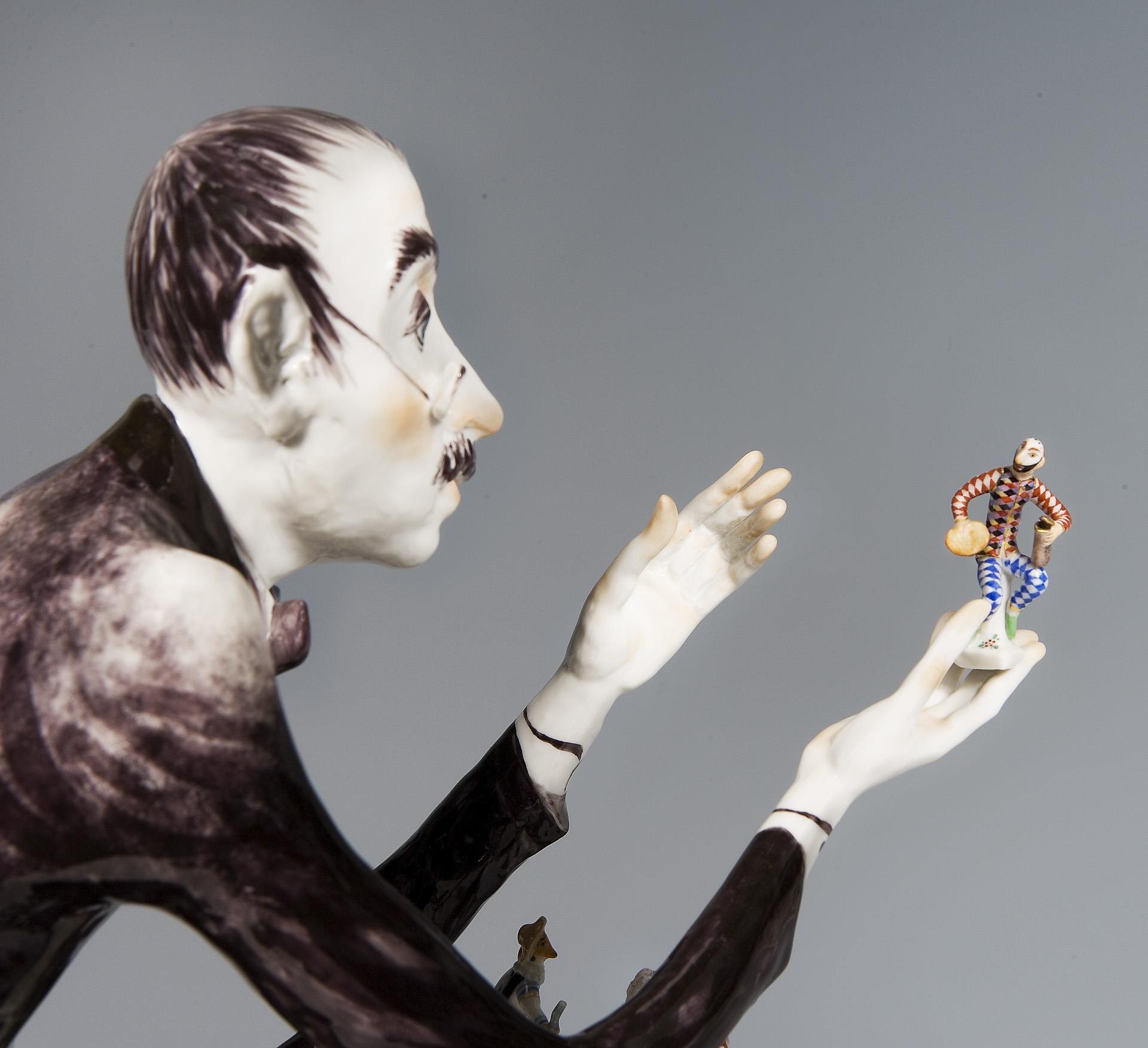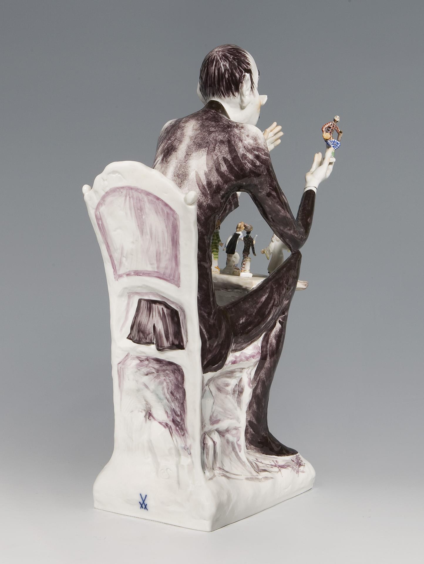 Limitierte Edition, nummeriertes Exemplar: 21/30, farbig bemalt. Armin Müller-Stahl als Baron Kaspar Joachim von Utz (Utz ist ein Filmdrama mit Armin Müller-Stahl in der Hauptrolle, es basiert auf den Roman Utz von Bruce Chatwin, Baron von Utz war ein Sammler von Meissener Figuren). Pressmarken, Malermarke, goldene Widmung mit den Unterschriften von Armin Müller-Stahl und Peter Strang, Schwertermarke am Sockel, Künstler-Signet. Säbel der Miniatur-Figur Coviello bestoßen.