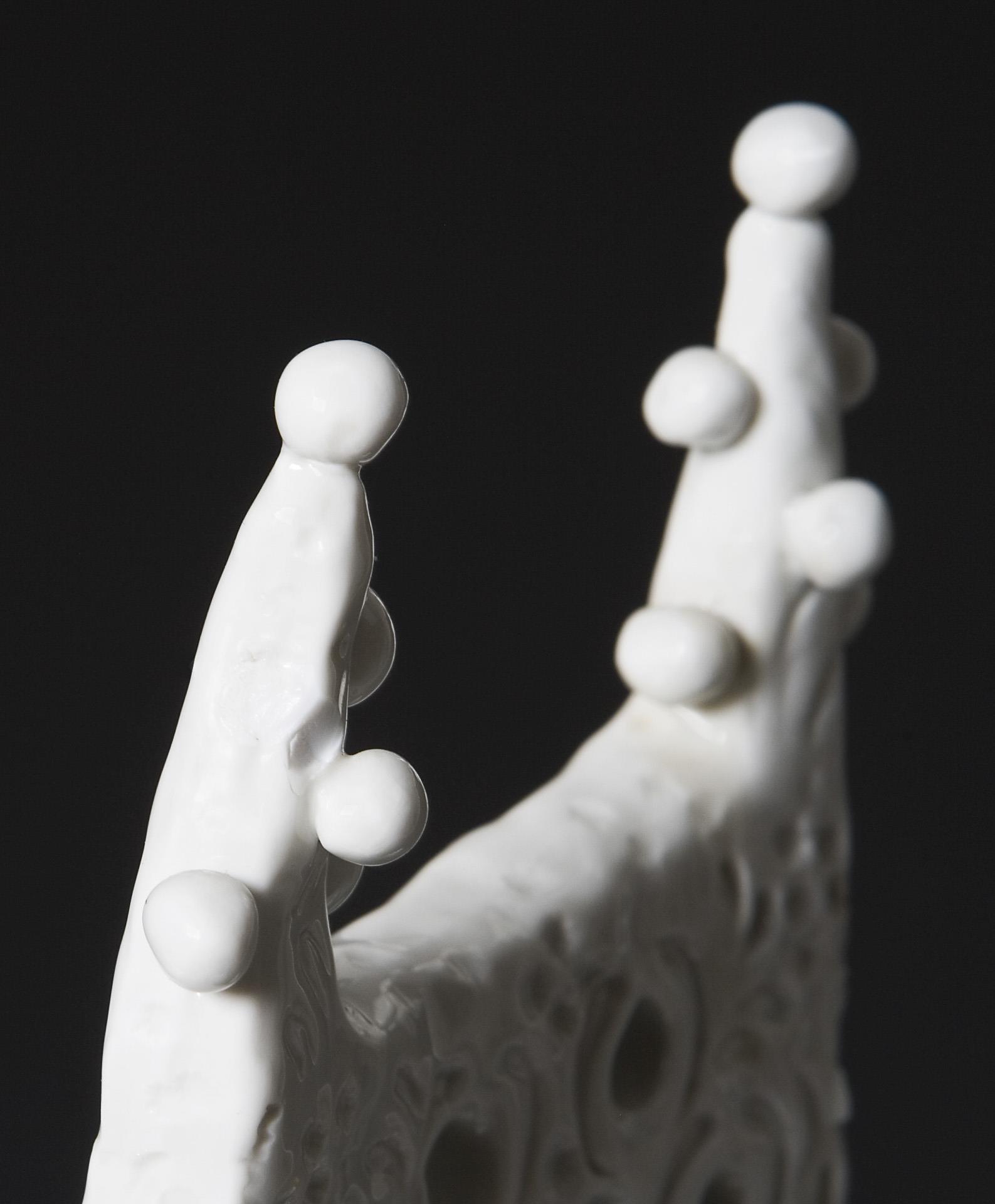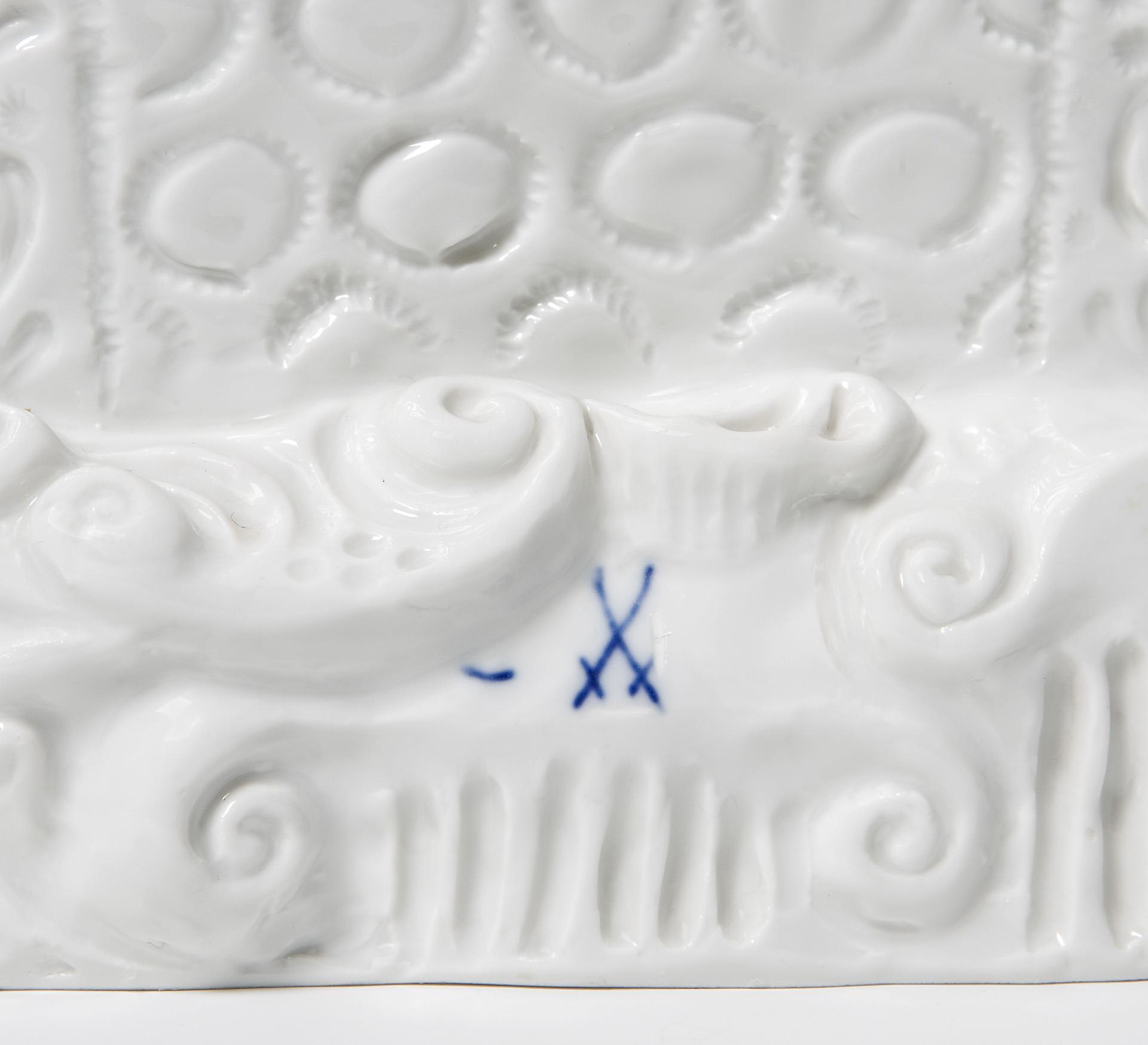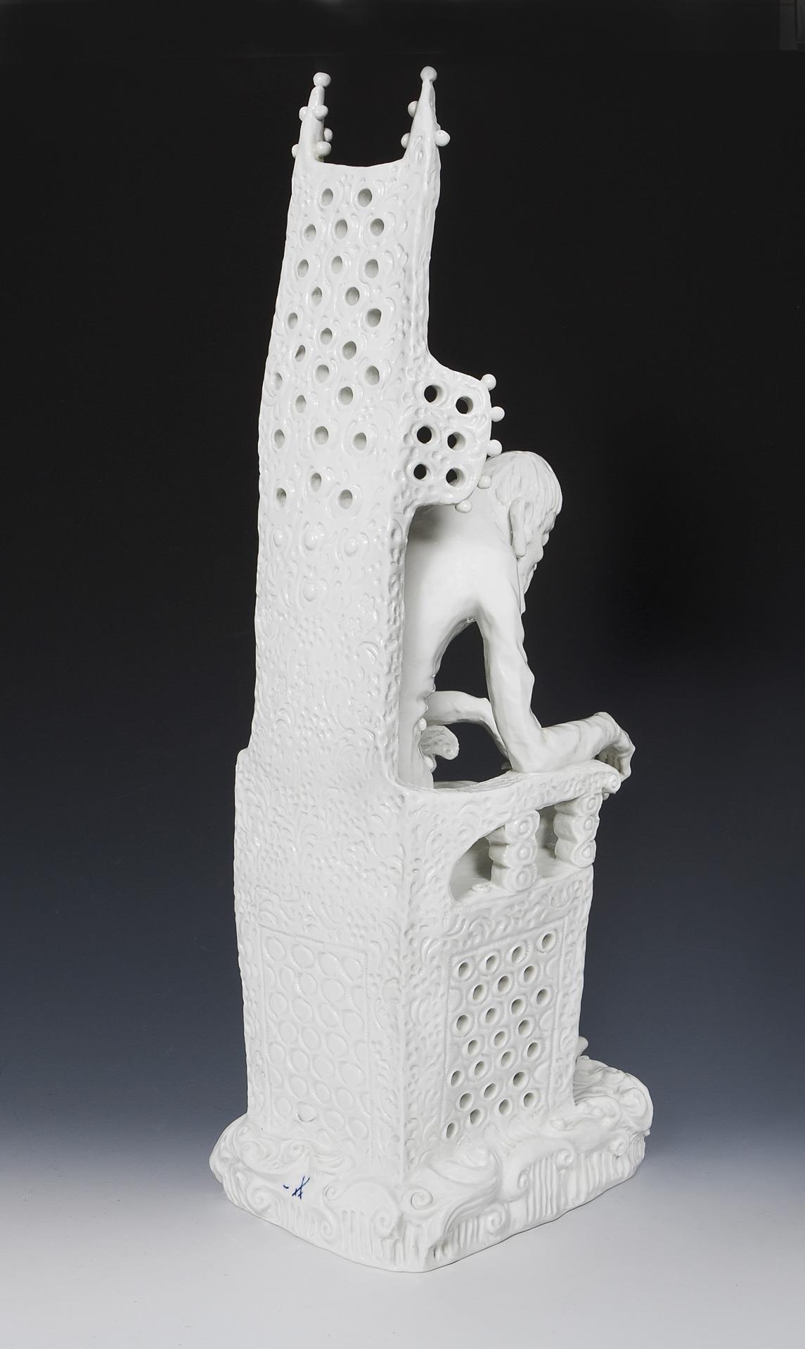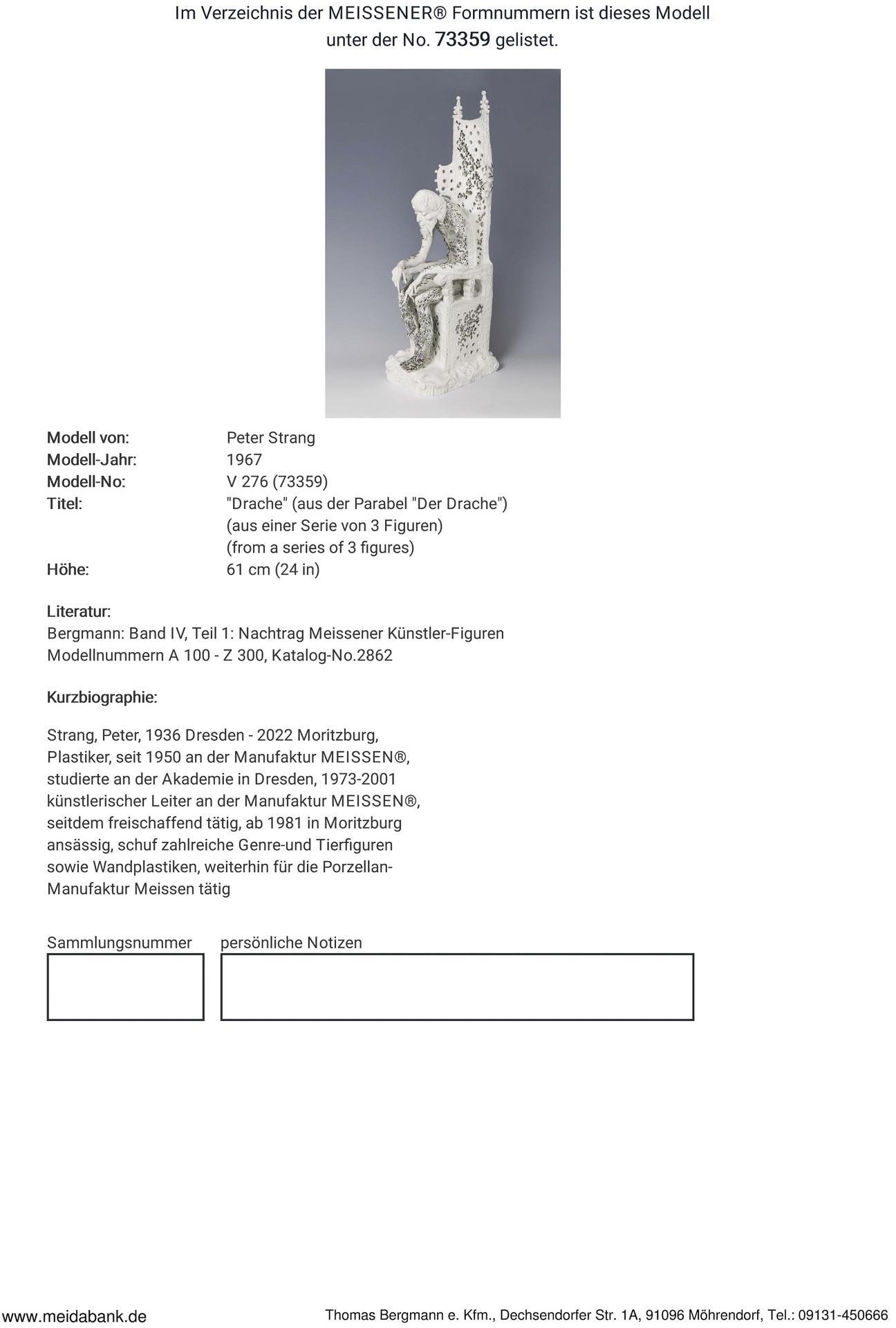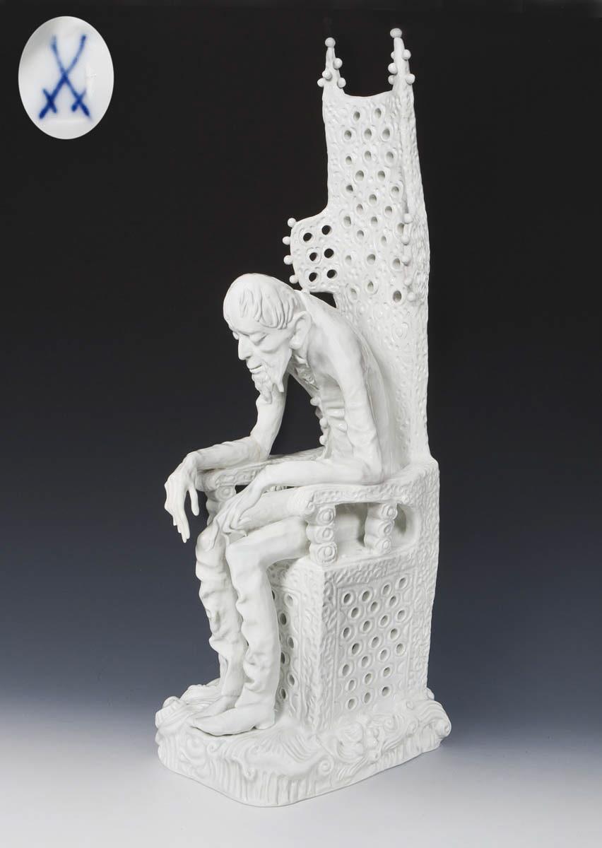 Weißporzellan. Figur aus der Parabel "Der Drache" von Jewgeni Lwowitsch Schwarz (1896-1958), eine famose Parabel auf jede Art von Tyrannei. Aus einer Serie von 3 Figuren: "Elsa", "Lanzelot" und "Drache". Ritzmarke, Pressmarke, Schwertermarke am Sockel zweimal gestrichen. Seitlich am Gesäß sichtbar ausgebessert je ein Brandriss mit fortlaufendem Glasurriss, ein sichtbar ausgebesserter Brandriss in der Armbeuge und am Sitz, sechs Finger, zwei Daumen restauriert, zwei Kugeln der Stuhlbekrönung fehlen.