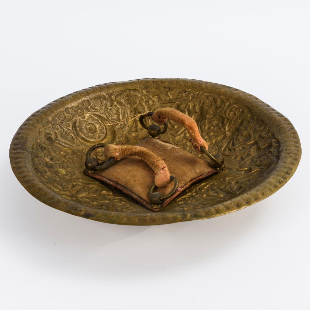 Figuren und Tiere zwischen Rankenmuster. Fein ausgeführte Treibarbeit mit aufgesetzten Buckeln. Innen Griffe und Armpolsterung.