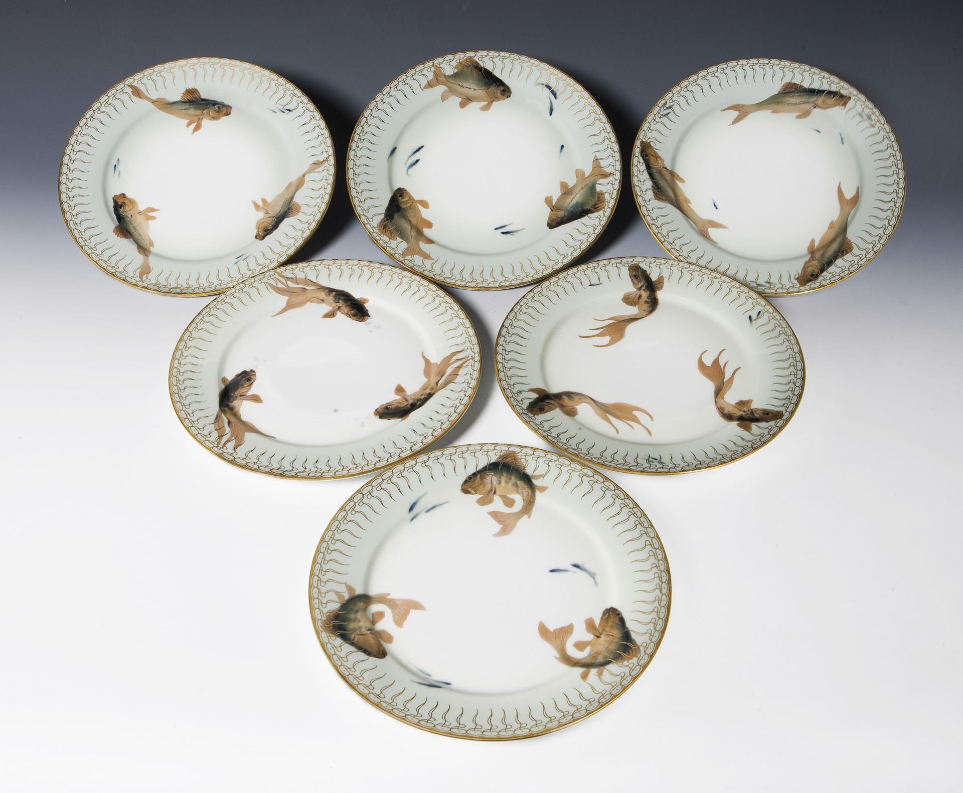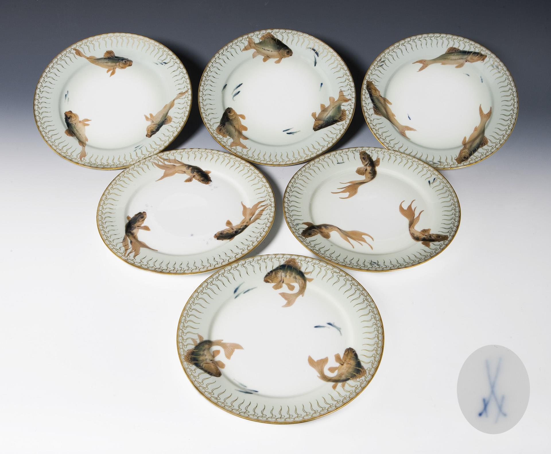 6er Satz seltene Jugendstil-Fischteller. Meissen.