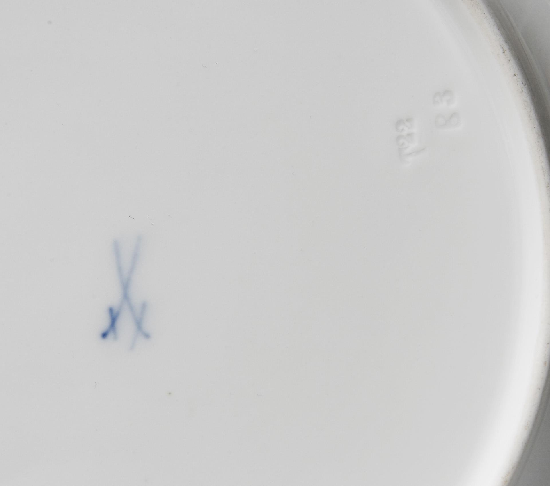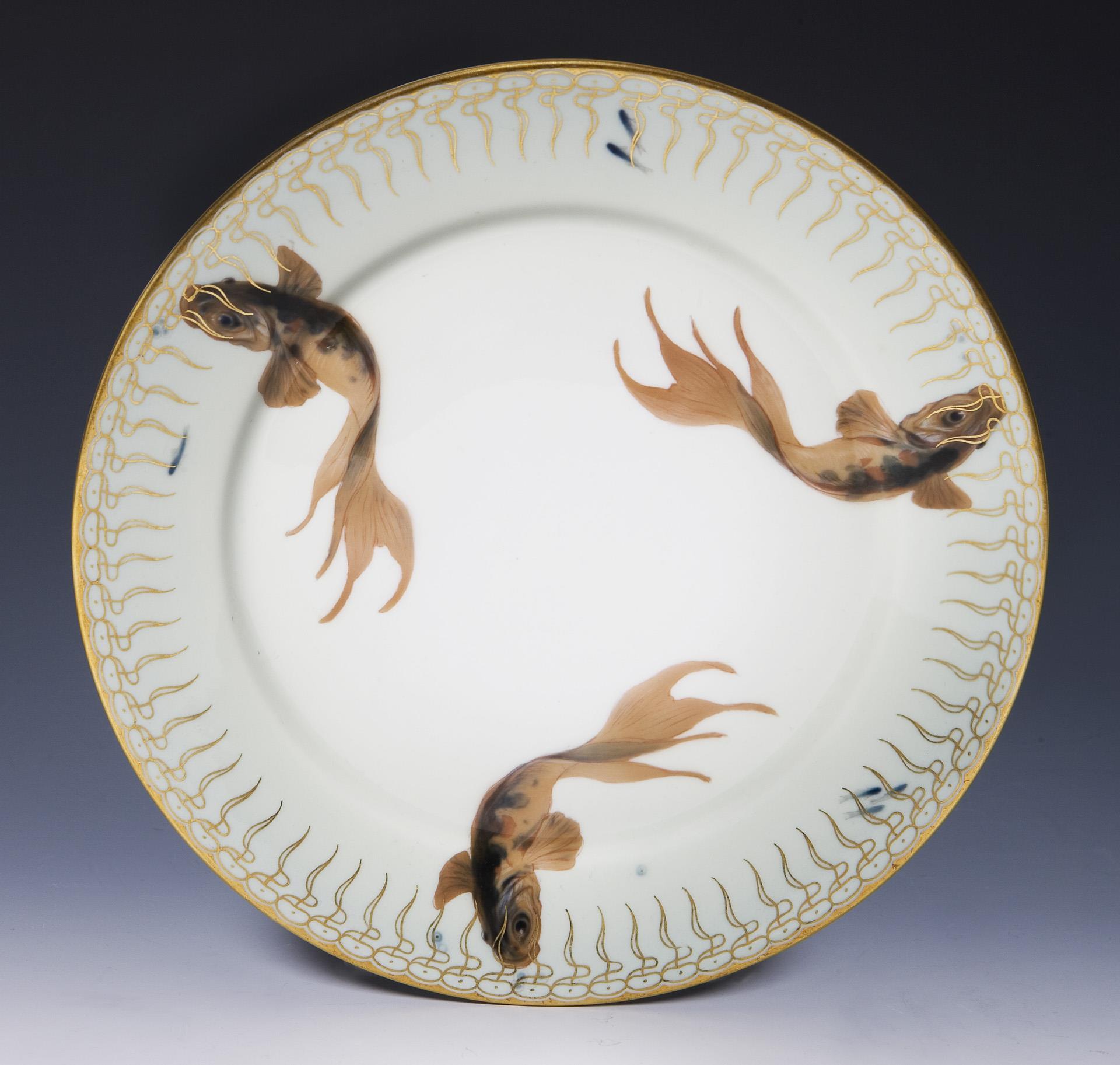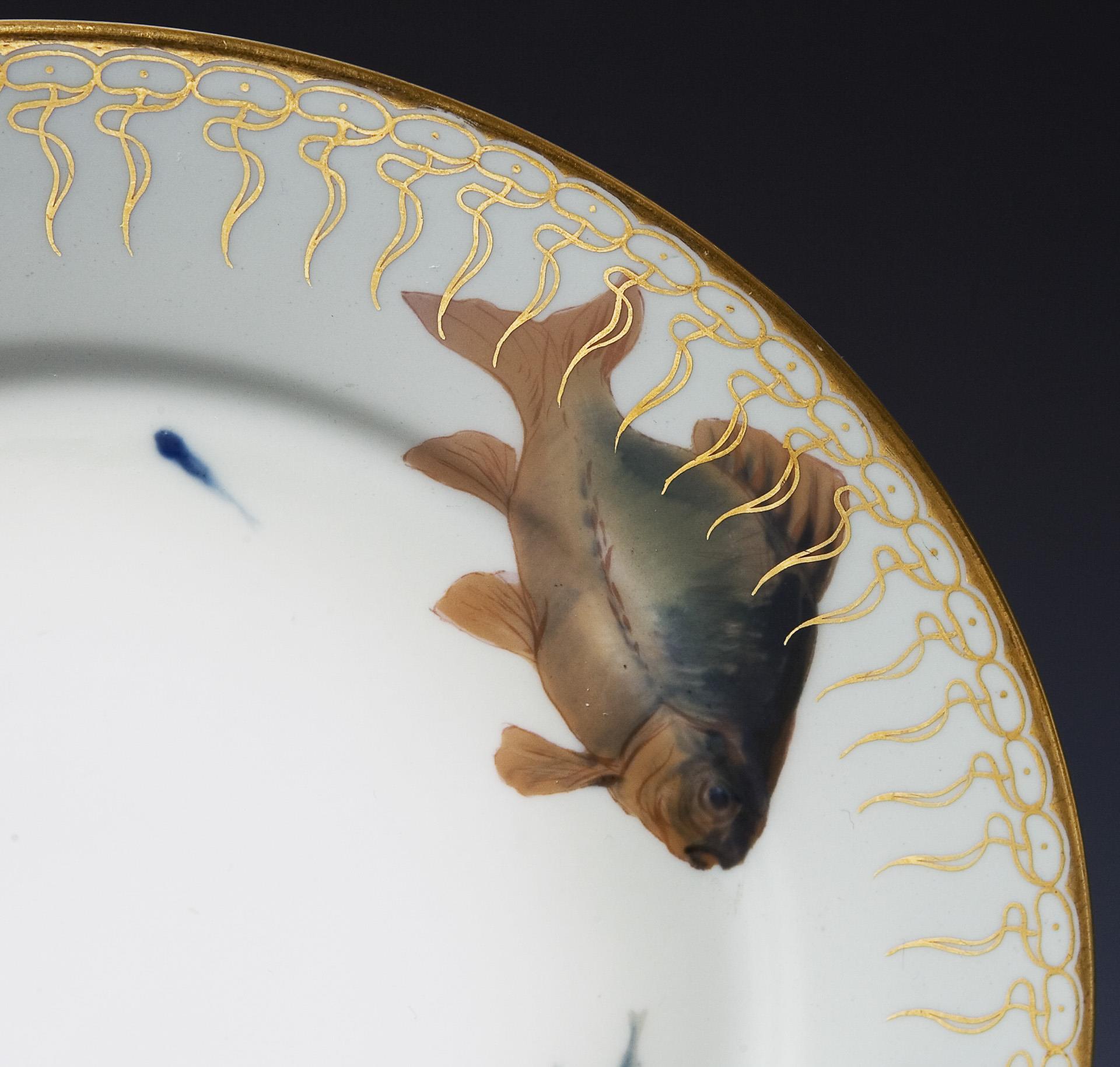 Dekor von Otto Eduard Voigt, Form "T-glatt". Fahne mit seladongrünem Fond und Goldbordüre. Feine farbige Unterglasurbemalung mit 6 verschiedenen Fisch-Motiven, glatter Goldrand. Pressmarken, Schwertermarken. Ein Standring mit kleinem Haarriss.
