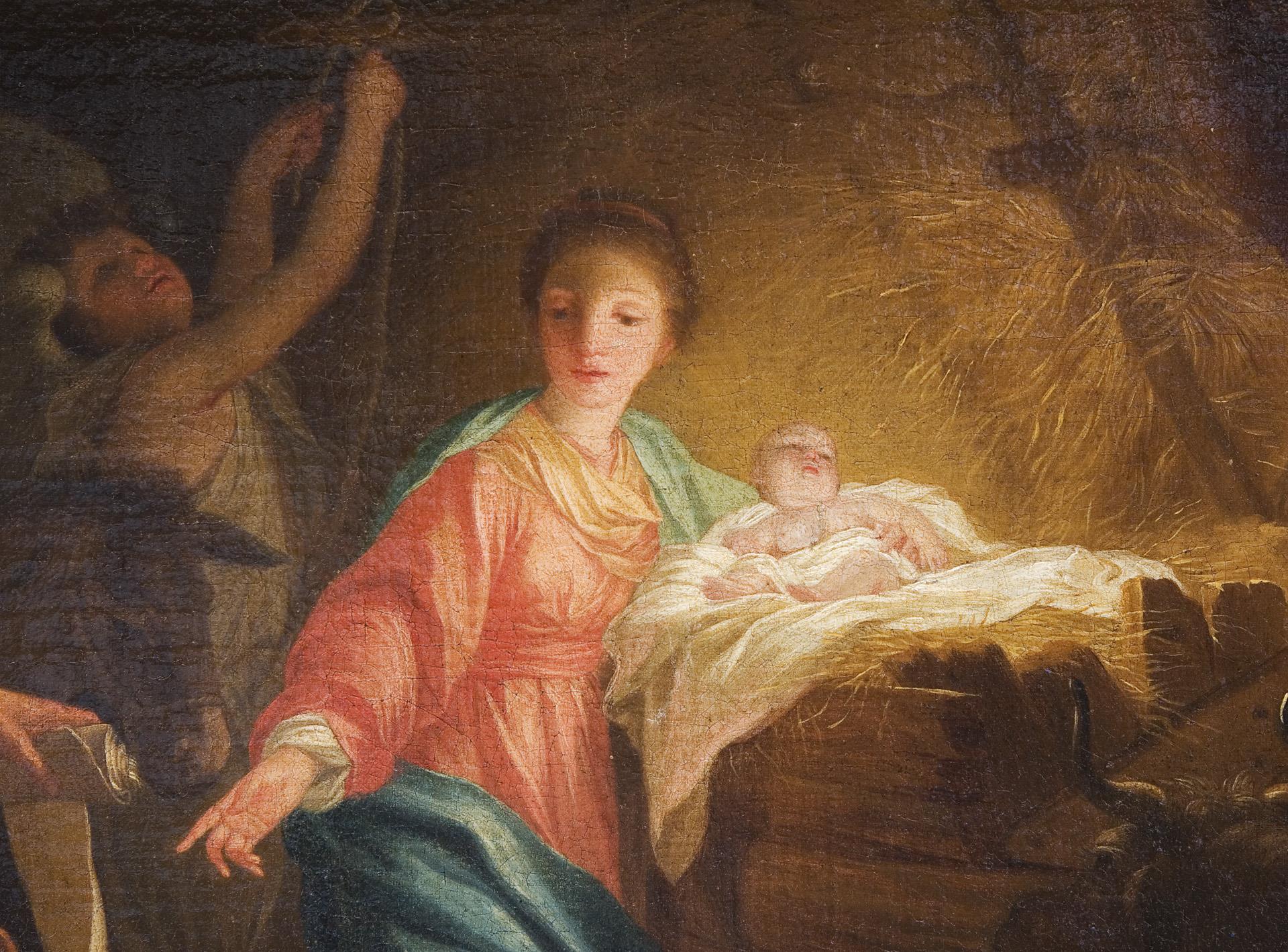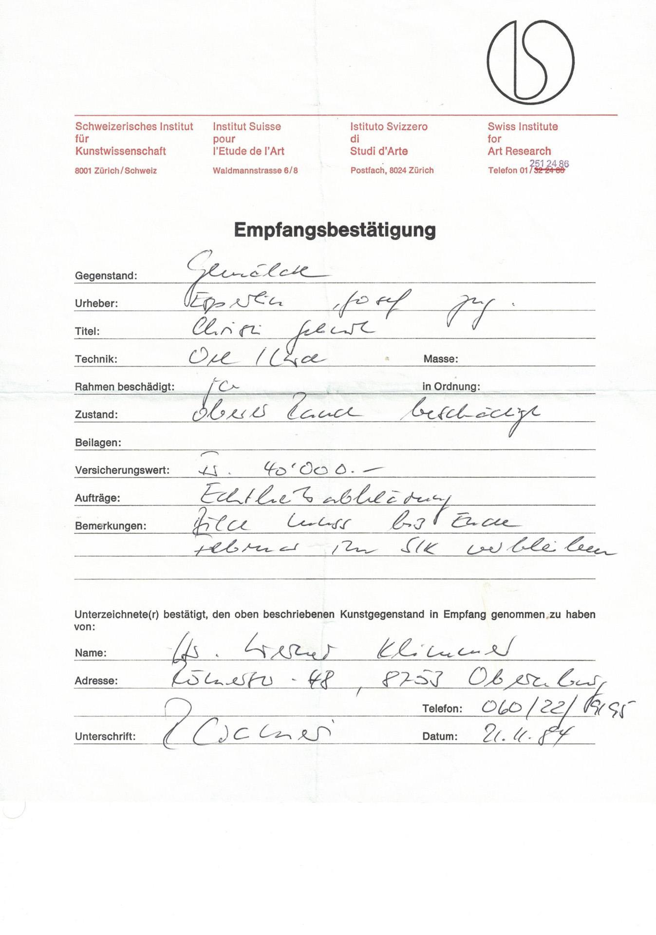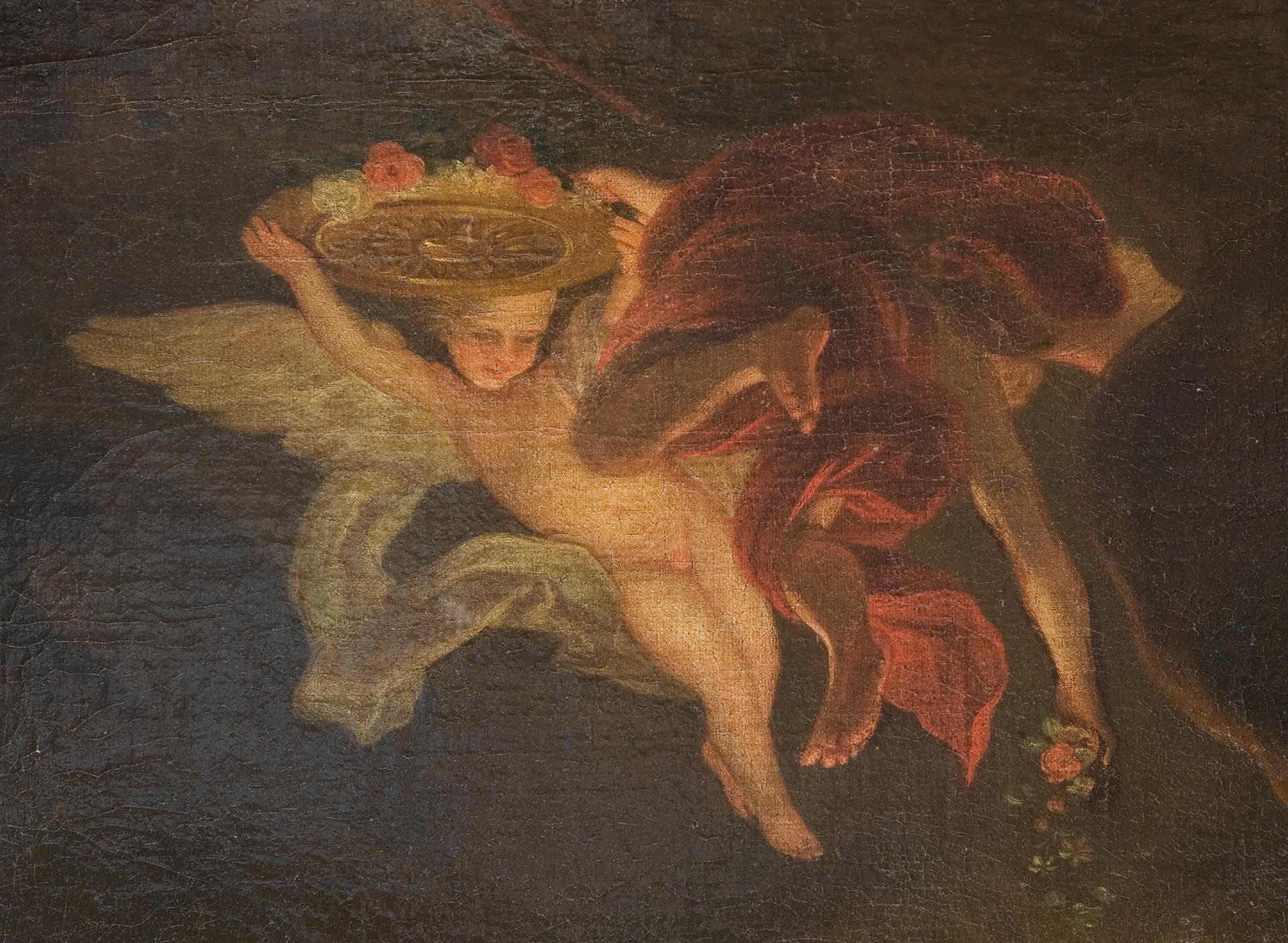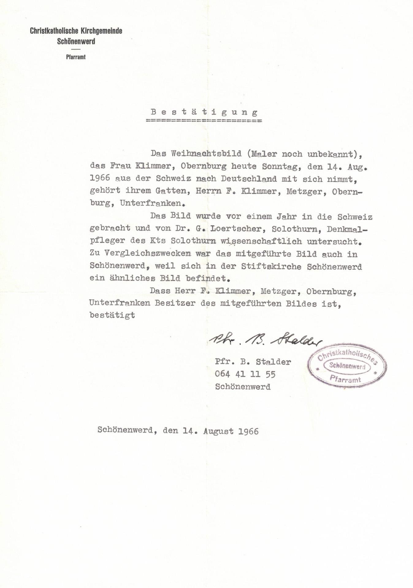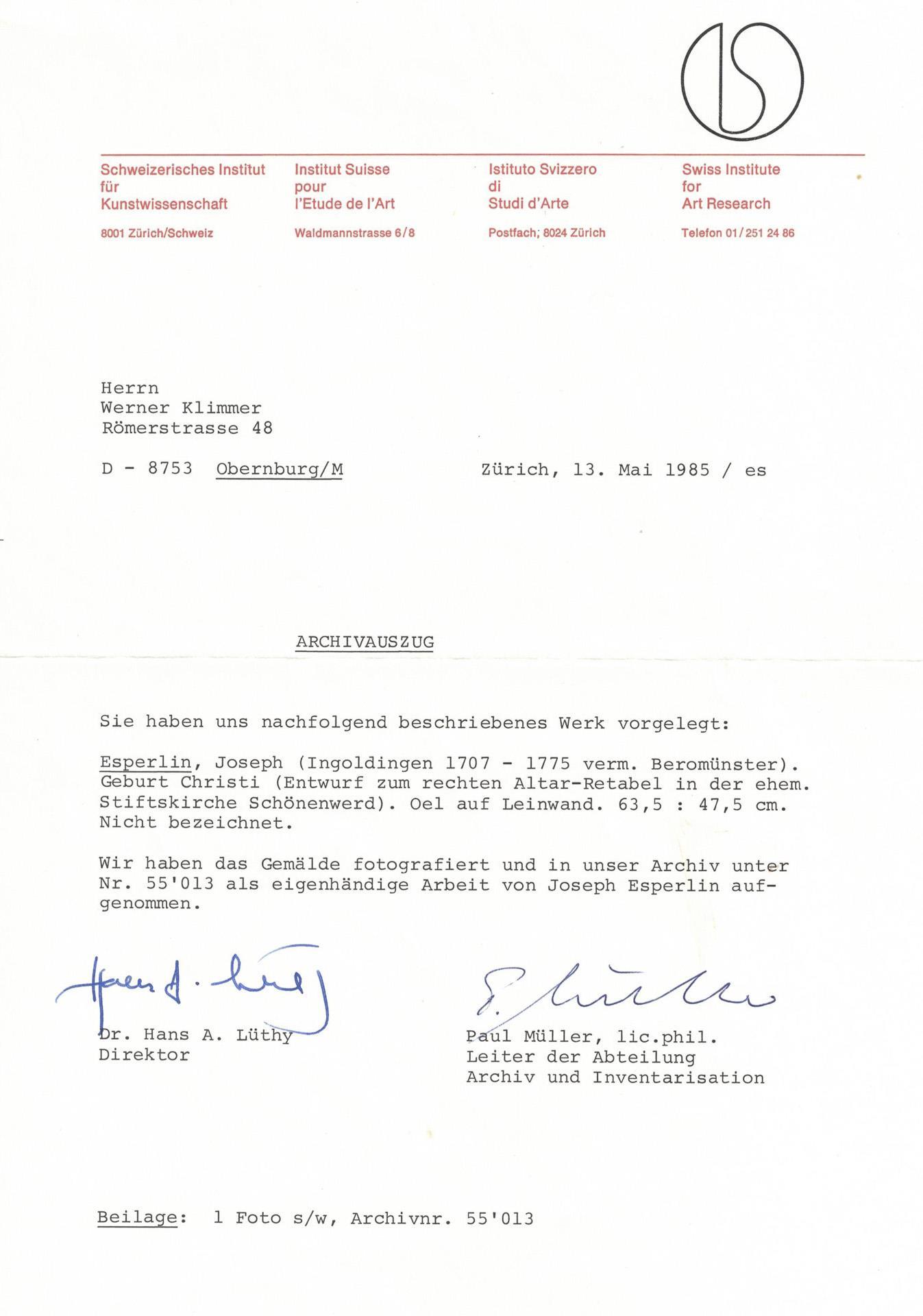 Das Gemälde ist eine verkleinerte Version des rechten Seitenaltars in der Stiftskirche Schönenwerd, 1774 gemalt, vermutlich eine Auftragsarbeit. Dabei originaler Schriftverkehr: Das Gemälde wurde 1965 in die Schweiz gebracht und von Dr. G. Loertscher, Solothurn, wissenschaftlich untersucht, mit Bestätigung vom Christkatholischen Pfarramt Schönenwerd, 14.08.1966. Schweizerisches Institut für Kunstwissenschaft: Empfangbestätigung zur Echtheitsprüfung, 21.11.1984. Antwortschreiben vom 12.05.1985, Archivauszug, 13.05.1985 "Wir haben das Gemälde fotografiert und in unser Archiv unter Nr. 55'013 als eigenhändige Arbeit von Joseph Esperlin aufgenommen". Geschwärzter Profilrahmen. Partiell im Randbereich Farbabplatzer.