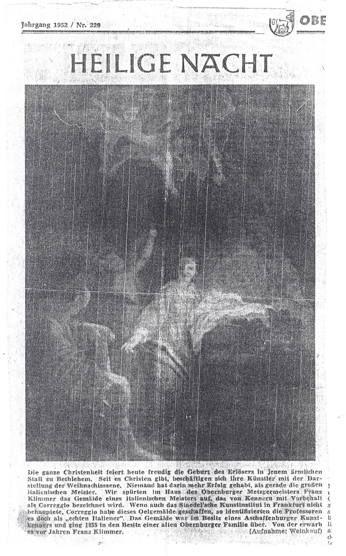 Provenienz : * Partnerauktion Bergmann * Das Gemälde war in Besitz eines Aschaffenburger Kunstkenners, ging 1855 in den Besitz einer alten Obernburger Familie über, von der Erwarb es der Metzgermeister Franz Krimmer vor 1952. Der Original-Zeitungsartikel von 1952 dazu liegt vor.