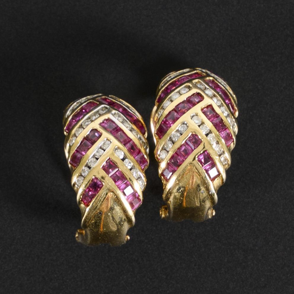 Paar Ohrclips mit im Zopfmuster gearbeiteten Bänderungen aus Rubinen und Brillanten.