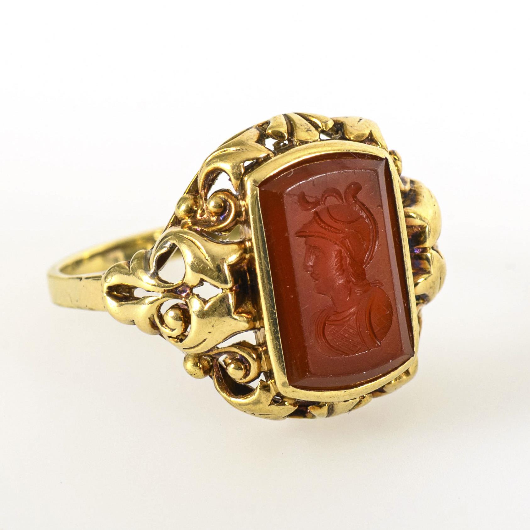 Ring mit Karneolgemme, einen antikisierenden Kopf im Profil zeigend, in einem aufwändig ausgestalteten Ringkopf.