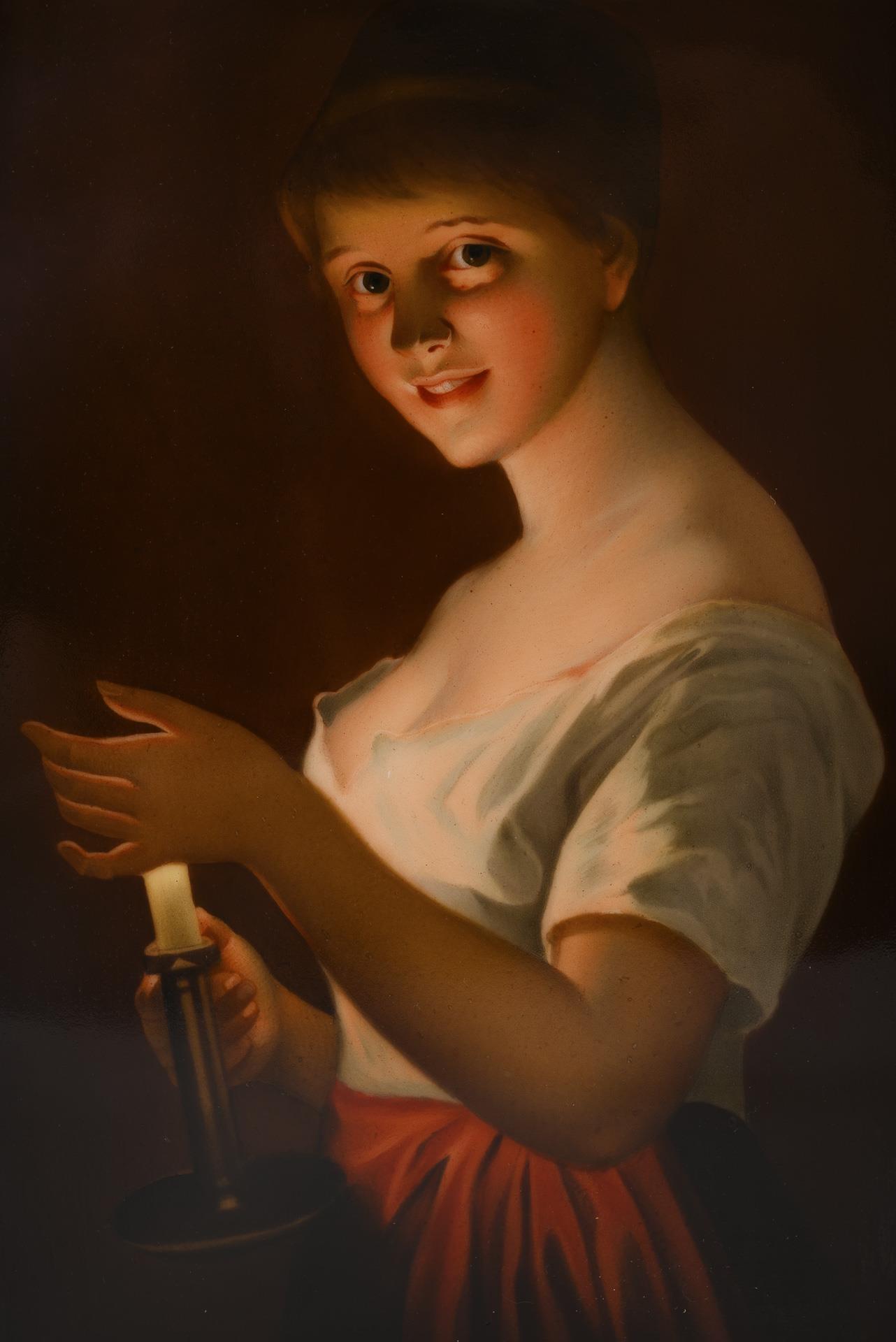 Rechteckige Platte mit der Darstellung einer jungen Frau im Nachtgewand, die Hand schützend vor ein Kerzenlicht haltend, nach einem Gemälde des Malers Georg Hom (1838-1911).