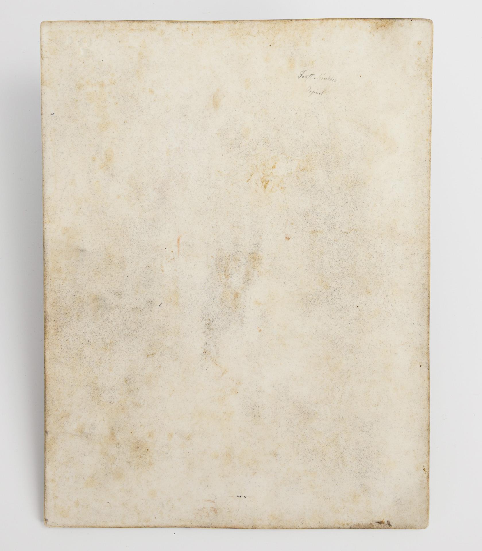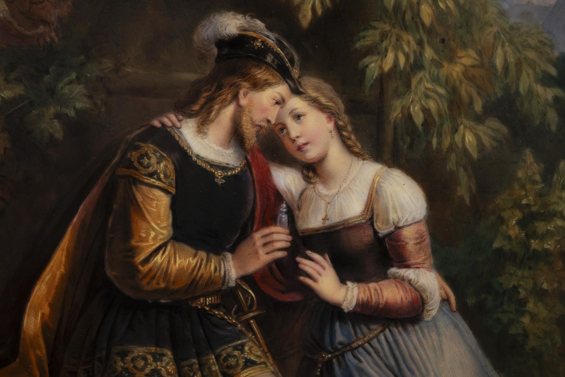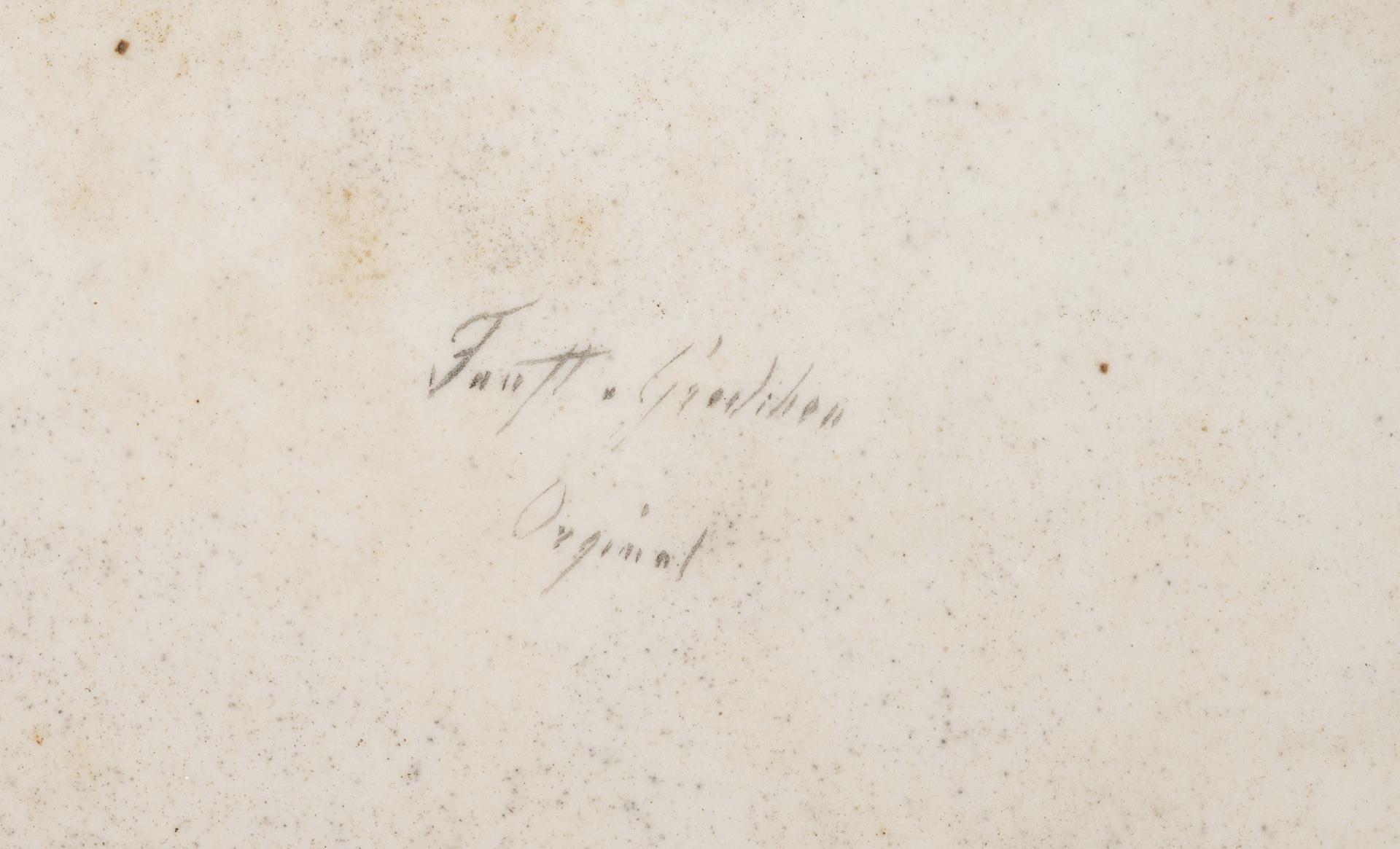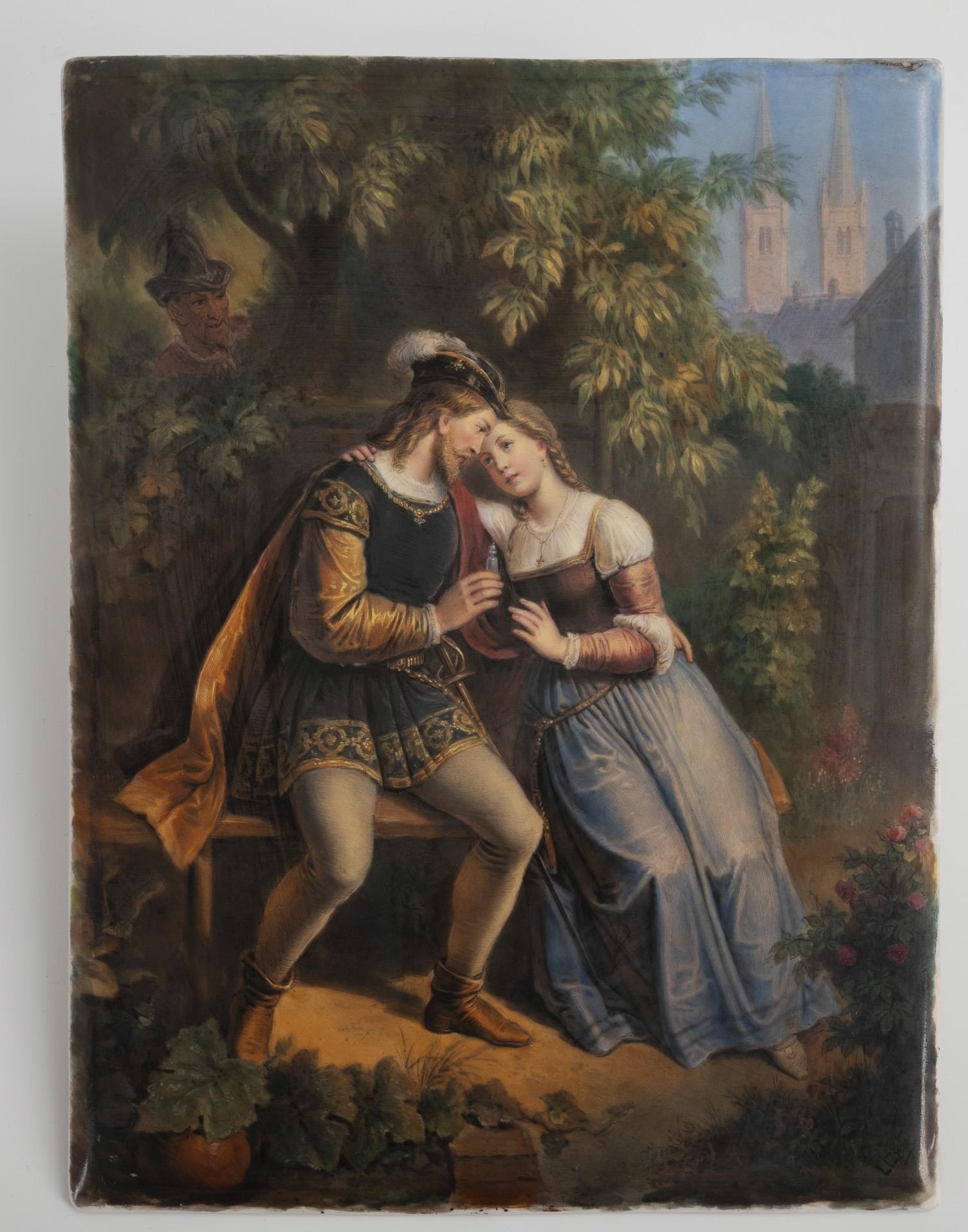 Rechteckige Platte mit der verso bezeichneten Darstellung des in einem Garten sitzenden Paares, Faust dem Gretchen den Schlaftrunk reichend, Darstellung nach der Tragödie "Faust" von Johann Wolfgang von Goethe (1749-1832).