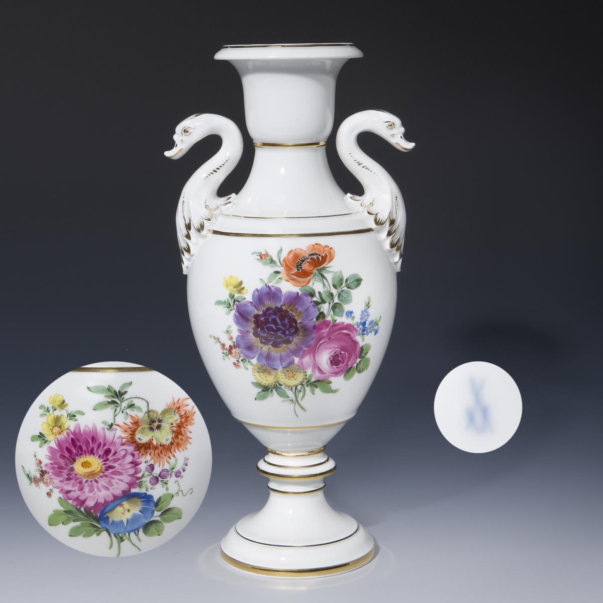 Balusterkorpus mit seitlichen Schwanenhals-Handhaben über montiertem Rundfuß. Beidseits farbige florale Bemalung, Goldstaffage. Pressmarke, Ritzmarke, Schwertermarke 1. Wahl.