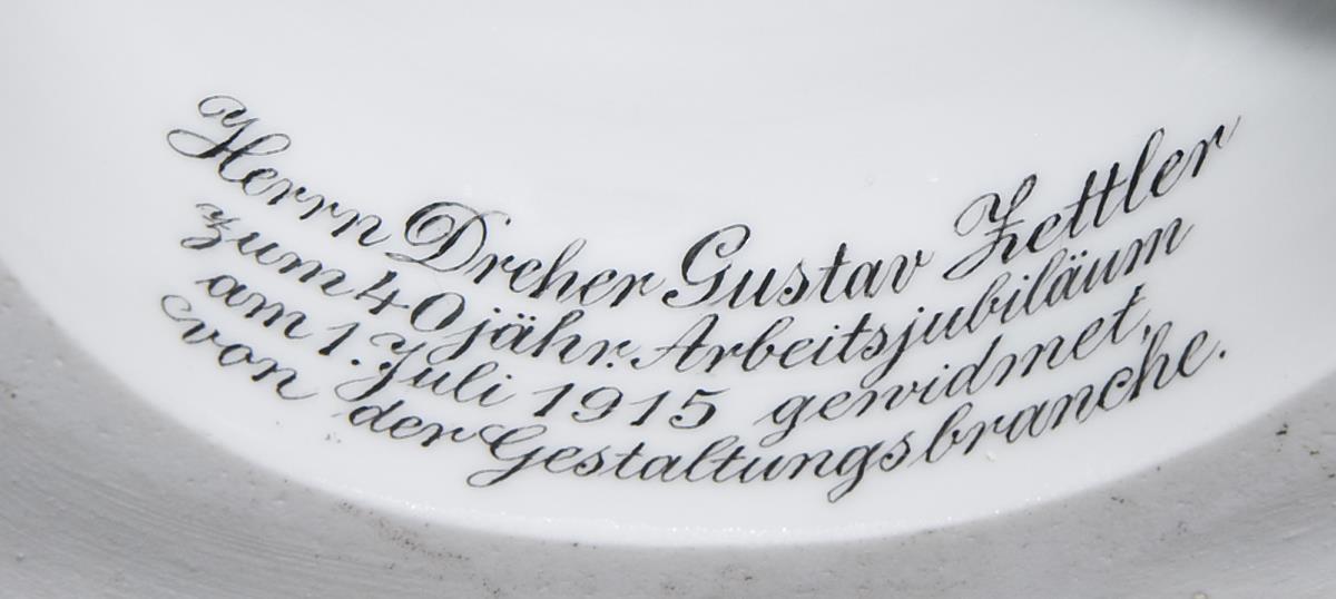 Balusterkorpus mit seitlichen Voluten-Handhaben über montiertem Standfuß. Beidseits farbige florale Bemalung nach Eduard Braunsdorf, Goldstaffage. Datierte Widmung an den Dreher Gustav Zettler zum 40-jährigen Manufaktur-Jubiläum. Pressmarke, Ritzmarke, Schwertermarke zweimal gestrichen.