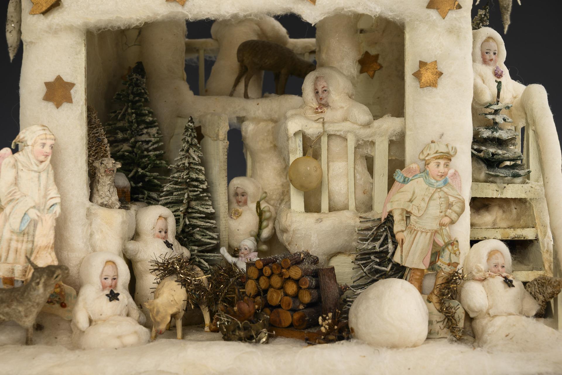 Weihnachtshütte mit Wattekindern.