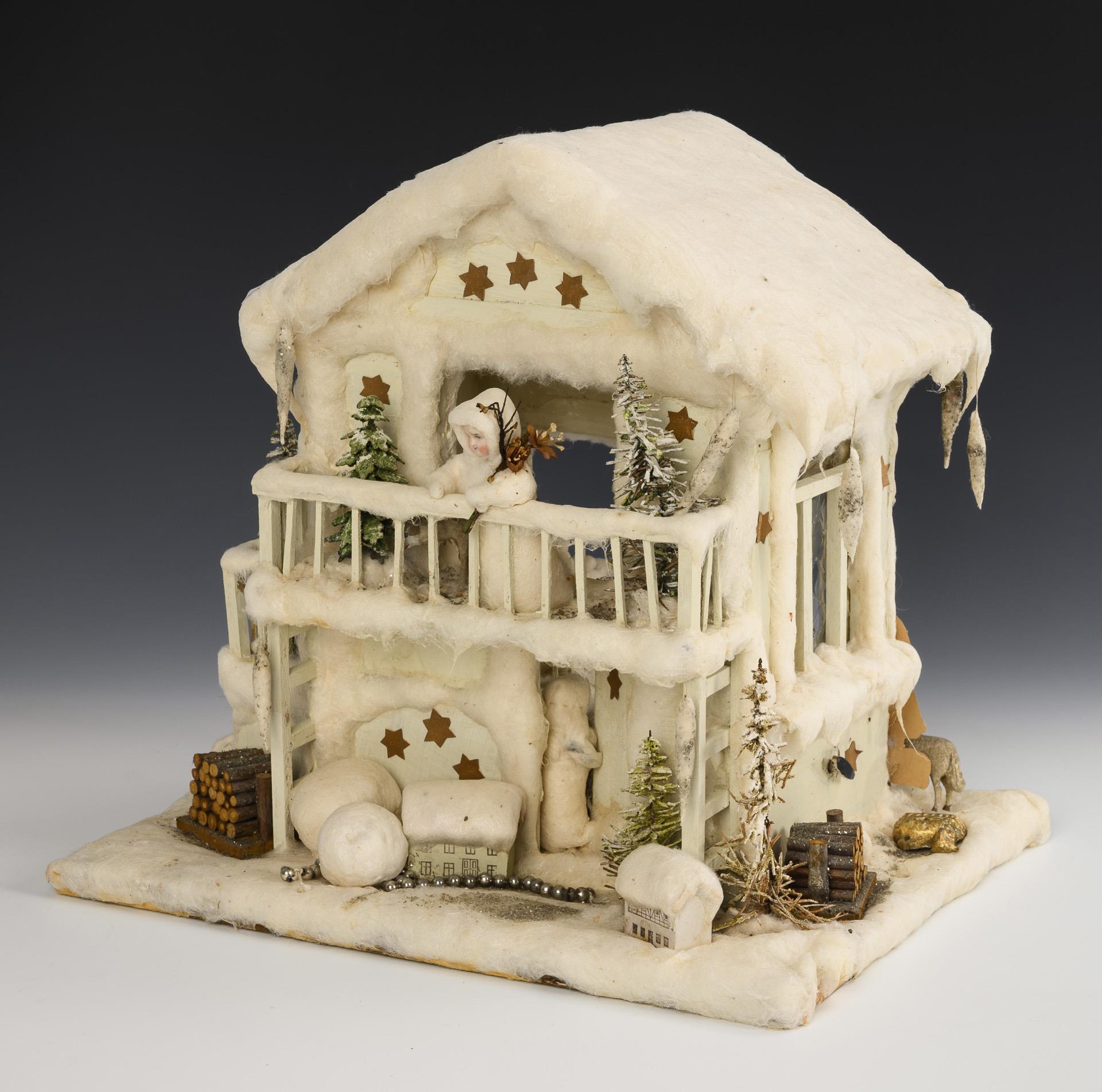 Kleines "schneebedecktes" Häuschen mit hängenden Eiszapfen, Bäumchen, 3 Schafen und mehreren Kinderfiguren. Kleine Defekte.