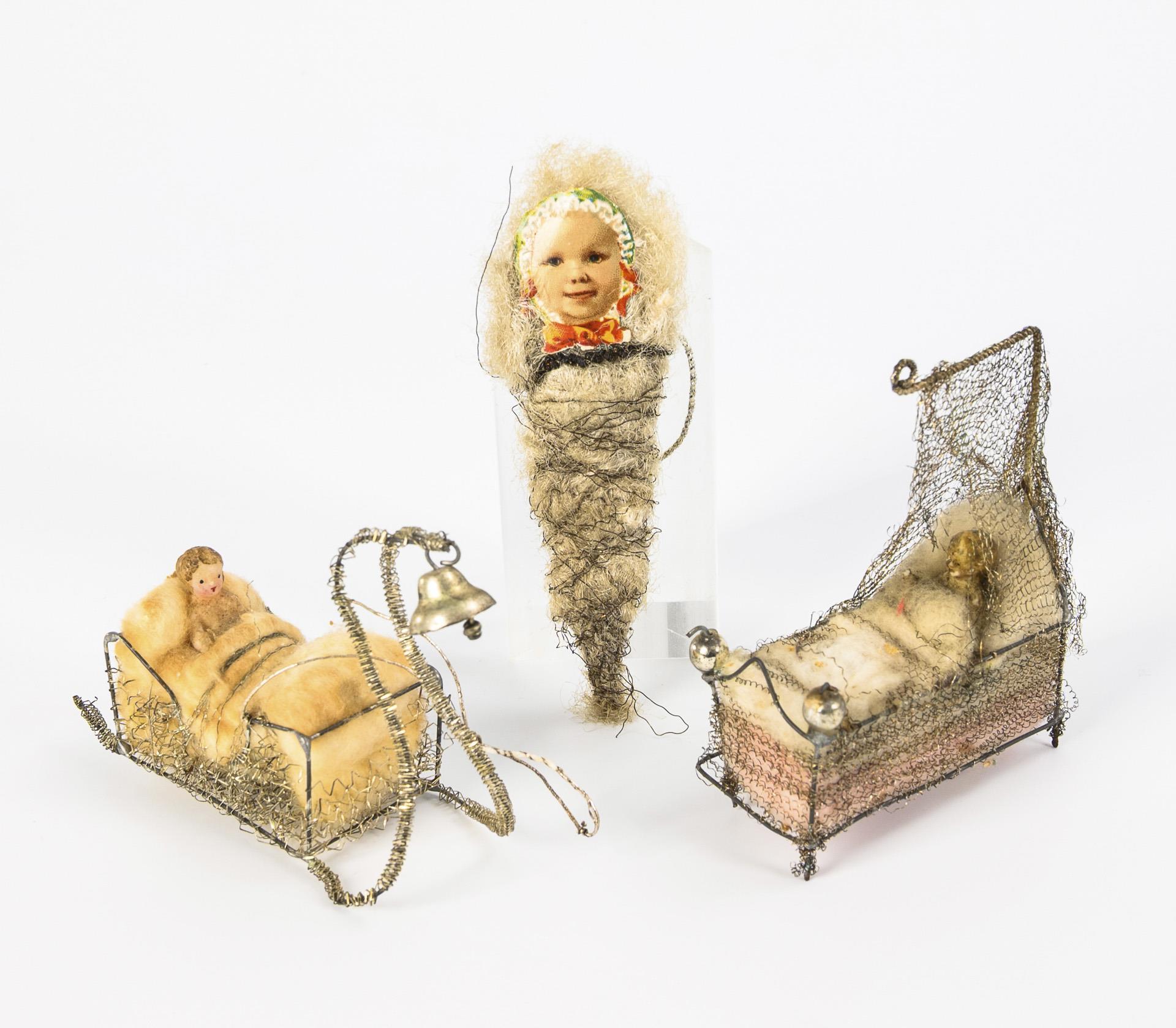 Für den Weihnachtsbaum. Schlitten, Bettchen und Wickelkind. Teils kleine Defekte.