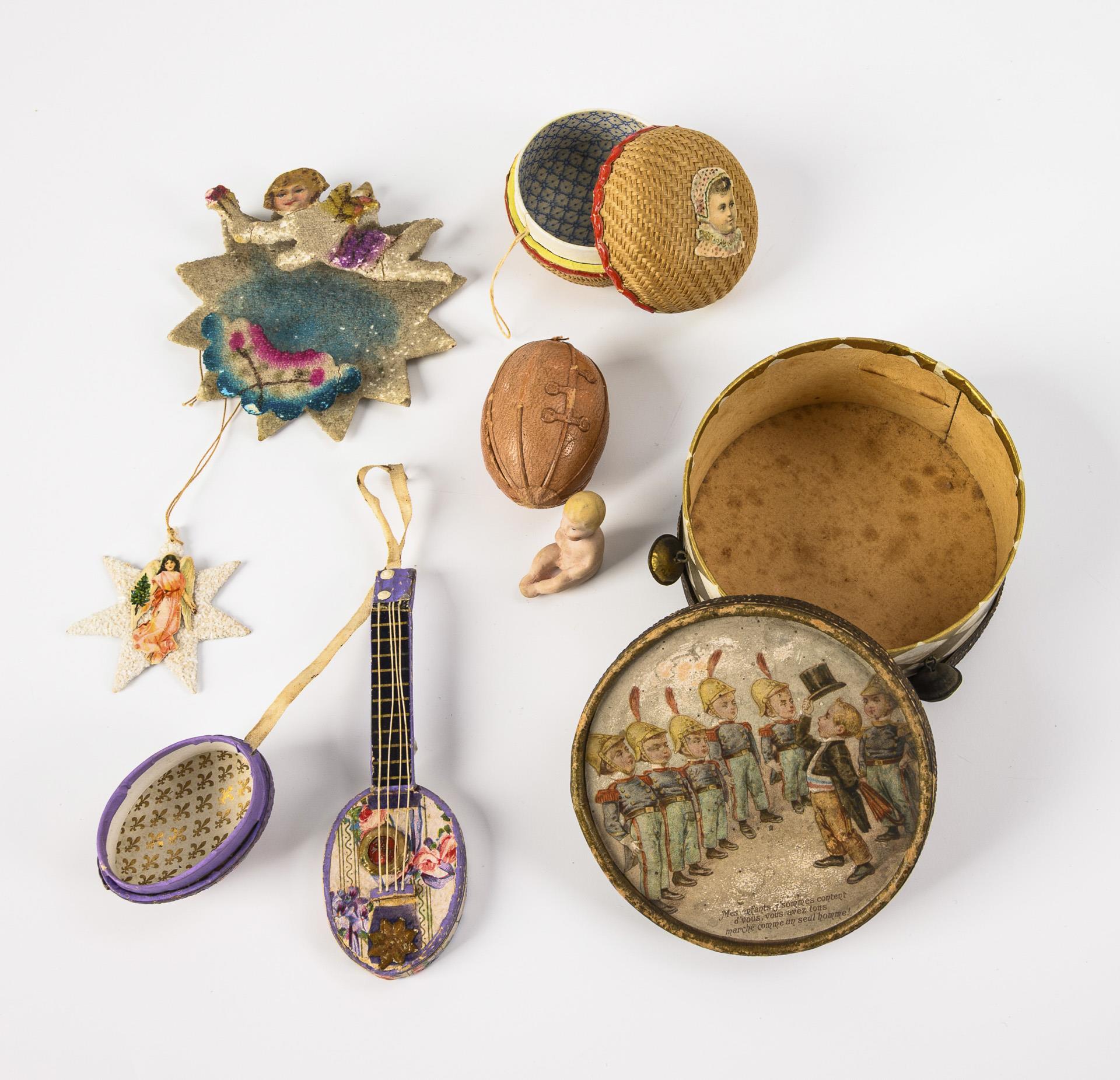 Ca. 14 Teile für den Weihnachtsbaum. Darunter 6 Bastkörbchen, Trommel, Pappfigur, Krippe etc. Altersspuren, kleine Defekte.