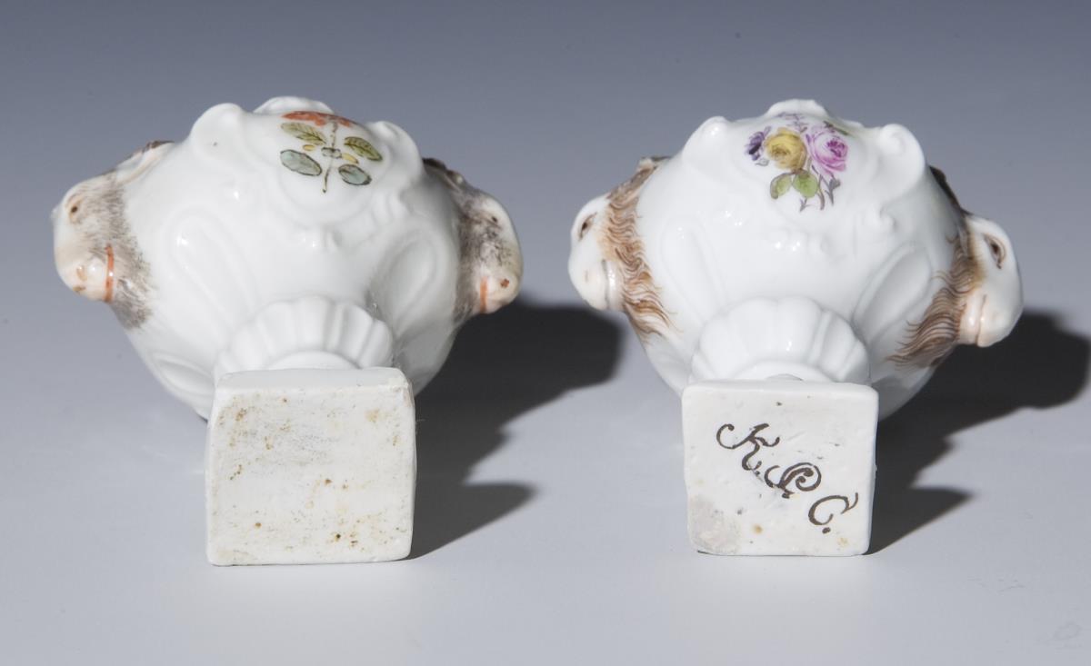 Reliefiert, beidseits farbige Blumenbemalung. Seitlich naturalistisch bemalte Widderköpfe. Unglasierte Böden, eine schwarze Bodenmarke K. P. C. (Königliche Pillnitzer Conditorei). Je Mündungsrand und Standfuß an kleinen Ecken alt restauriert.