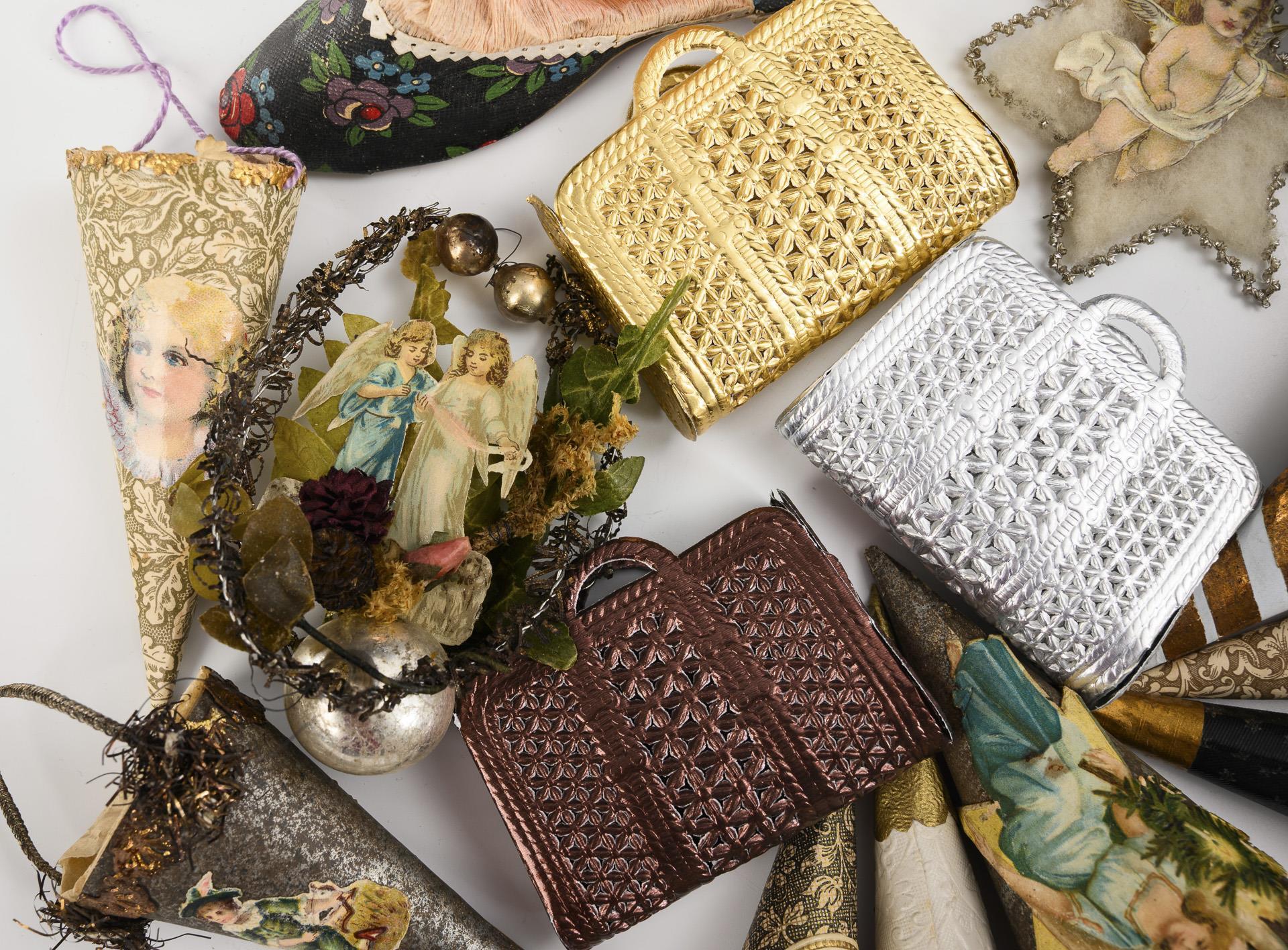 Für den Weihnachtsbaum. 8 kleine Zuckertüten, 1 Pantoffel, 4 Handtaschen, dazu 1 Baumanhänger und 1 Wattestern mit Oblaten.