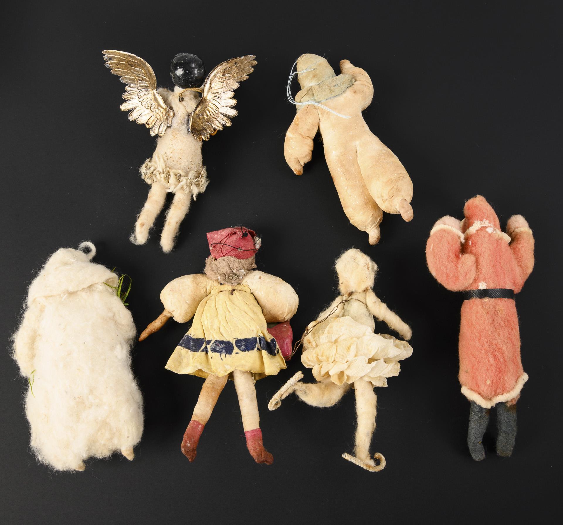 Für den Weihnachtsbaum. Verschiedene Figuren, darunter Weihnachtsmann, Engel, Schlittschuhläuferin etc. Altersspuren, kleine Defekte.