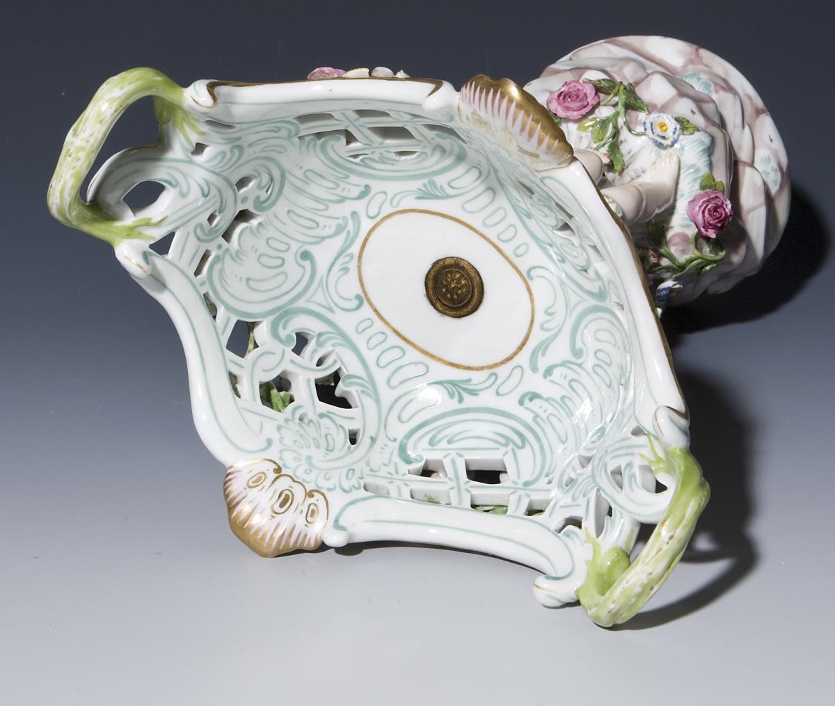 Die durchbrochen gearbeitete Schale und Sockel umlaufend mit plastisch aufgelegten Blütenzweigen. Figurenschaft mit Amoretten auf Fels-Sockel. Farbig bemalt, gold staffiert. Ritzmarke, Malermarke, Schwertermarke 1. Wahl. Einige Blüten, Blätter bestoßen.