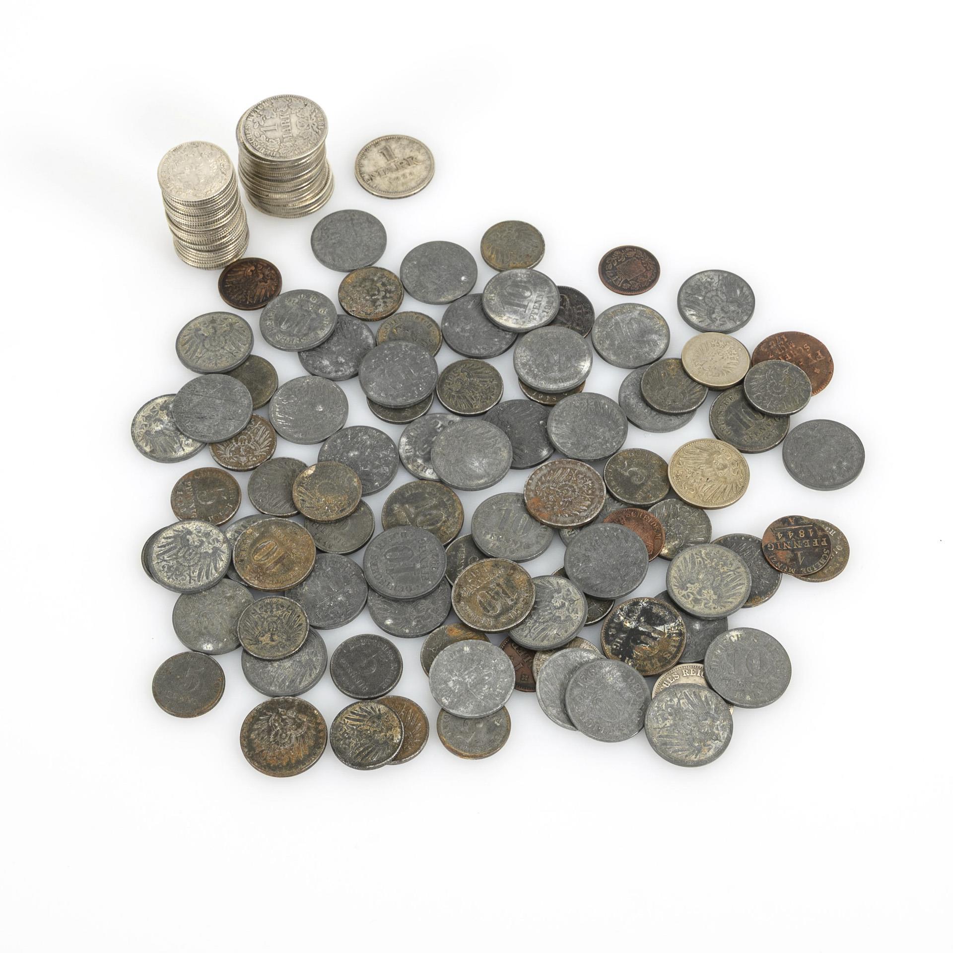 "1Pfennig F.S.E. Obervl Muntz 1755" Friedrich III. von Gotha Altenburg / "1 Pfennig Scheidemunz 1769" Mainz Erzbistum, Erfurt / "Scheide Münze 1 Pfennig 1844" Münzort A, Fürstehnthum Reuss Lobenstein Ebersdorf / "Scheidemünze 1 Pfennig 1863" Bayern, Maximilian II. Joseph / "1 Heller 1865", "Scheidemünze D. Fr. St. Frankfurt" / "1 Pfennig 1863" Münzort B, "Scheide M. H.S. Altenb." / "5 Pfg. Stadt- und Landkreis Bonn.Siegkreis" 1918, mit Brückendarstellung. / 19x 1 Mark, aus den Jahren und Münzorten: 1874 A, 1875 A, 1878 J, 1880 A, 1900 A, 1904 A, 1905 A, 1906 A, 1908 G, 1910 A, 1914 A, 1915 A und E. / 30x 1/2 Mark, aus den Jahren und Münzorten: 1903 A, 1905 A D, 1906 A F D, 1907 D, 1909 G, 1914 A J, 1915 ADFG, 1916 A D G, 1917 A, 1918 F. / 1 Mark 1924 Münzort A, Weimarer Republik. / 47x 10 Pfennig von 1916 - 1922 / 29x 5 Pfennig von 1915 - 1922 / 50 Pfennig 1876, Münzort A / 10 Pfennig 1901 Münzort A / 2x 5 Pfennig 1875 und 1907 Münzort A B / 1 Kupferpfennig 1913, Münzort A. Zustand: meist sehr schön.