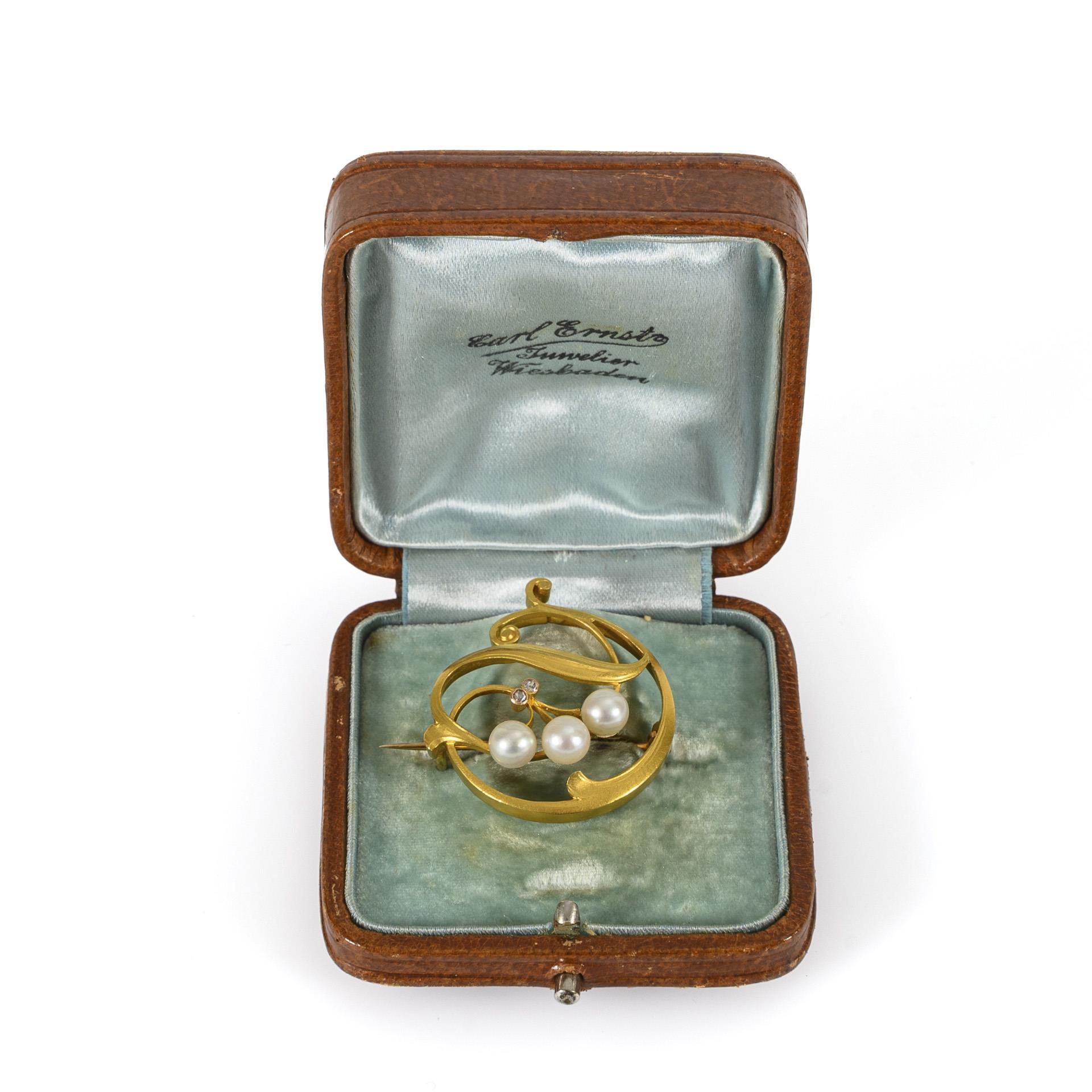 Brosche in Form von sich windendem Zweigwerk mit 3 Beeren repräsentierenden Perlen sowie 2 kleinen Diamanten im Rosenschliff mit zeittypischem einfachen Hakenverschluss.