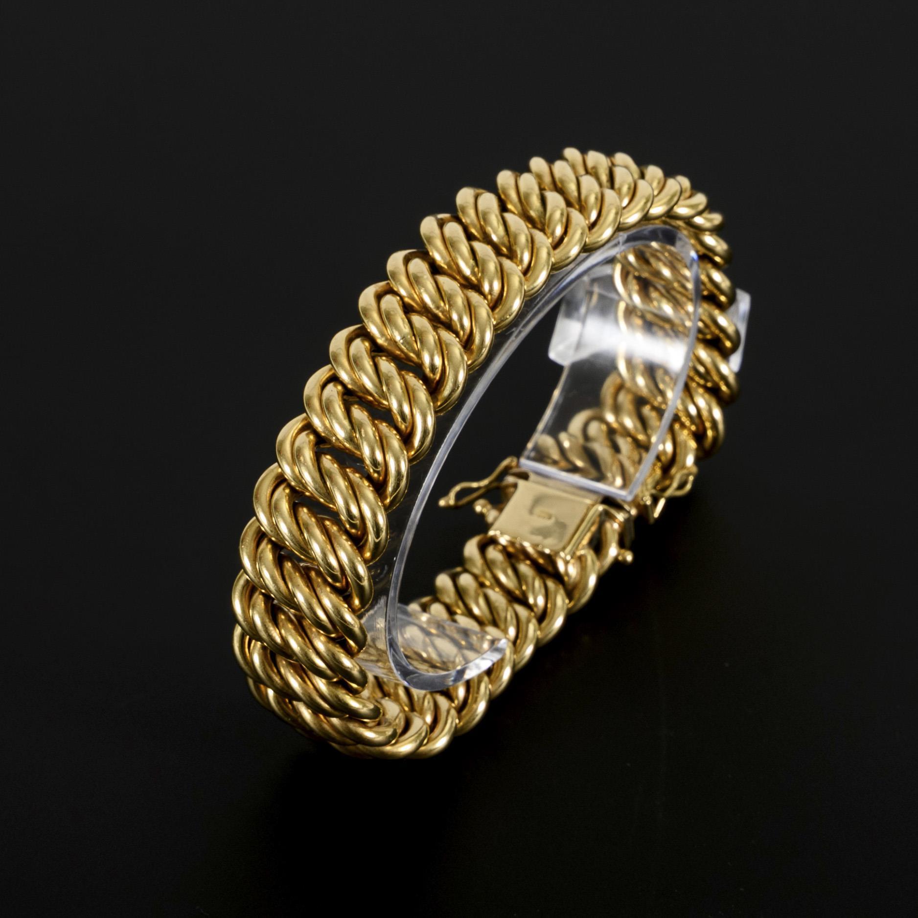 Breites Goldarmband als Doppelpanzerkette. Kastenschloss mit doppelter Achtersicherung. Verschlussmechanismus mit leichten Tragespuren.
