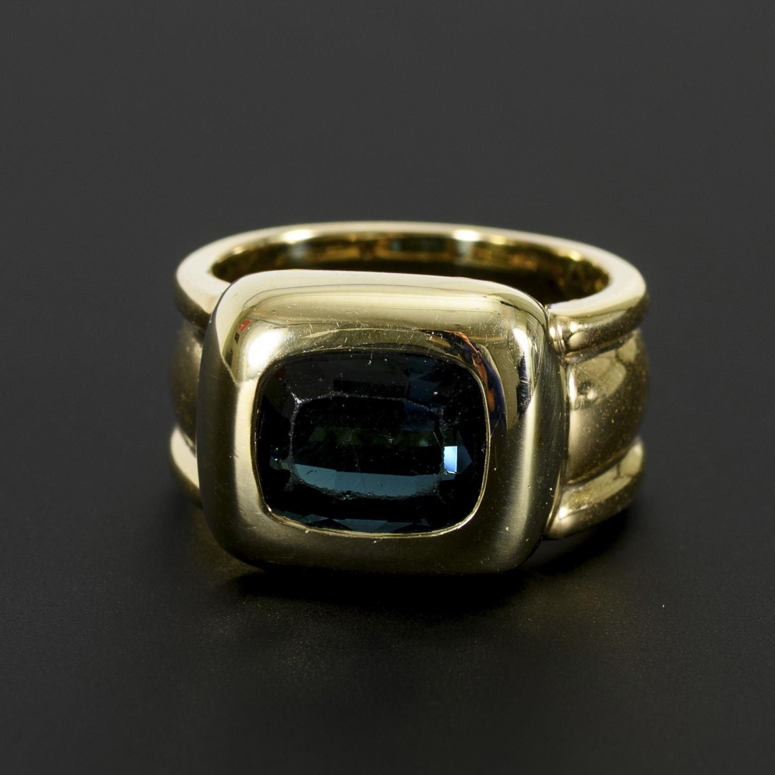 Gelbgold 585 gestempelt. Ringgröße 55, Breite max. 14.32 mm, der blaue Farbstein (in der Fassung gemessen) ca. 10,01 x 8,19 mm. 12,3 g.