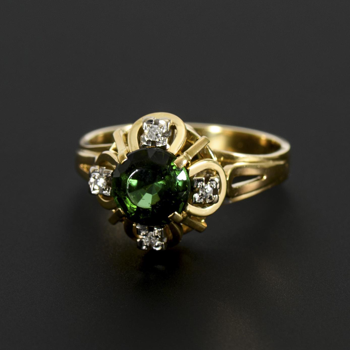 Ring mit rundfacettiertem grünen Farbstein, umgeben von 4 kleinen Achtkant-Diamanten. Der grüne Farbstein mit Tragespuren bzw. Bereibungen; dies erst unter zehnfacher Vergrößerung augenfällig.