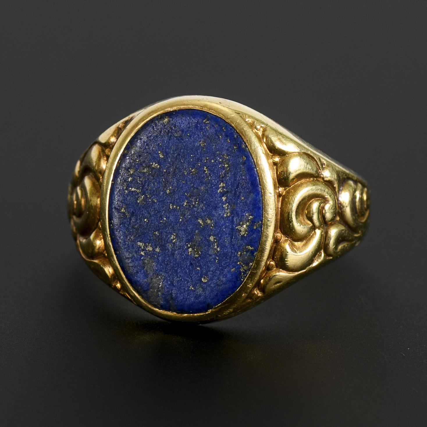 Älterer, großer Ring mit ovaler Lapis Lazuli-Tafel zwischen ornamental gestalteten Ringschultern. Tafel leicht berieben, leichte, altersgemäße Tragespuren.