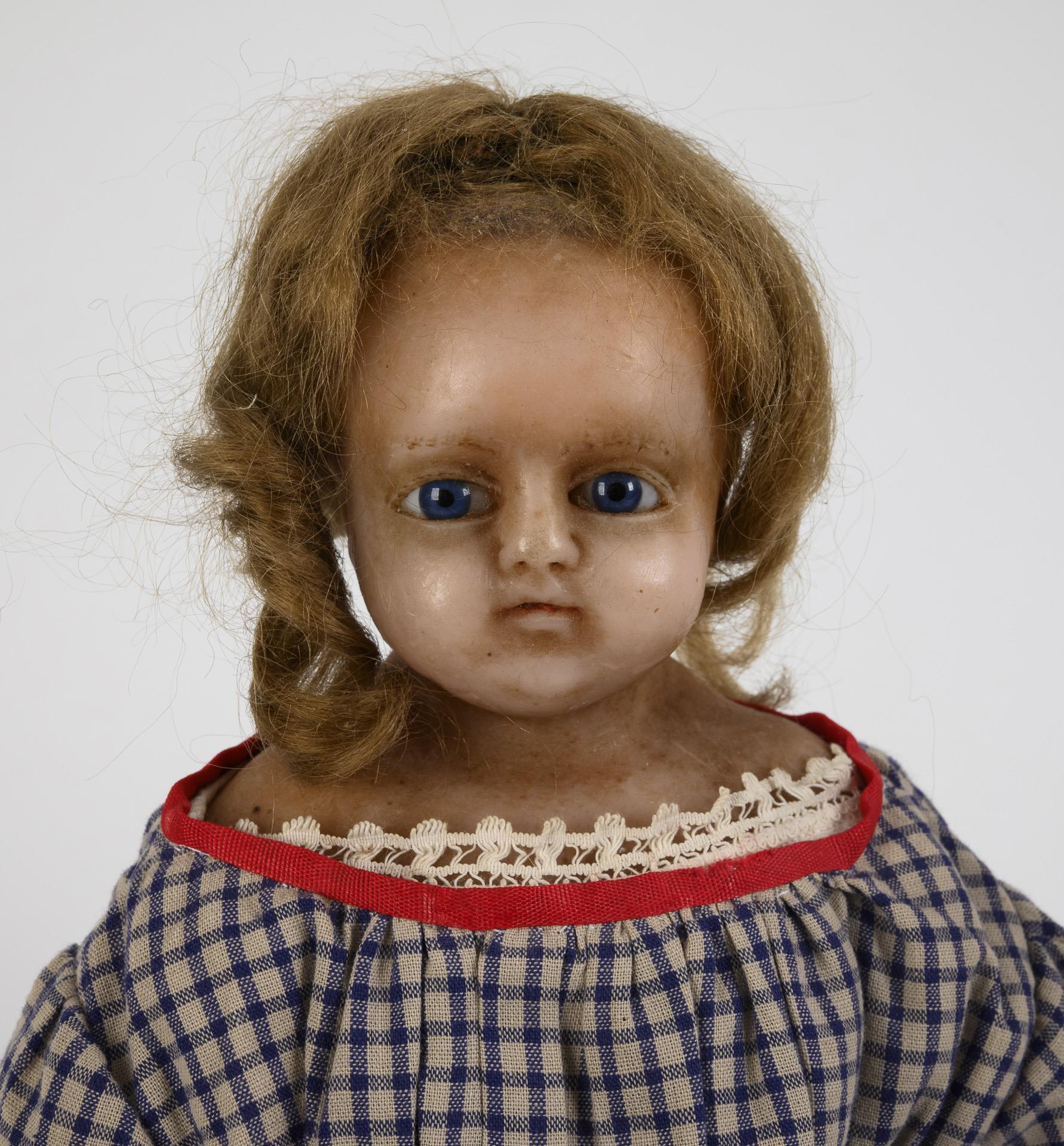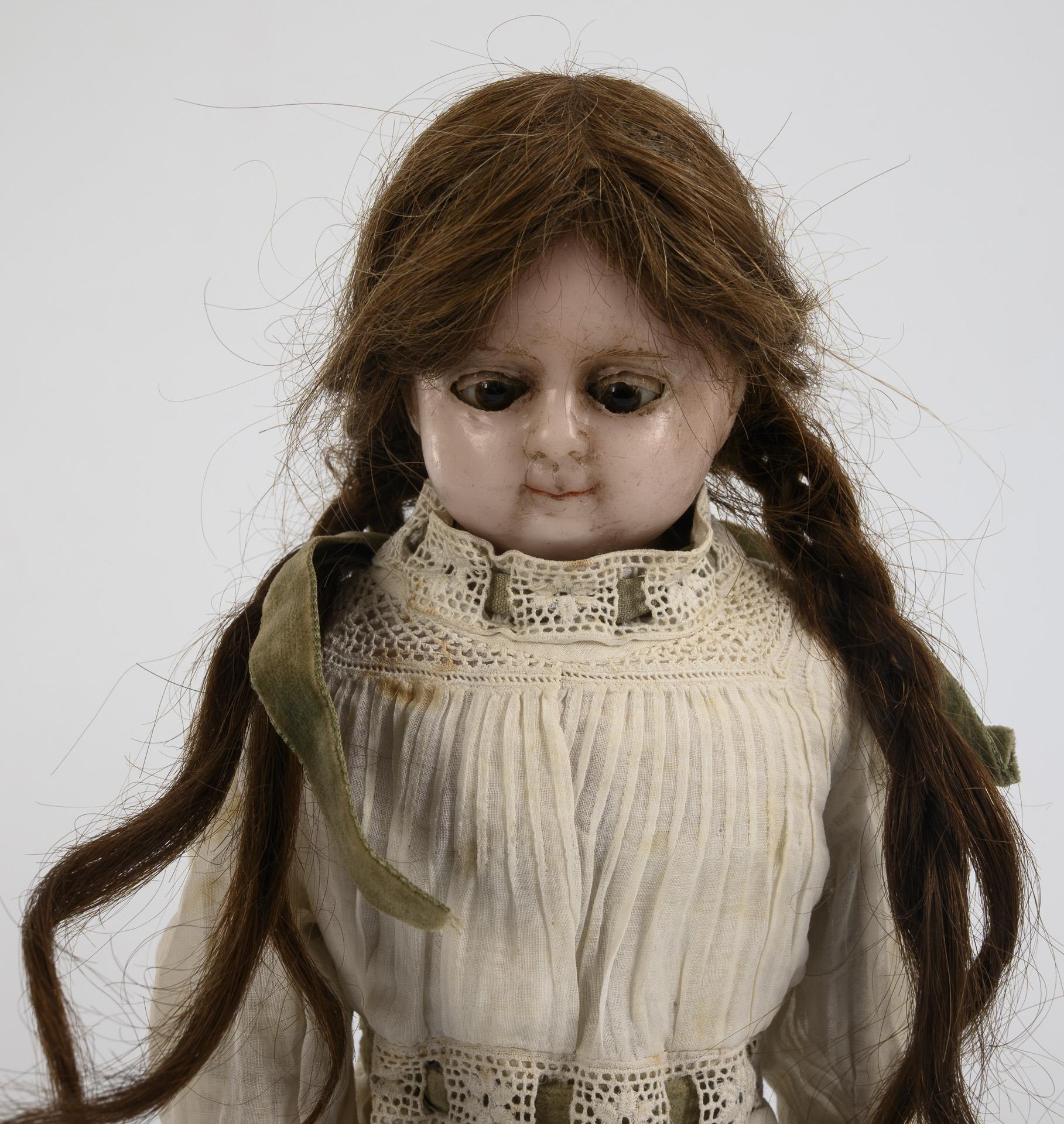 Alle mit festen Augen, geschlossenem Mund und Leder- bzw. Stoffkörper. 1x mit Wachsgliedern und kariertem Kleid. L 44 cm. / 1x mit Zöpfen, verschiedenen Biskuitarmen und weißem Kleid. 1 Hand defekt. L 44 cm. / 1x blond, mit Biskuitarmen und weißem Kleid. Kopf rissig. L 52 cm. Alle mit Altersspuren und kleinen Defekten.
