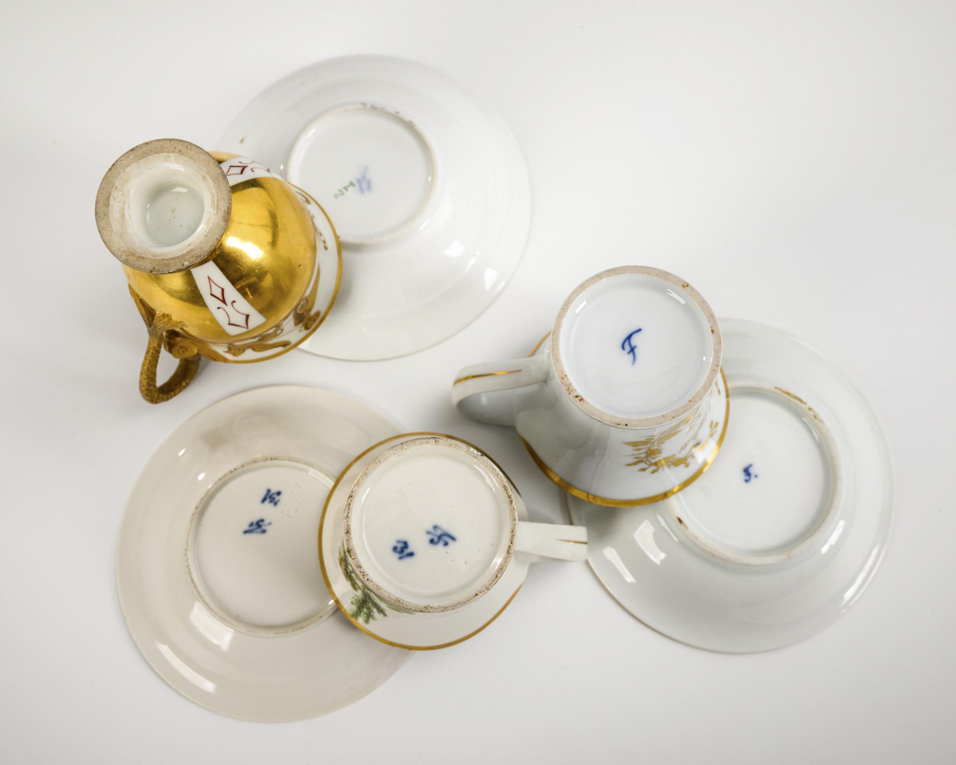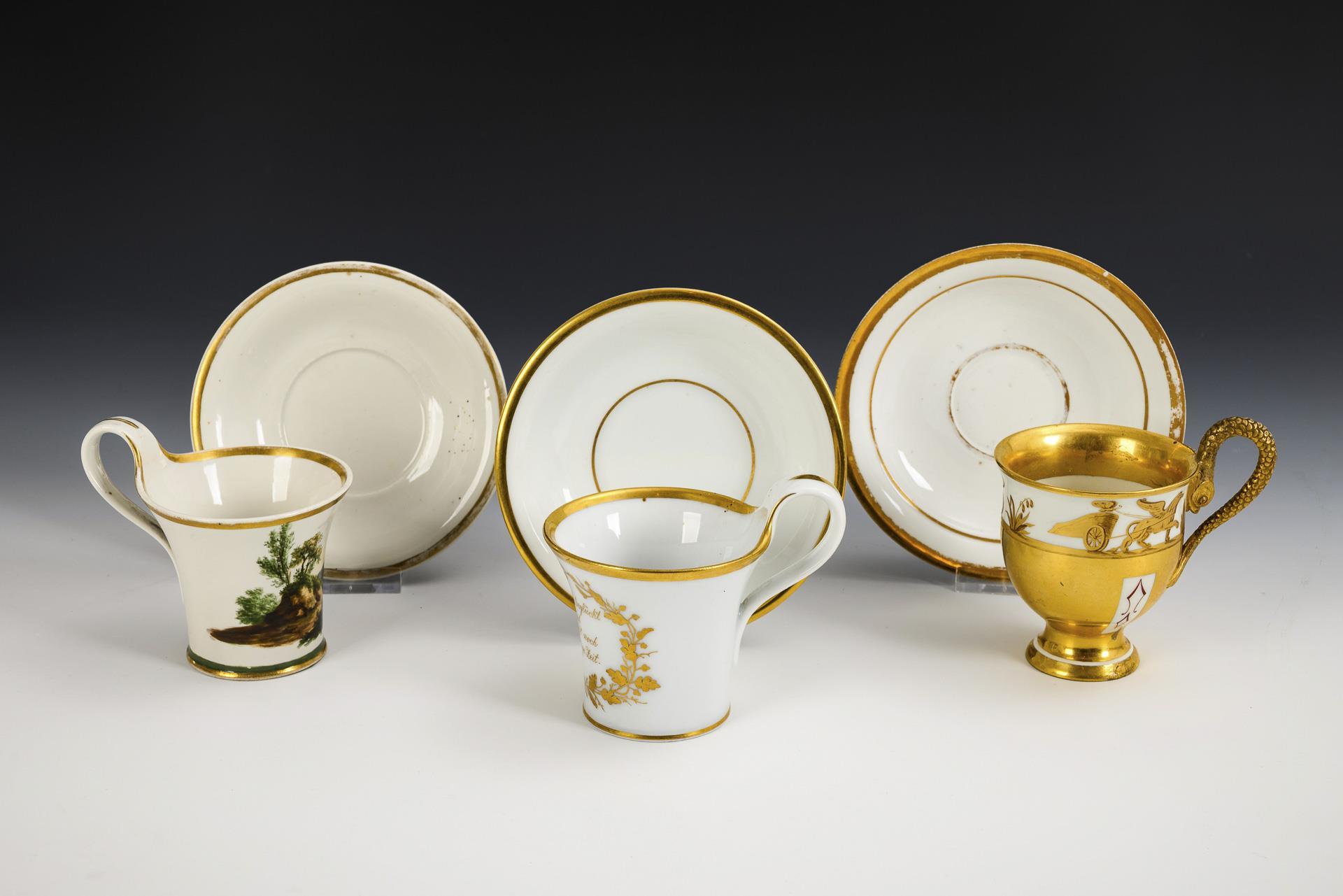 1x ungemarkt: gefußte Glockentasse mit Delfinhenkel und Goldmalrerei. / 2x Fürstenberg: konische Tasse mit Campanerhenkel und der goldenen Aufschrift "Was Dich heute beglückt und erfreut Bringe Dir oft noch die flüchtige Zeit." und konische Tasse mit Campanerhenkel und Landschaftsmalerei. Partieller Goldabrieb, 1x mit Haarrissspinne im Tassenboden, Haarriss im Delfinhenkel, 1x Restaurierung am Fußrand, 1x unterseitige Beschleifung am Untertassenrand.