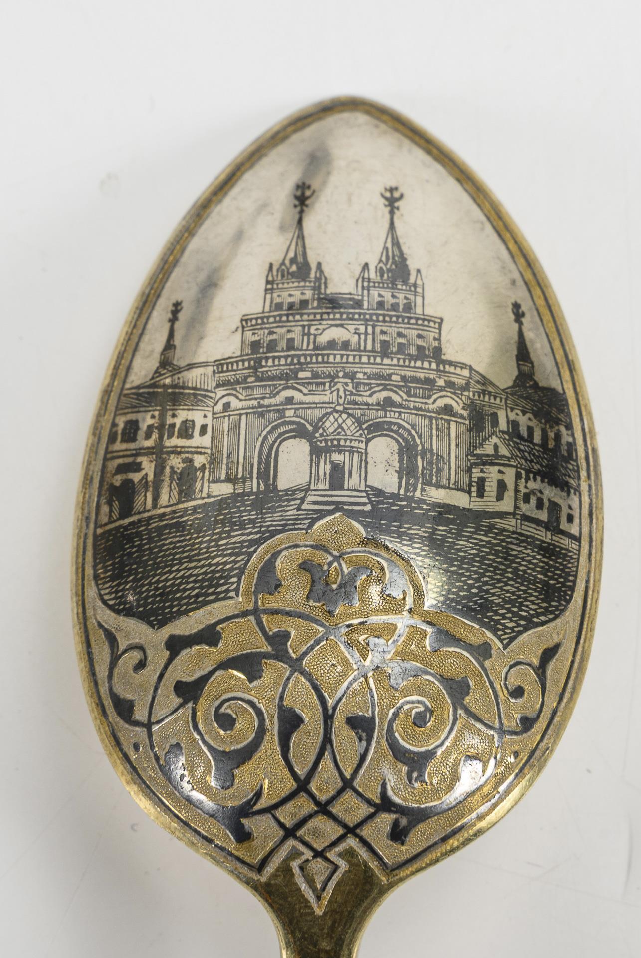 Vergoldete Silberlöffel mit Niello-Dekor, auf den Rückseiten der Laffen 3 verschiedene Darstellungen des Moskauer Kremls. Teils minimal berieben.
