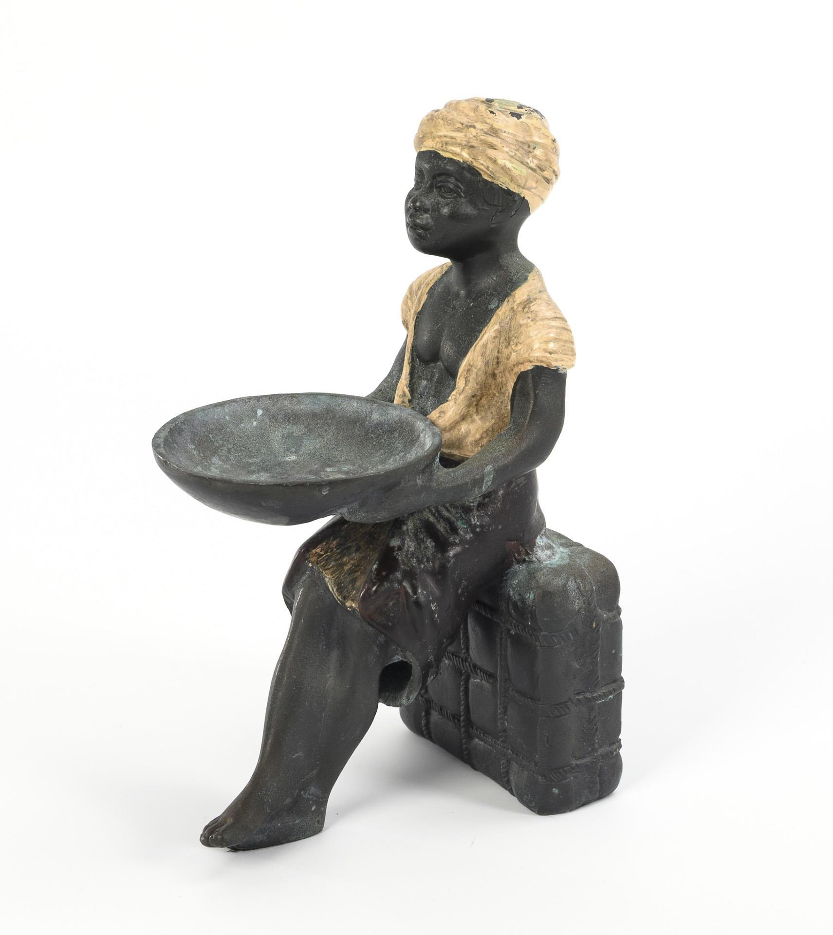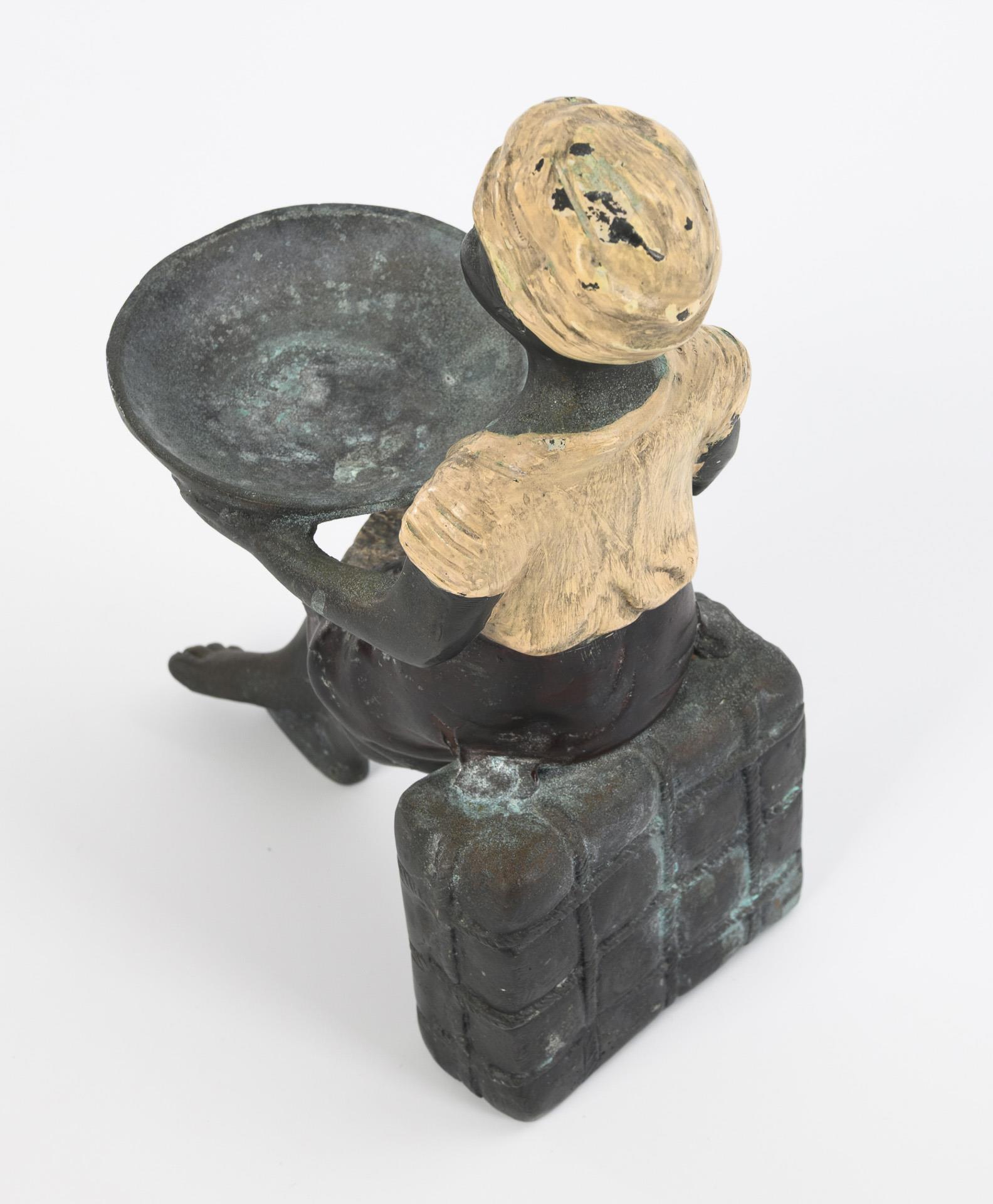 Auf einem senkrecht stehenden, verschnürten Paket sitzende Figur mit Turban, die eine Schale in den Händen hält. Patina vorwiegend in der Schale und an der Rückseite des Pakets fleckig (Grünspan), Fassung teils abgeplatzt.