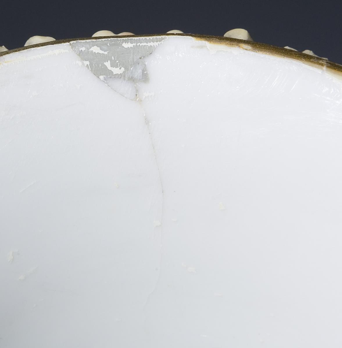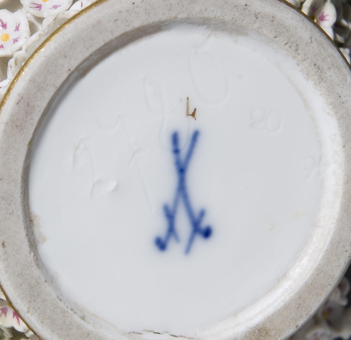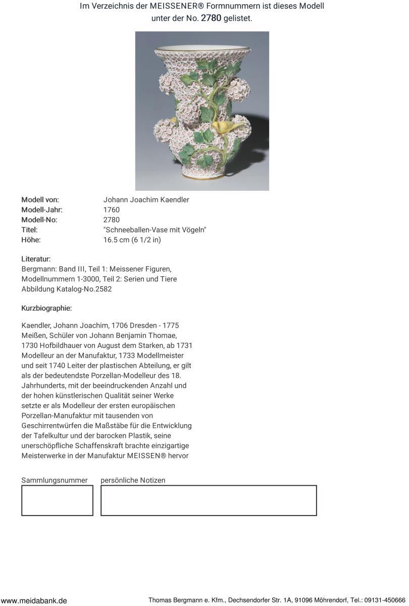 Modell von Johann Joachim Kaendler 1760. Die gesamte Oberfläche mit purpur-gelb staffierten Blüten belegt. Seitlich je drei Schneeballen. Beidseits plastisch aufgelegte Zweige mit je einem Vogel, naturalisch bemalt. Ritzmarke, Pressmarke, Malermarke, Schwertermarke 1. Wahl. Mündungsrand, Fußrand, Vögel partiell, Blätter restauriert.