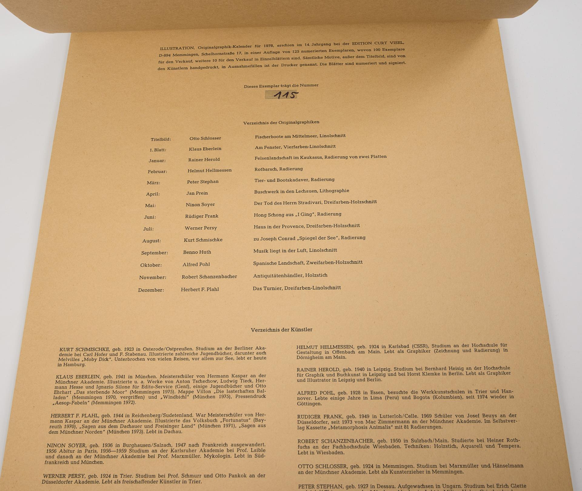 Limitierte Auflage von 125 nummerierten Exemplaren, hier Nummer 115. Alle Blätter handsigniert und nummeriert. 14 Originalgraphiken von Klaus Eberlein, Alfred Pohl, Otto Schlosser, Rainer Herold, Helmut Hellmessen, Peter Stephan, Jan Prein, Ninon Soyer, Rüdiger Frank, Werner Persy, Benno Huth, Kurt Schmischke, Robert Schanzenbacher und Herbert F. Plahl. Blätter auf Kalendarium geheftet, Deckfolie etwas verbogen.