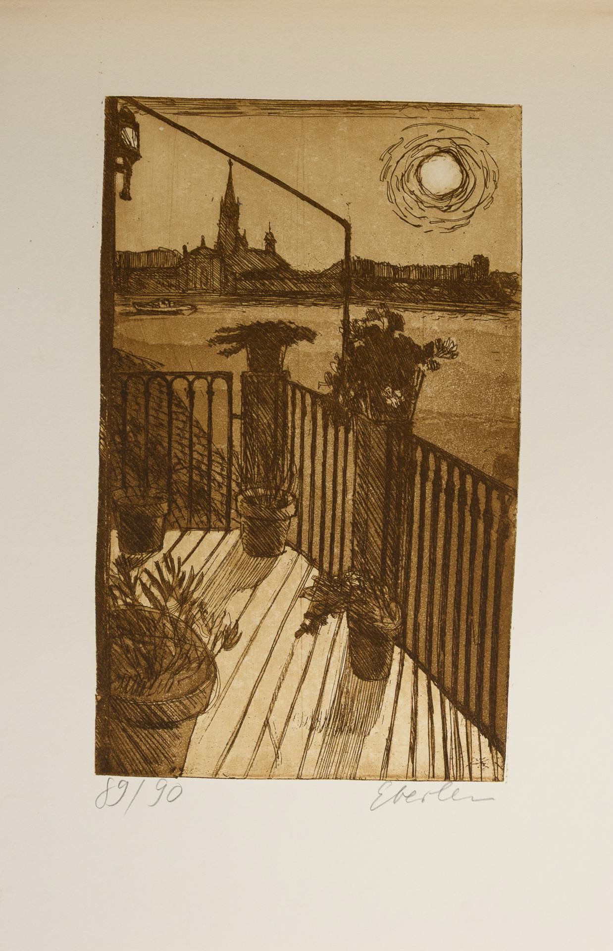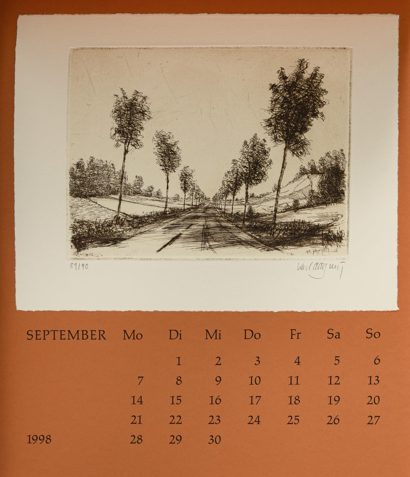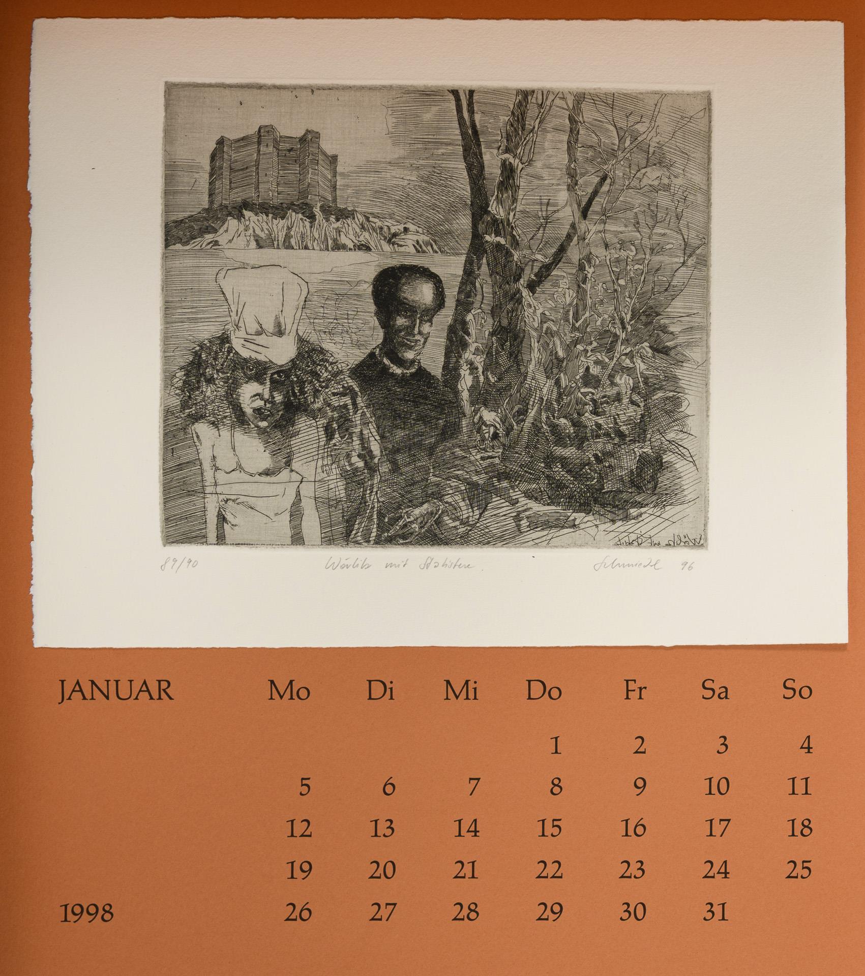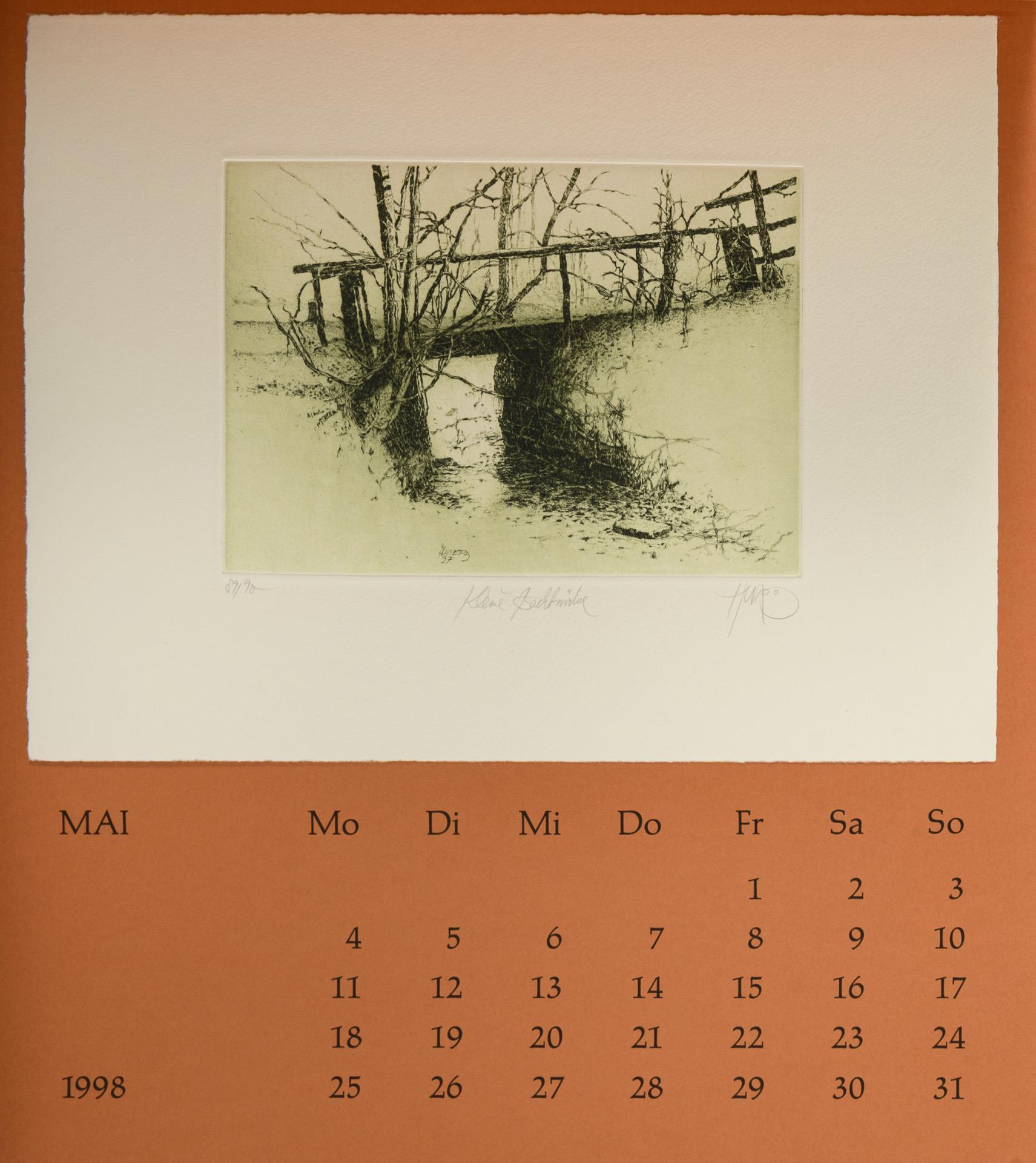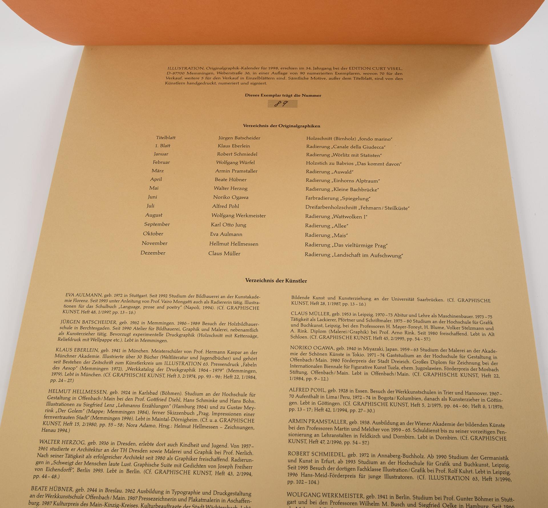 Limitierte Auflage von 90 nummerierten Exemplaren, hier Nummer 89. Alle Blätter handsigniert und nummeriert. 14 Originalgraphiken von Eva Aulmann, Beate Hübner, Noriko Ogawa, Robert Schmiedel, Karl Otto Jung, Walter Herzog, Helmut Hellmessen, Claus Müller, Wolfgang Werkmeister, Armin Pramstaller, Jürgen Batschneider, Klaus Eberlein, Alfred Pohl und Wolfgang Würfel. Blätter auf Kalendarium geheftet, mit Deckfolie.