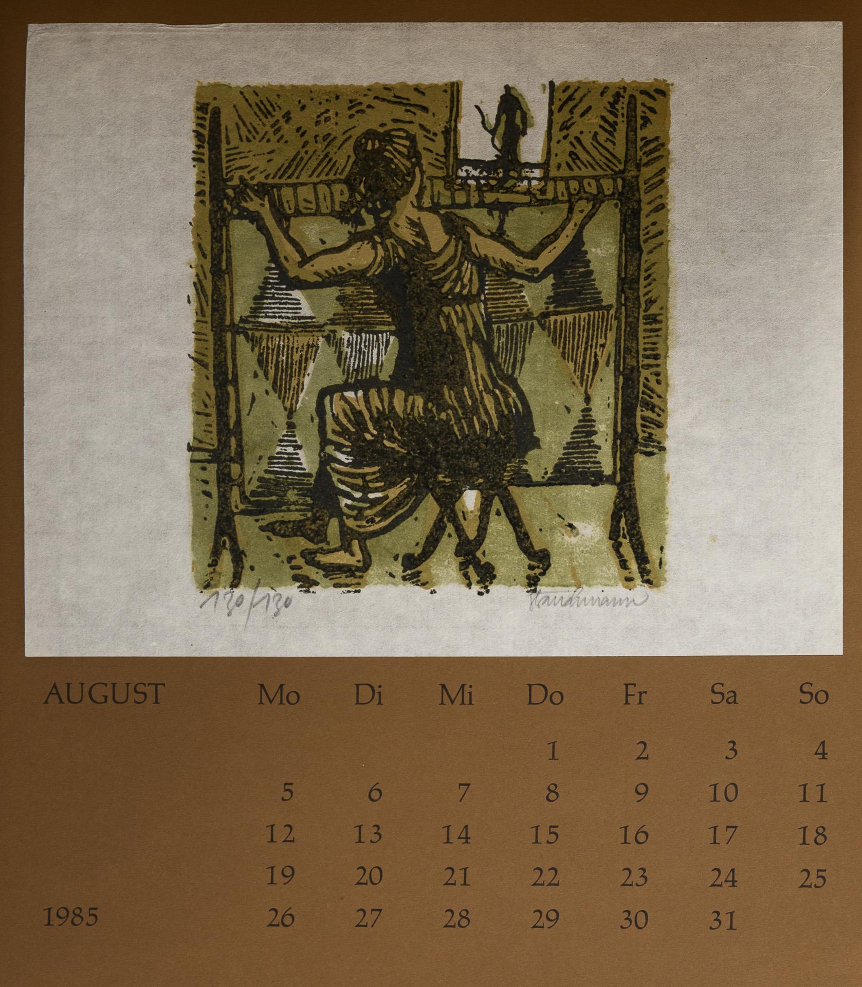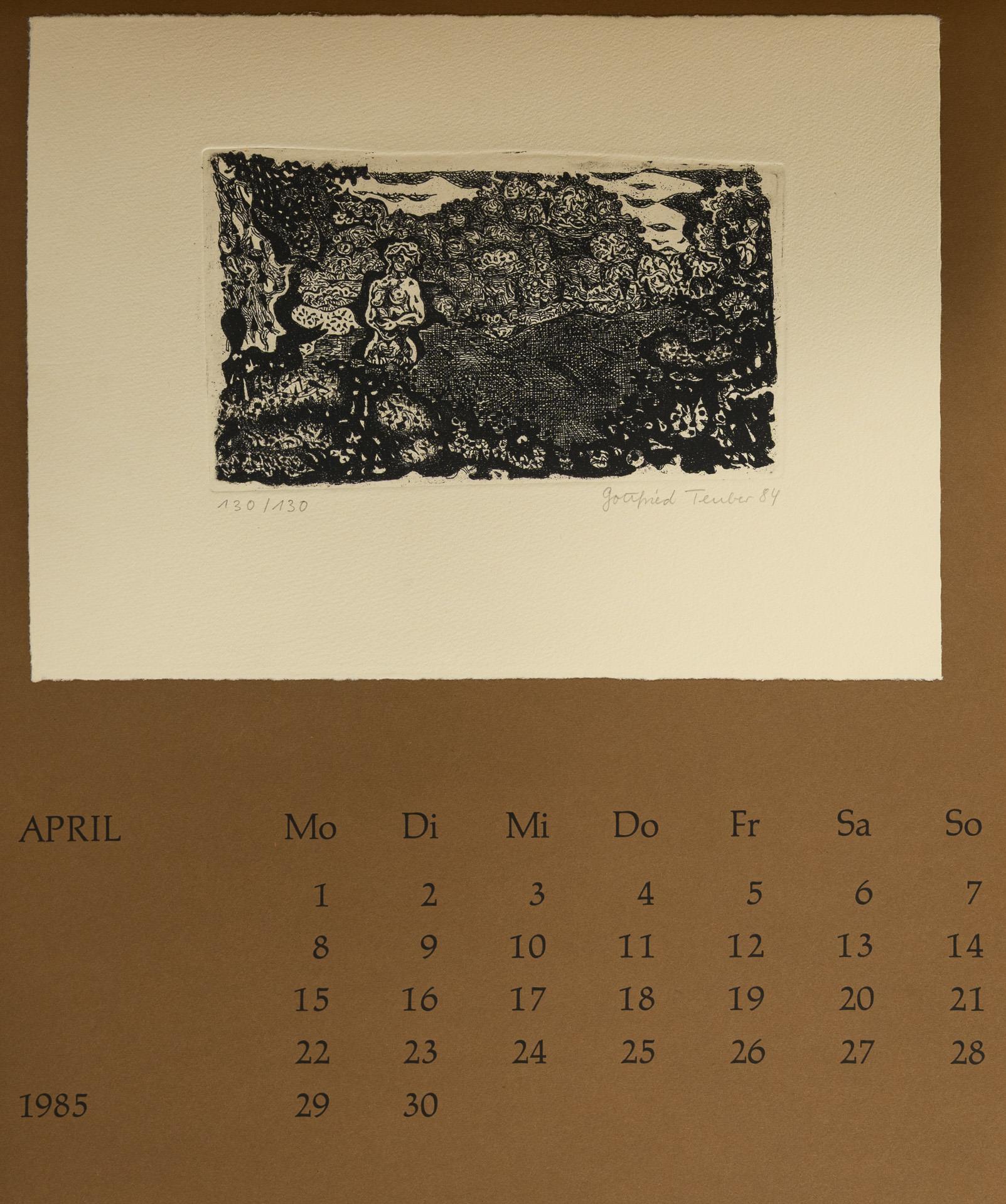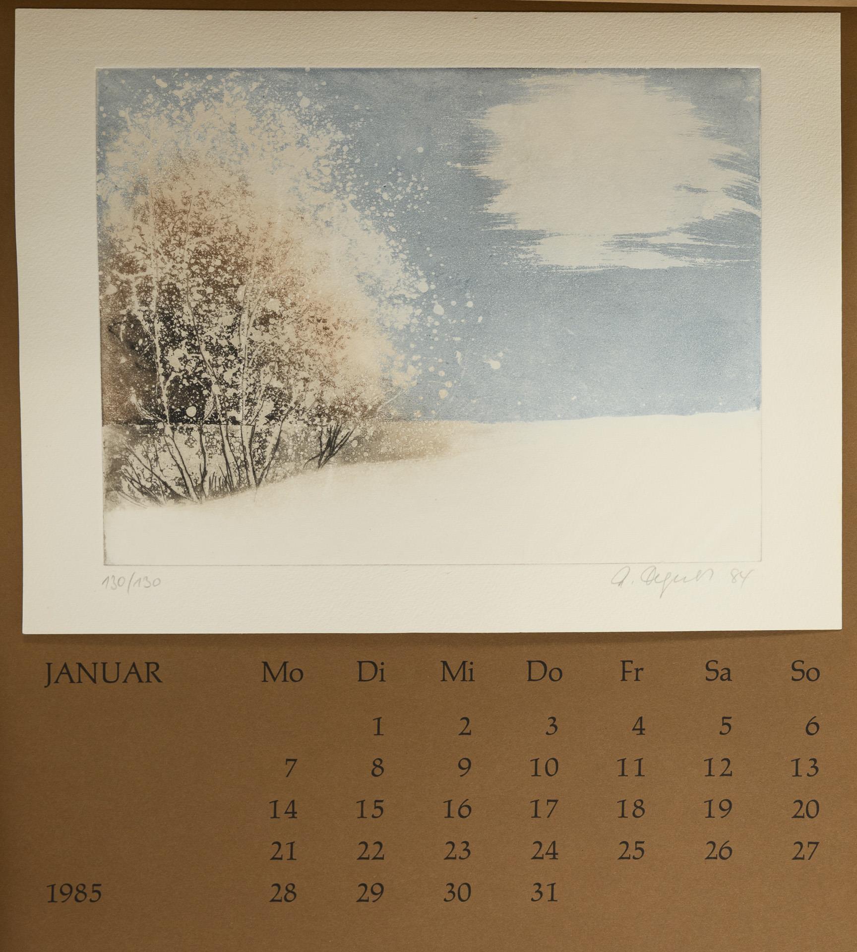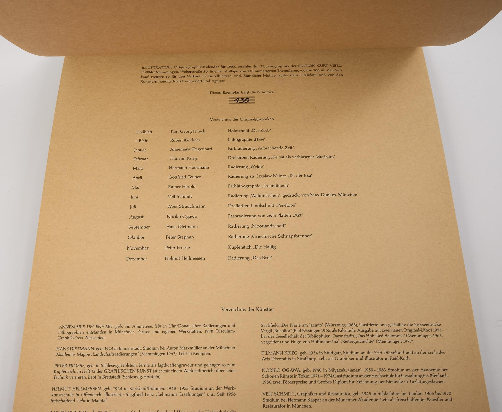 Limitierte Auflage von 130 nummerierten Exemplaren, hier Nummer 130. Alle Blätter handsigniert und nummeriert. Mit 14 Originalgraphiken von Karl-Georg Hirsch, Noriko Ogawa, Peter Froese, Annemarie Degenhart, Robert Kirchner, Weit Schmitt, Peter Stephan, Helmut Hellmessen, Went Strauchmann, Gottfried Teuber, Rainer Herold, Tilmann Krieg, Hermann Hoormann und Hans Dietmann. Blätter auf Kalendarium aufgezogen, Deckfolie etwas verzogen.
