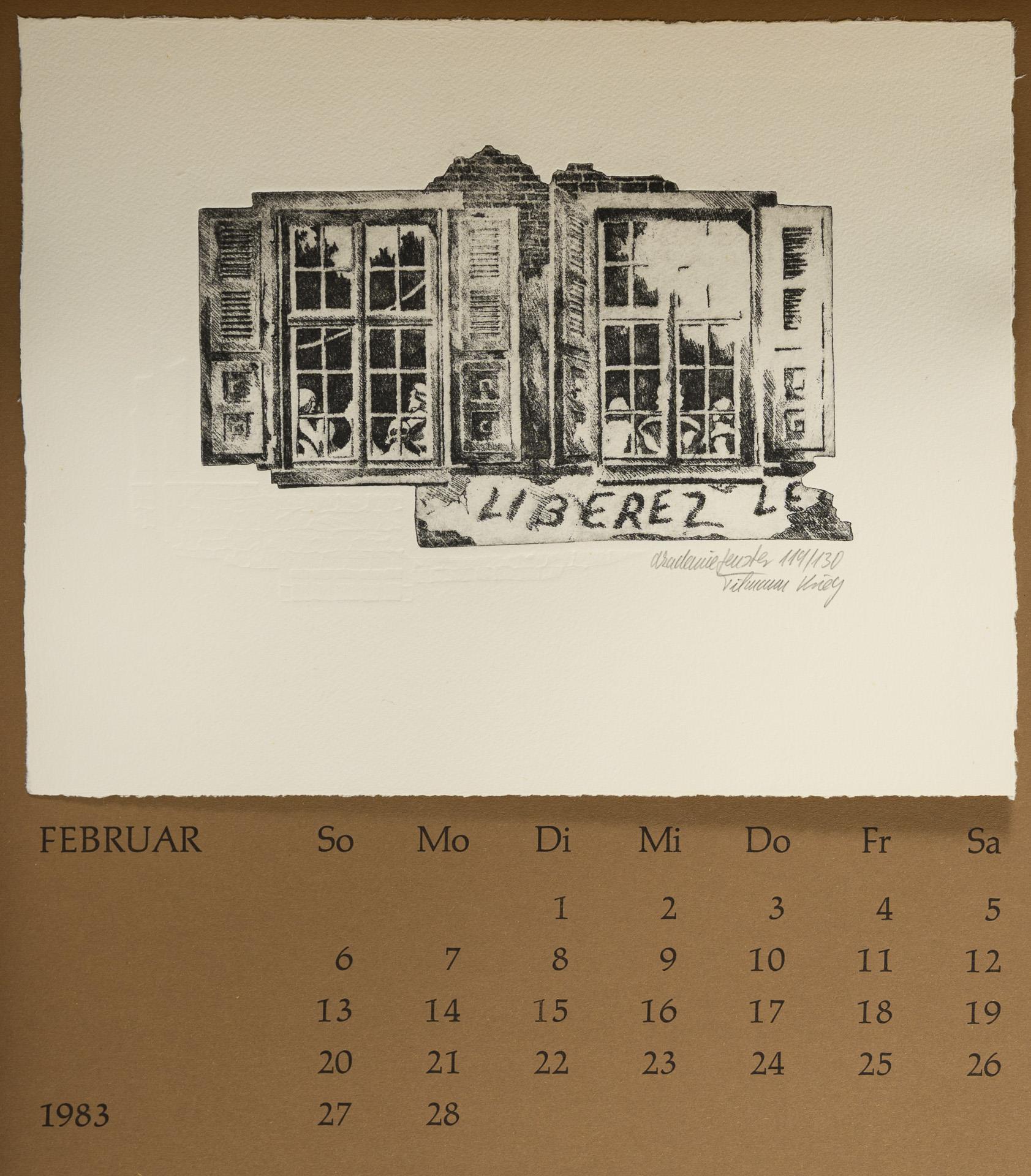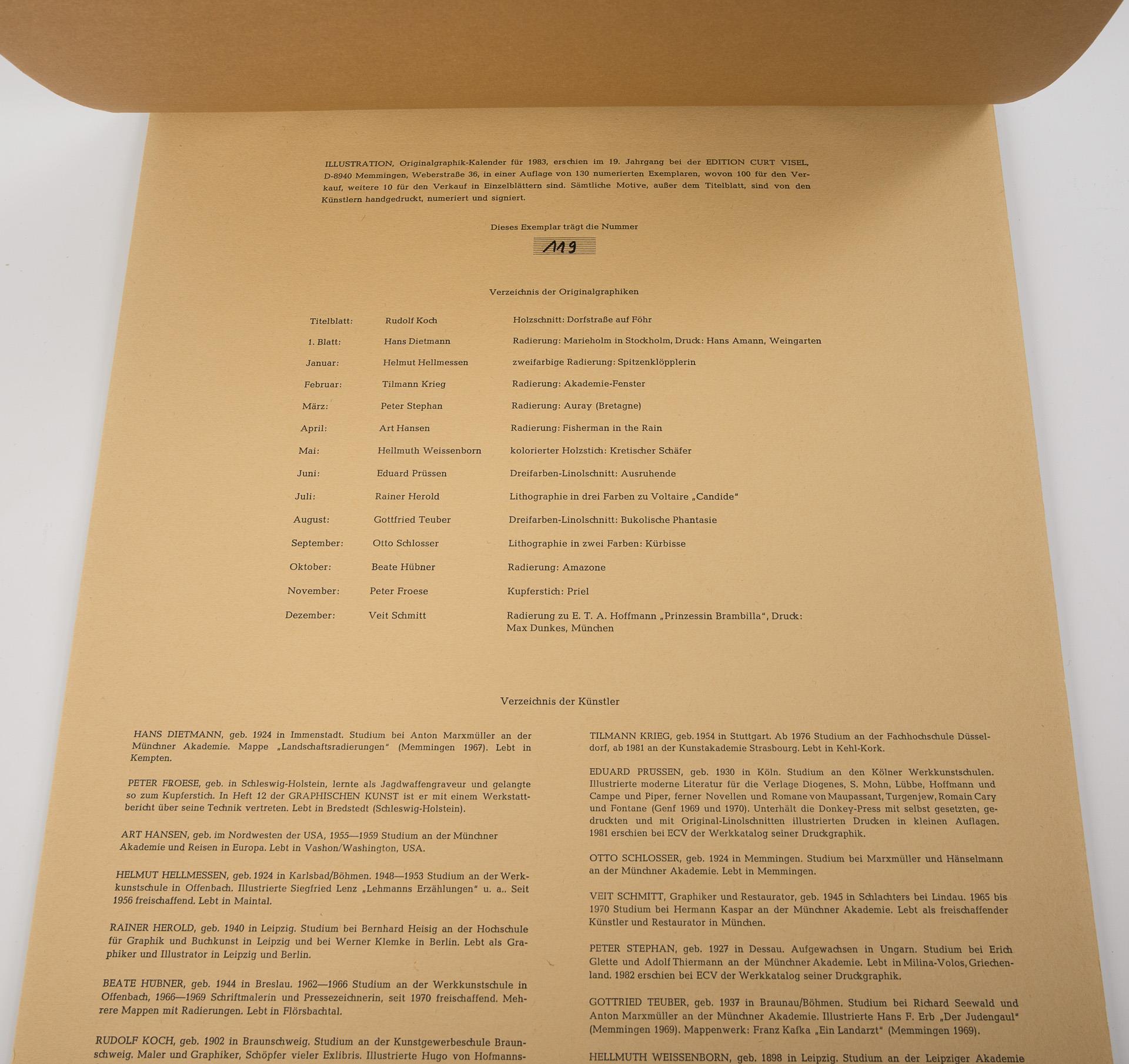Limitierte Auflage von 130 nummerierten Exemplaren, hier Nummer 119. Alle Blätter handsigniert und nummeriert. Mit 14 Originalgraphiken von Hellmuth Weissenborn, Peter Stephan, Art Hansen, Hellmut Hellmessen, Tilmann Krieg, Veit Schmitt, Beate Hübner, Rainer Herold, Rudolf Koch, Otto Schlosser, Hans Dietmann, Eduard Prüssen, Peter Froese und Gottfried Teuber. Blätter auf Kalendarium geheftet, Deckfolie etwas verzogen, einzelne Kalendarien lose.
