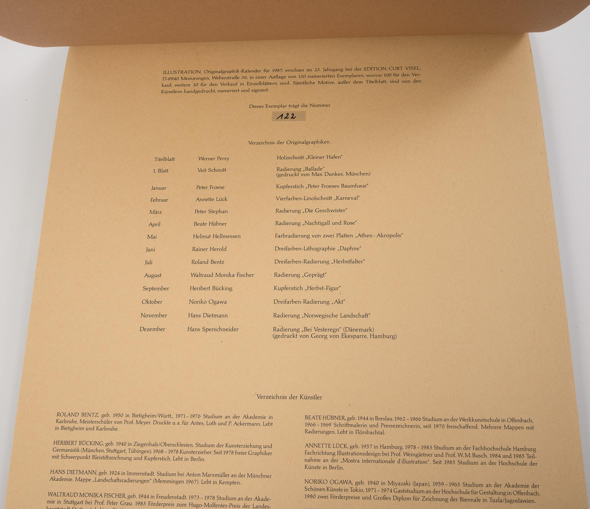 Limitierte Auflage von 130 nummerierten Exemplaren, hier Nummer 122. Alle Blätter handsigniert und nummeriert. Mit 14 Originalgraphiken von Peter Froese, Roland Bentz, Heribert Bücking, Hans Sperschneider, Noriko Ogawa, Annette Lück, Beate Hübner, Waltraud Monika Fischer, Peter Stephan, Rainer Herold, Veit Schmitt, Hans Dietmann, Werner Persy, Helmut Hellmessen. Blätter auf Kalendarium geheftet, Schutzfolie leicht verzogen.
