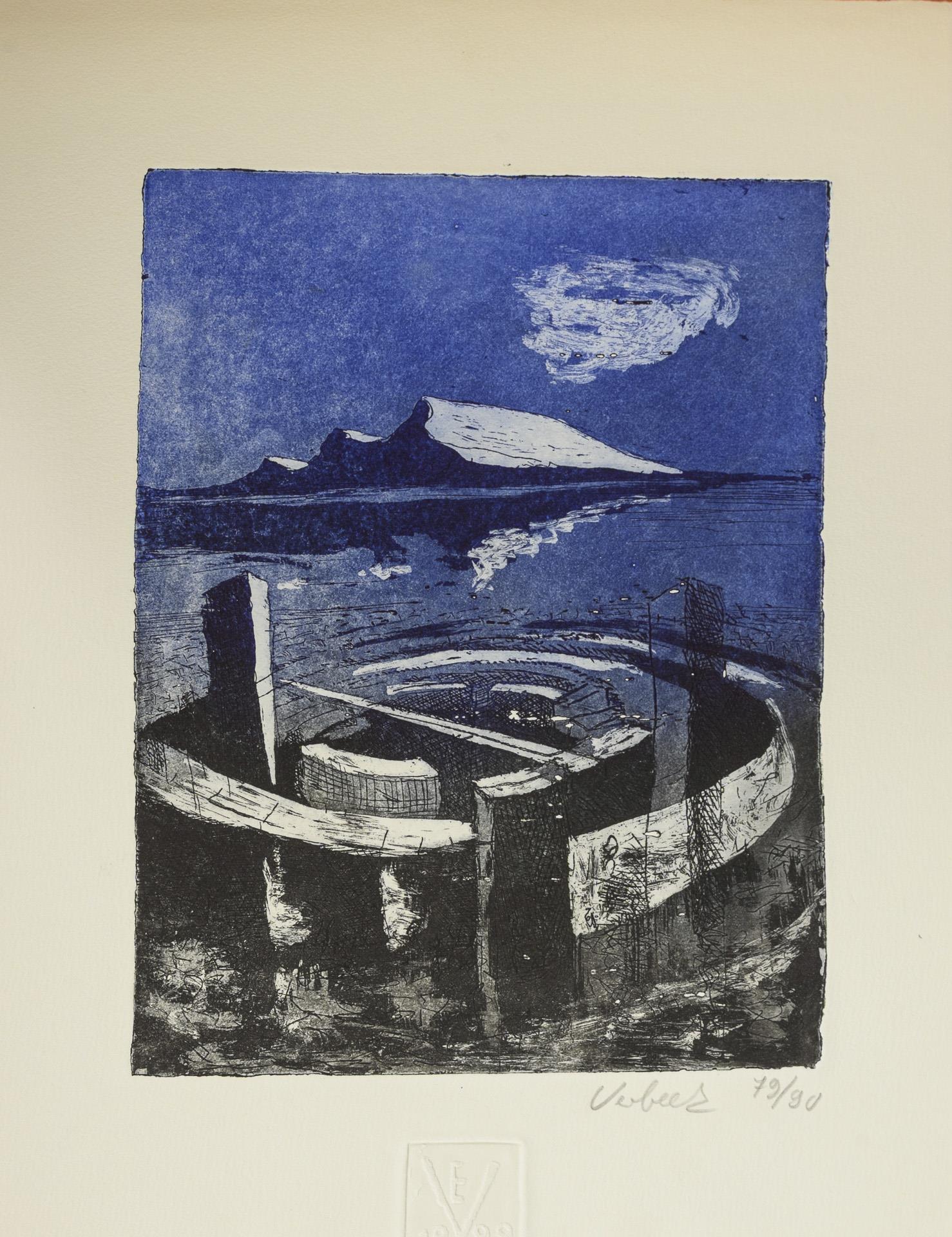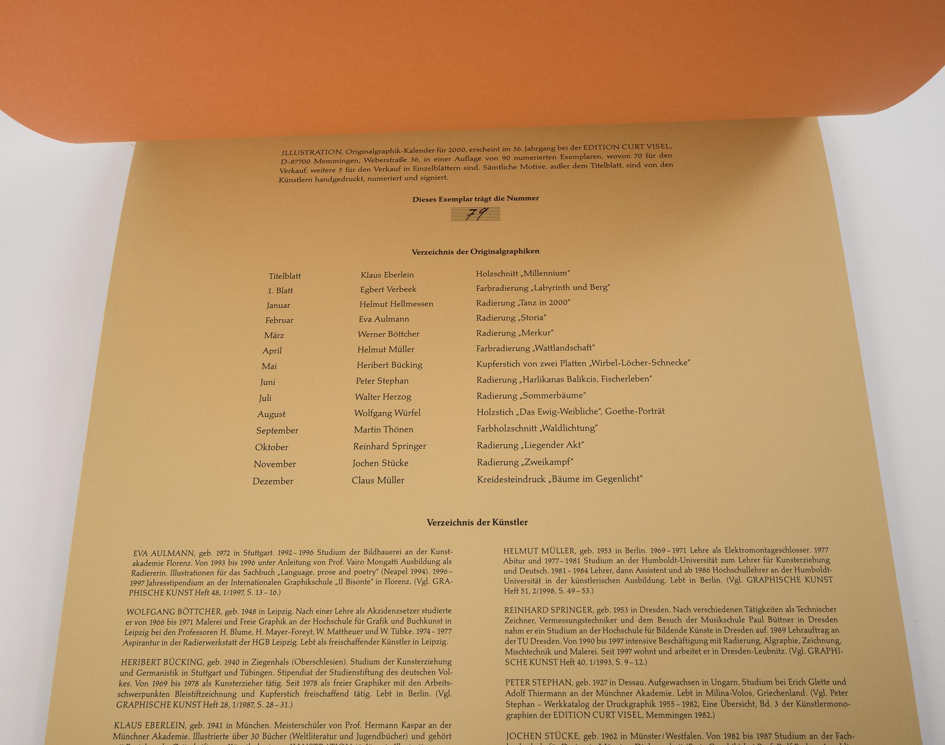Limitierte Auflage von 90 nummerierten Exemplaren, hier Nummer 79. Alle Blätter mit Bleistiftsignatur und nummeriert. Mit 14 Originalgraphiken von Walter Herzog, Wolfgang Würfel, Eva Aulmann, Klaus Eberlein, Egbert Verbeek, Helmut Hellmessen, Claus Müller, Wolfgang Böttcher, Helmut Müller, Heribert Bücking, Jochen Stücke, Peter Stephan, Martin Thönen, Reinhard Springer. Blätter auf Kalendariumblatt geheftet, Deckfolie leicht verbogen.