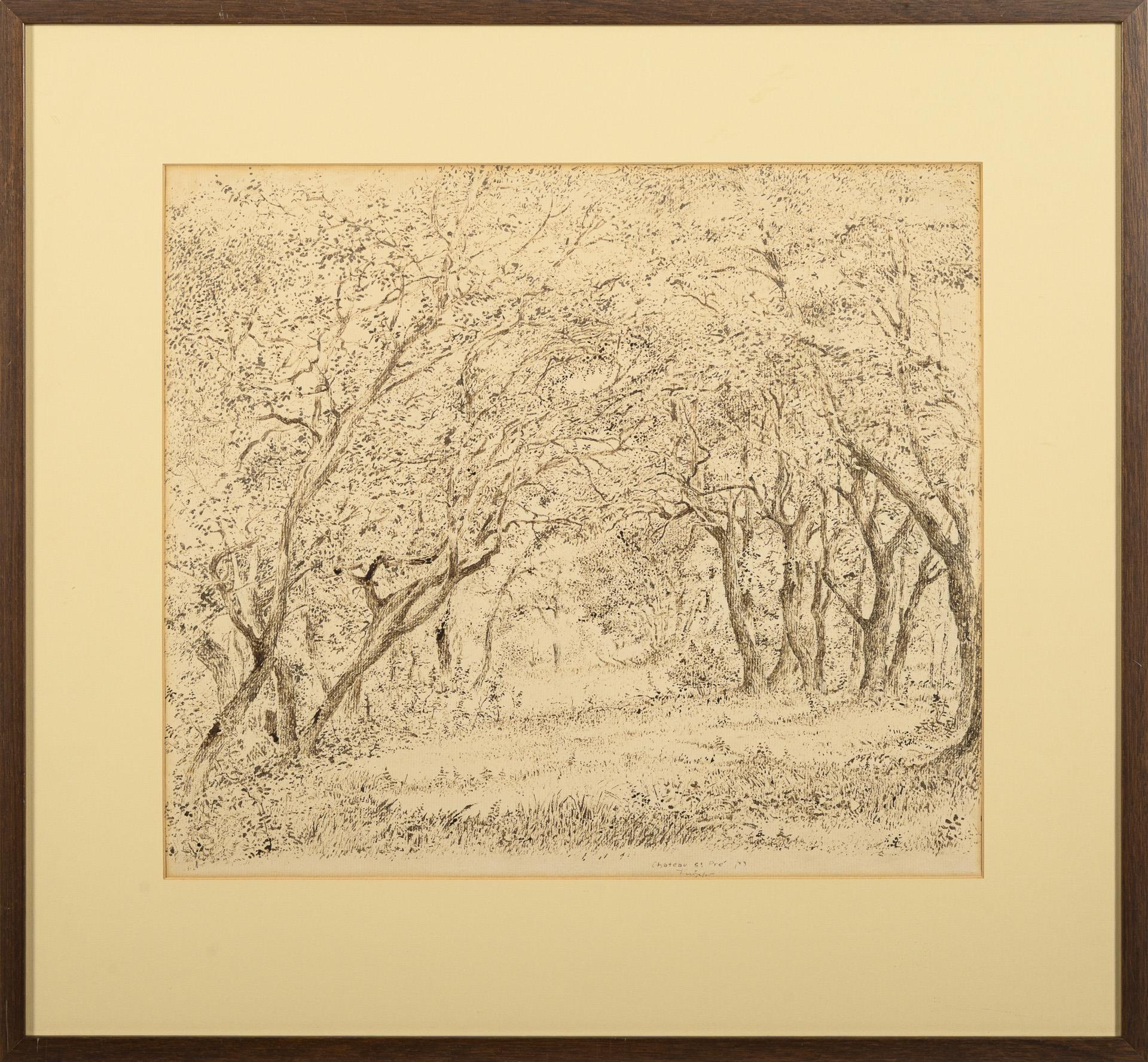 Großformatige, zarte Zeichnung einer Wiese mit alten Bäumen.