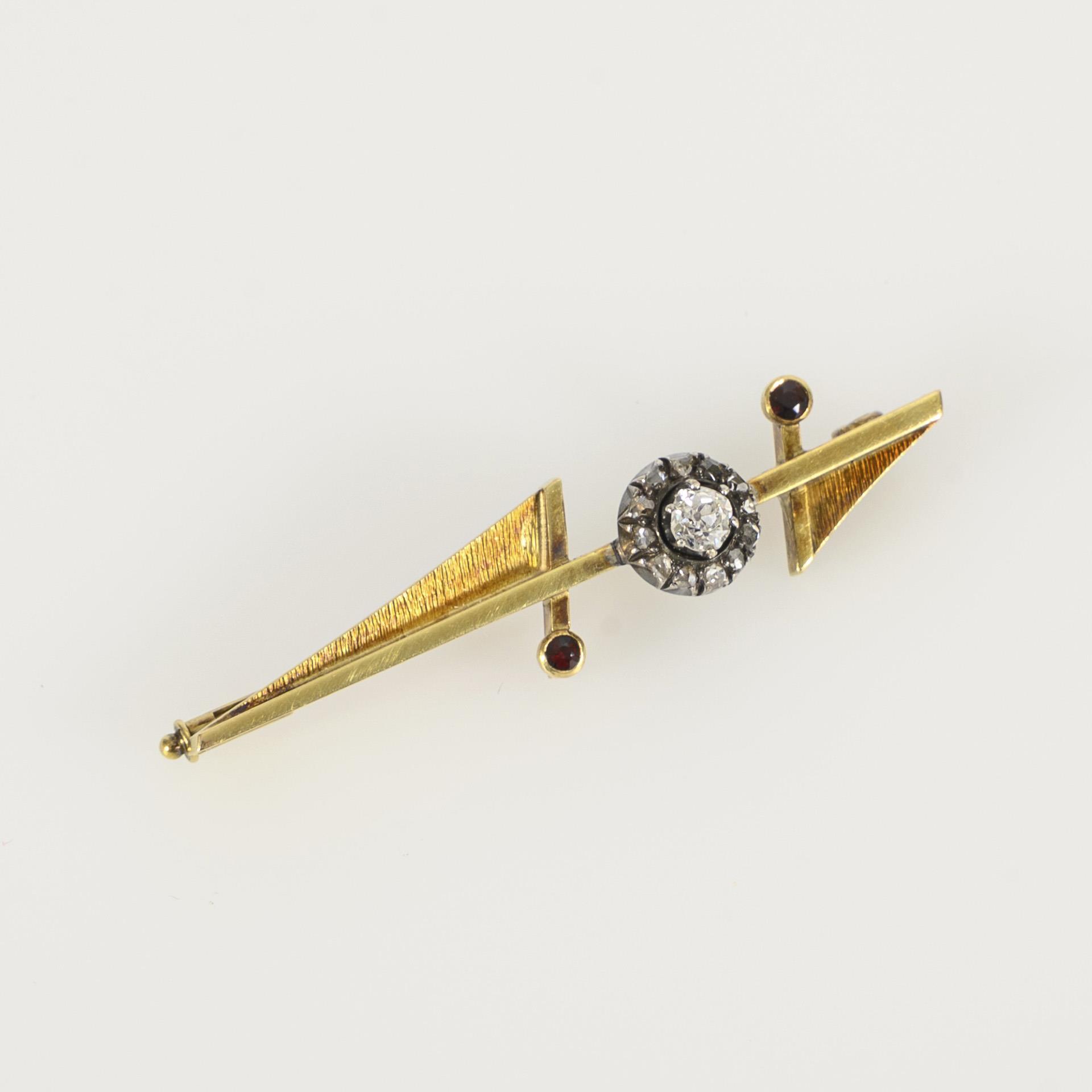 Stabbrosche der 1960er oder -70er Jahre mit 2 zargengefassten Granatsteinen in Mariage mit einem blütenförmigen Element aus dem späten 19. oder frühen 20. Jahrhundert, mit einem Besatz aus einem zentralen Altschliff-Brillanten und diesen umgebenden Kranz aus kleinen Diamanten im Rosenschliff, in variierender Qualität.