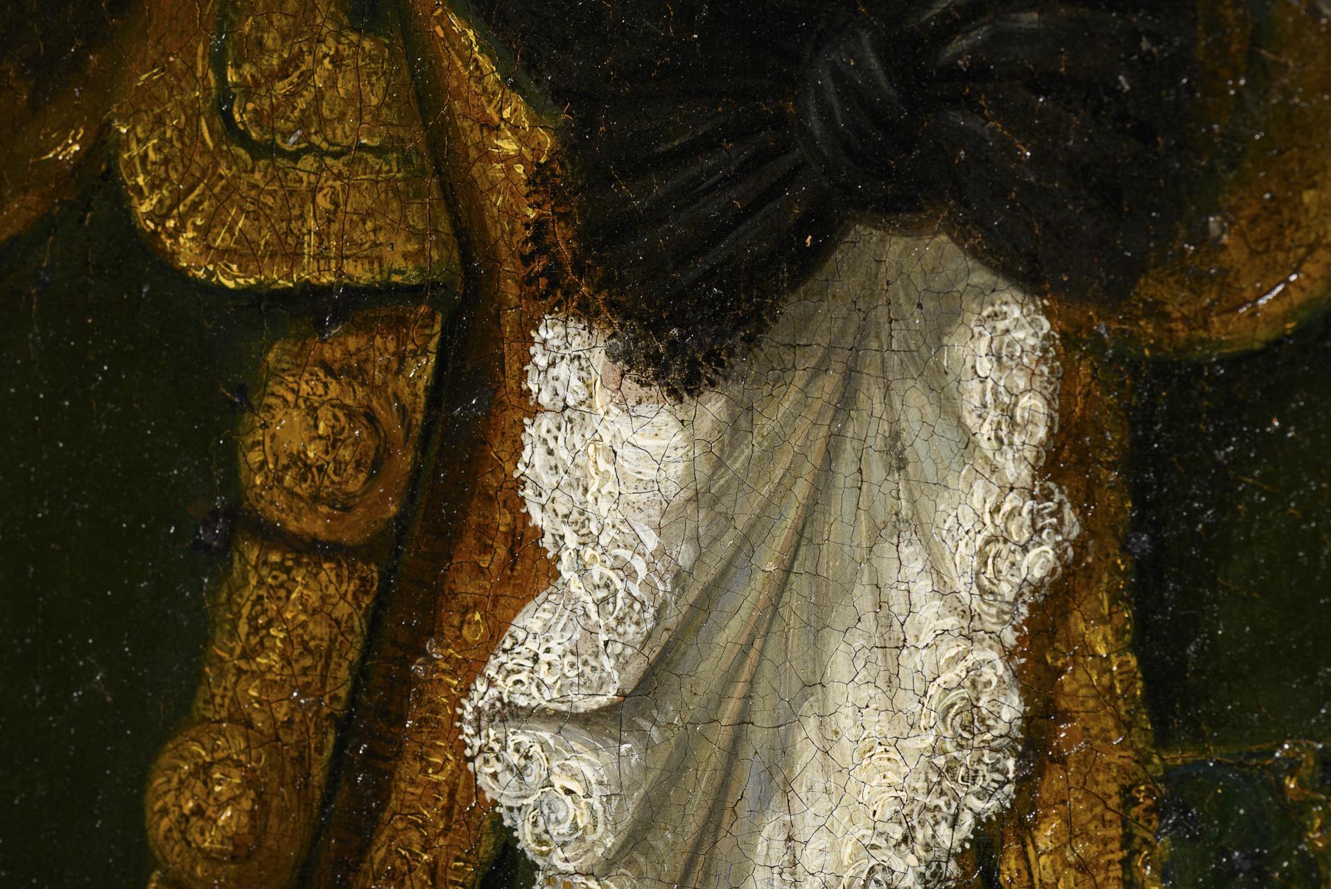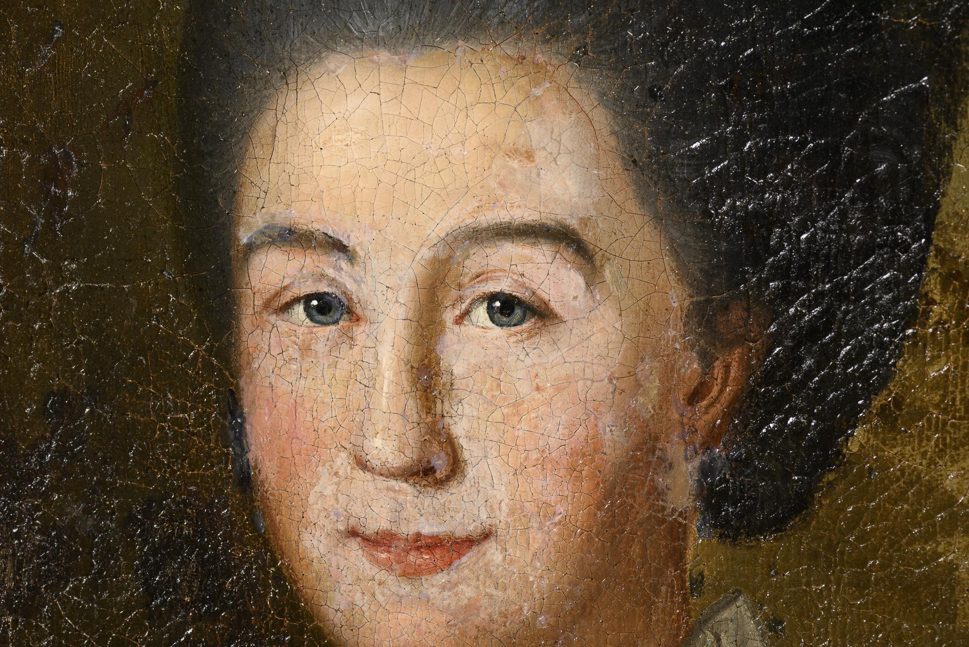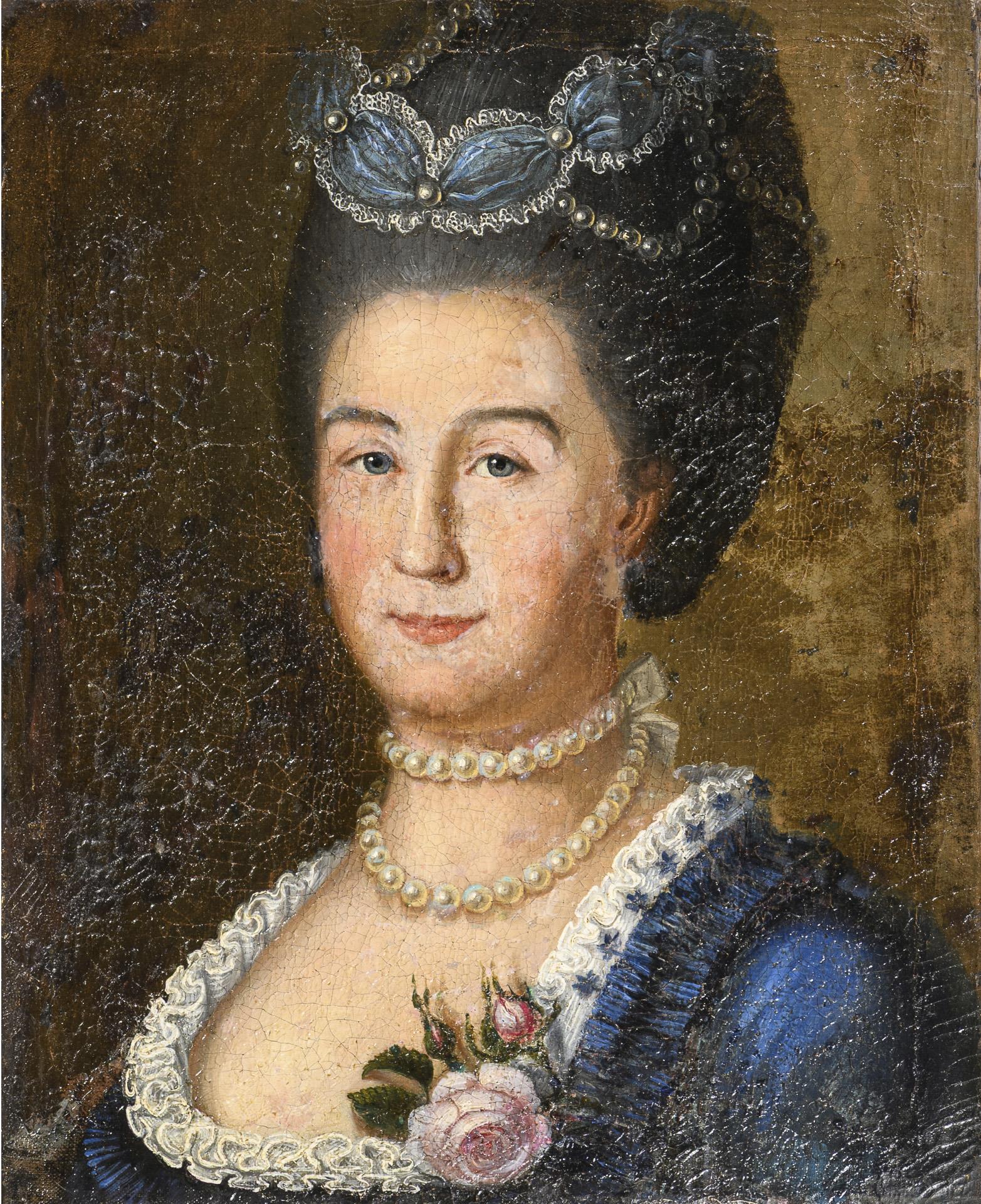 Porträts eines Herren mit weißer Zopfperücke und im grün-goldenen Gehrock sowie einer Frau mit dunkler Perücke und im blauen Kleid mit Perlenkette. Altersspuren.