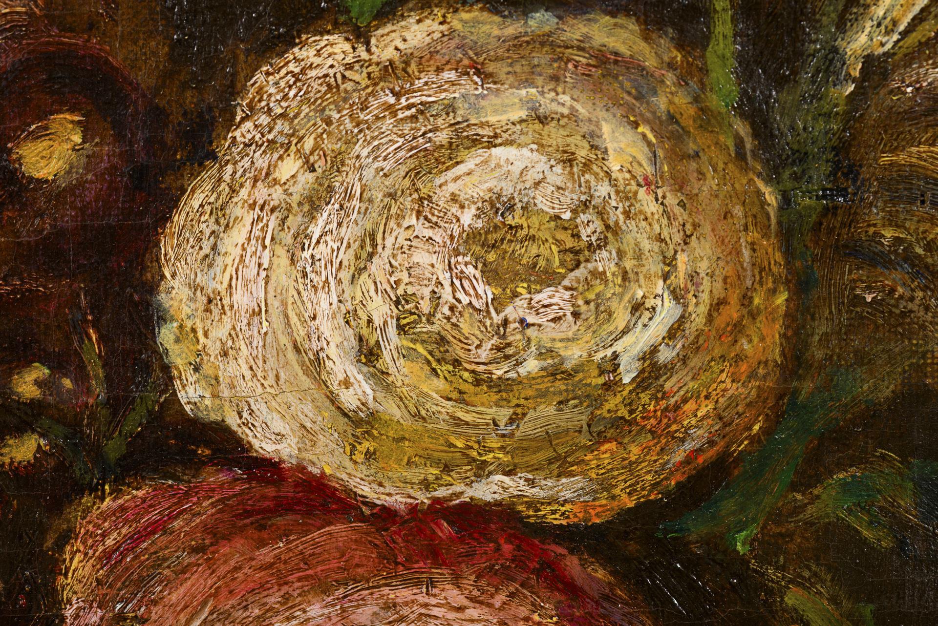 Großer Blumenstrauß in einer Glasschale vor dunklem Hintergrund. Restauriert mit Hinterklebungen, Defekte.