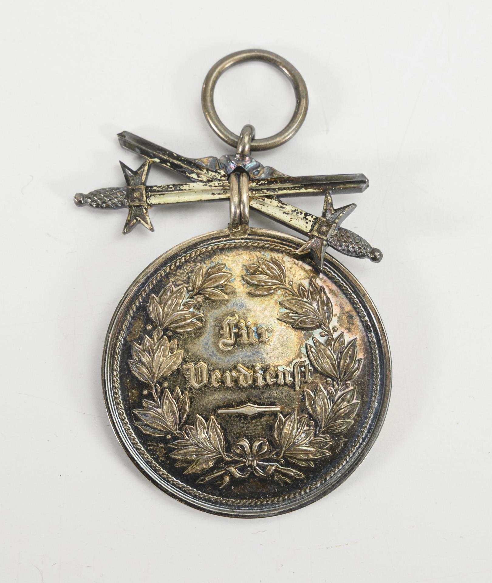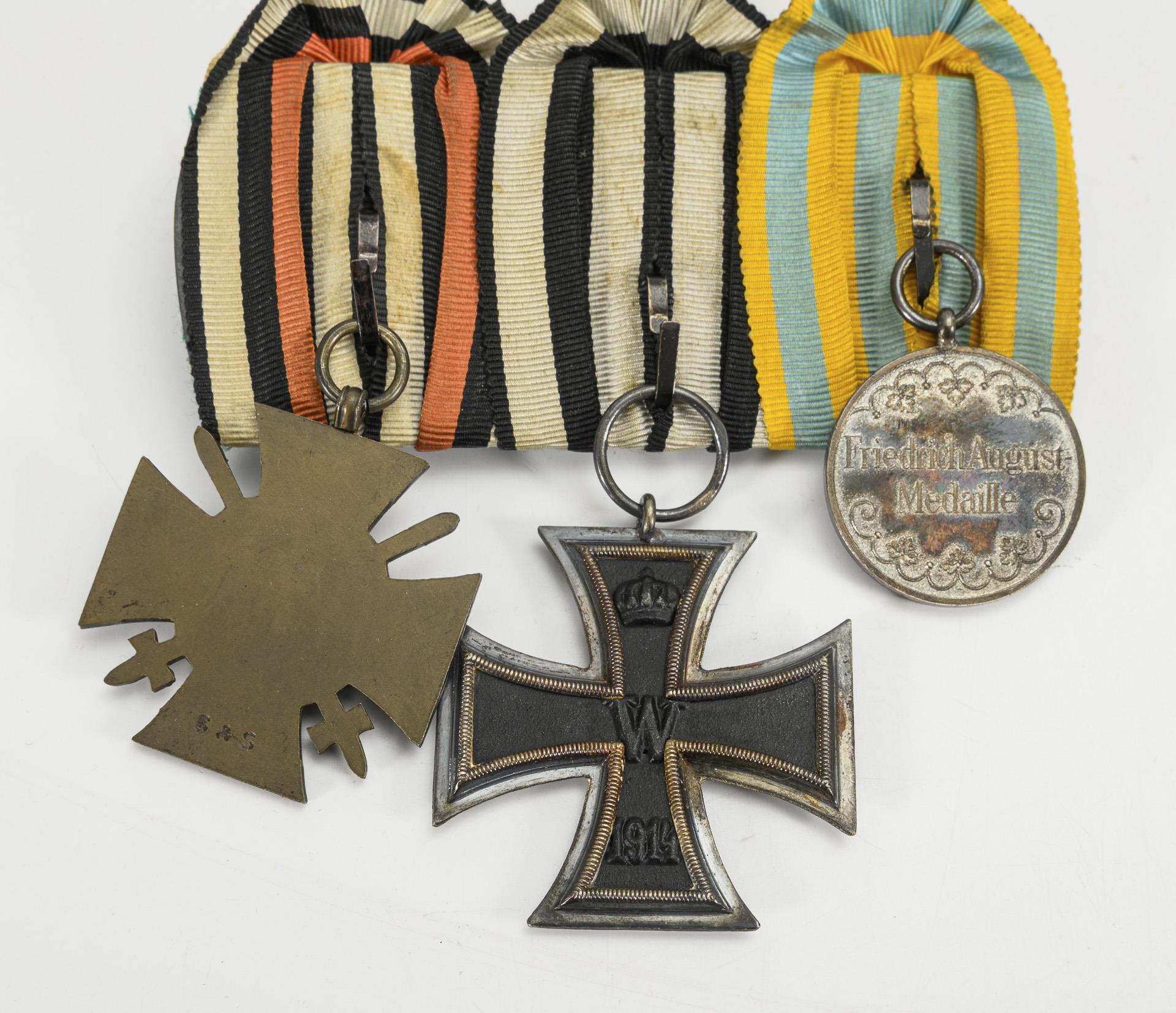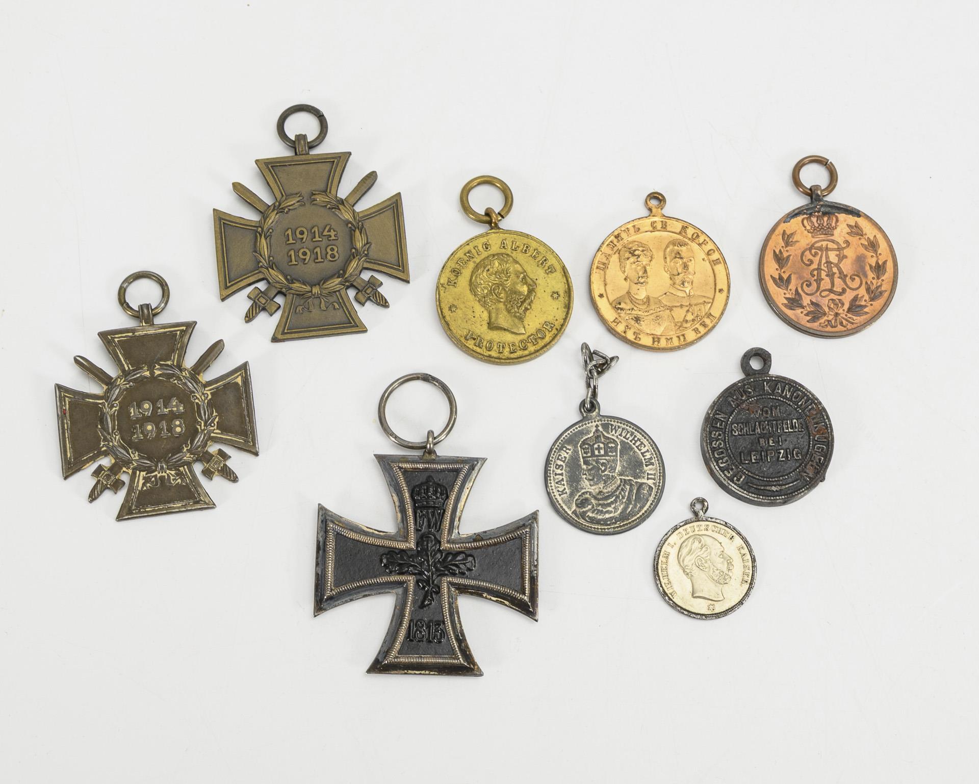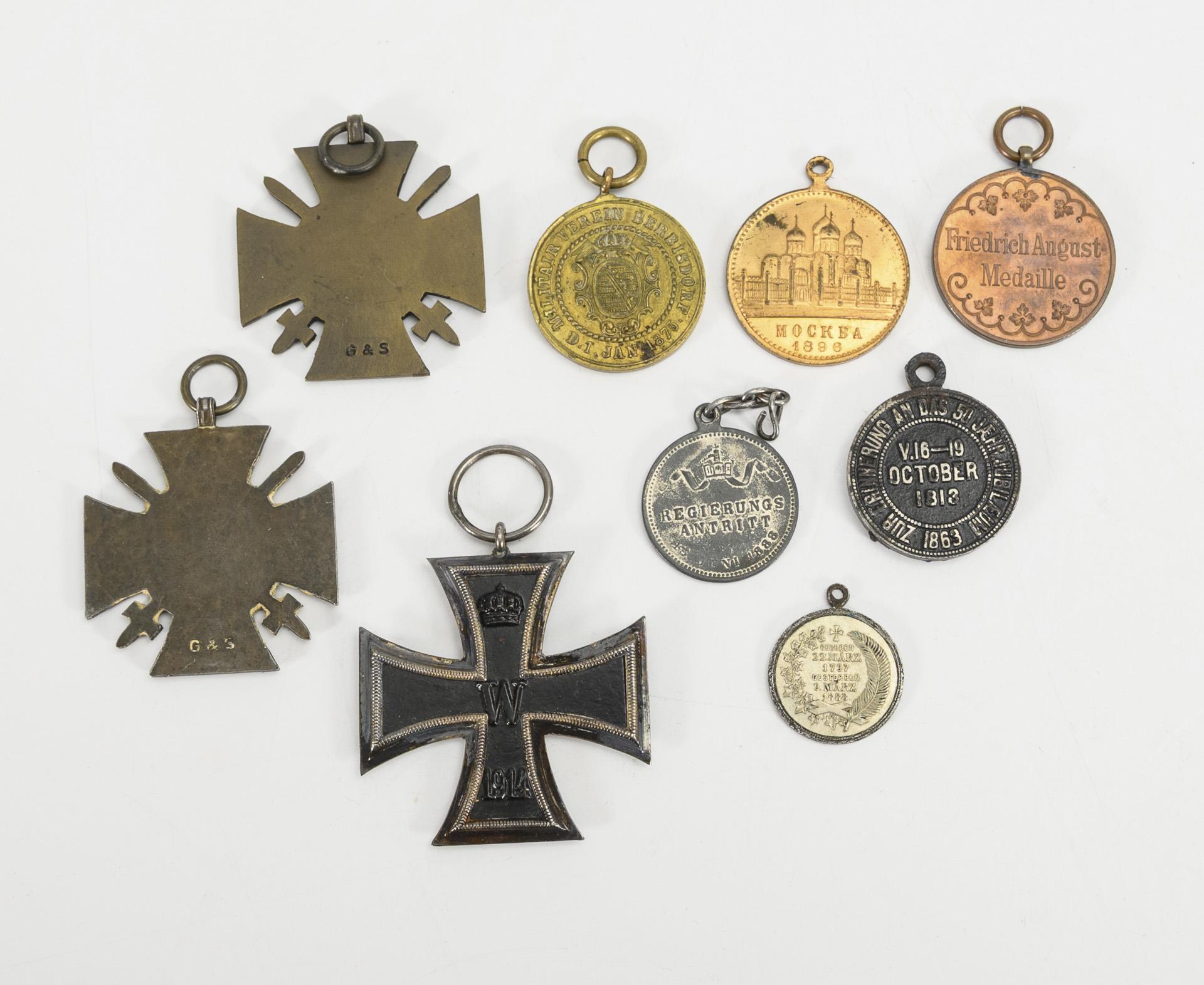 Silberne Verdienstmedaille mit Schwertern, Fürstentum Reuß, mit Band, in Originalschatulle. / Ordensspange mit Kriegsteilnehmermedaille, Eisernem Kreuz und silberner Friedrich-August-Medaille. / Friedrich-August Medaille in Bronze mit Originalkuvert. / Medaille des Militärvereins Berbisdorf, 1. Januar 1875, "König Albert Protector". / Eisernes Kreuz 1914. / 2x Kriegsteilnehmer-Medaillen. / Erinnerungsmedaille "Zur Erinnerung an das 50jährige Jubilaeum 1863", "Gegossen aus Kanonenkugeln vom Schlachtfeld bei Leipzig". / Medaille zum Regierungsantritt Kaiser Wilhelms II. 1888 / Gedenkmedaille: "Wilhelm I. Deutscher Kaiser, Geboren 22. März 1797 Gestorben 9. März 1888". / Gedenkmedaille "Moskwa 1896" mit dem Zarenpaar und kyrillischer Beschriftung. / Weitere Ordensbänder und Knopflochbänder. Nachlass eines Königlich Sächsischen Leibgrenadiers (1888 - 1960) .