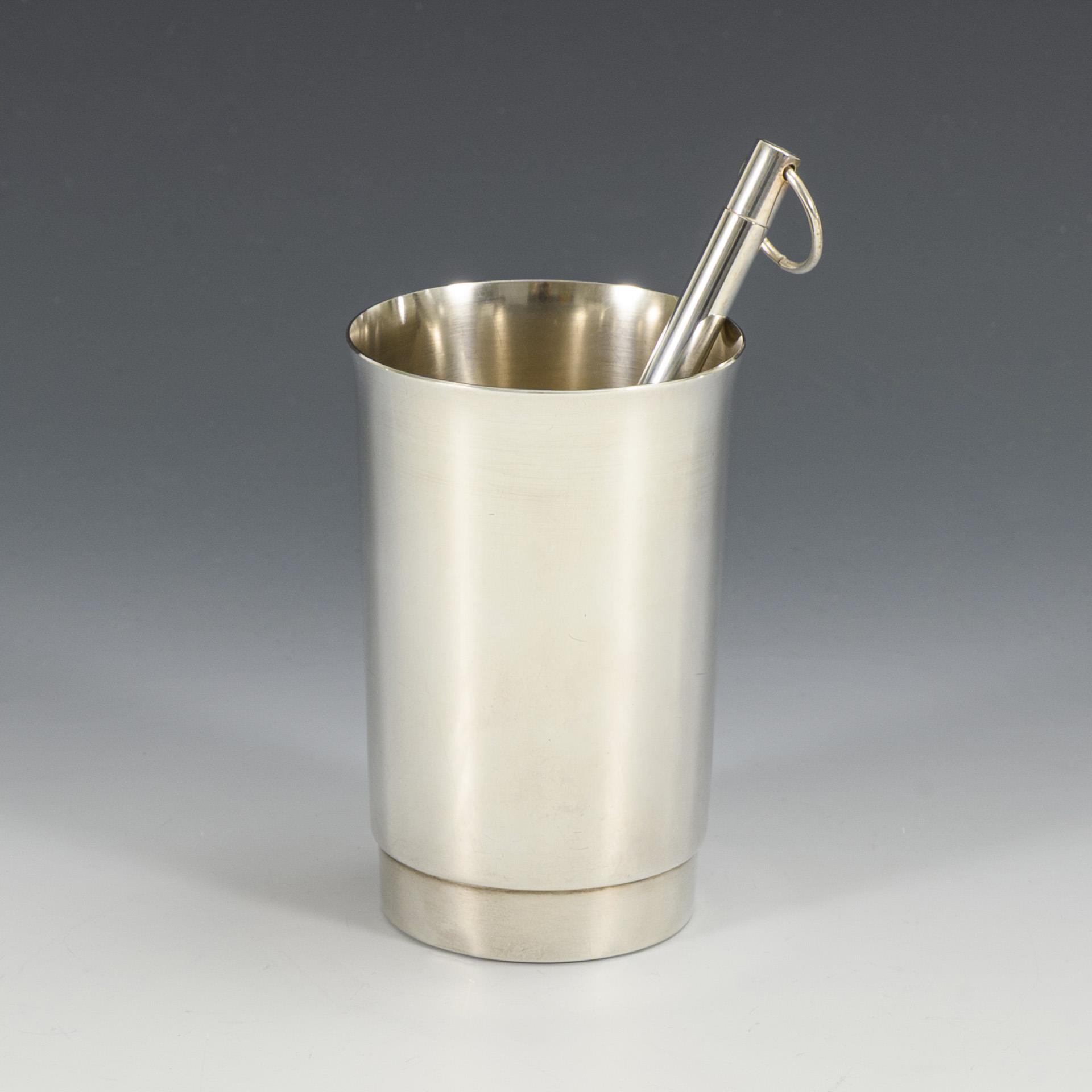 Schlichter Becher (Wilkens/835), mit kleiner Delle am Stand, H 11 cm. Thermometer in glatter Hülle mit Schraubverschluss, L 17 cm.