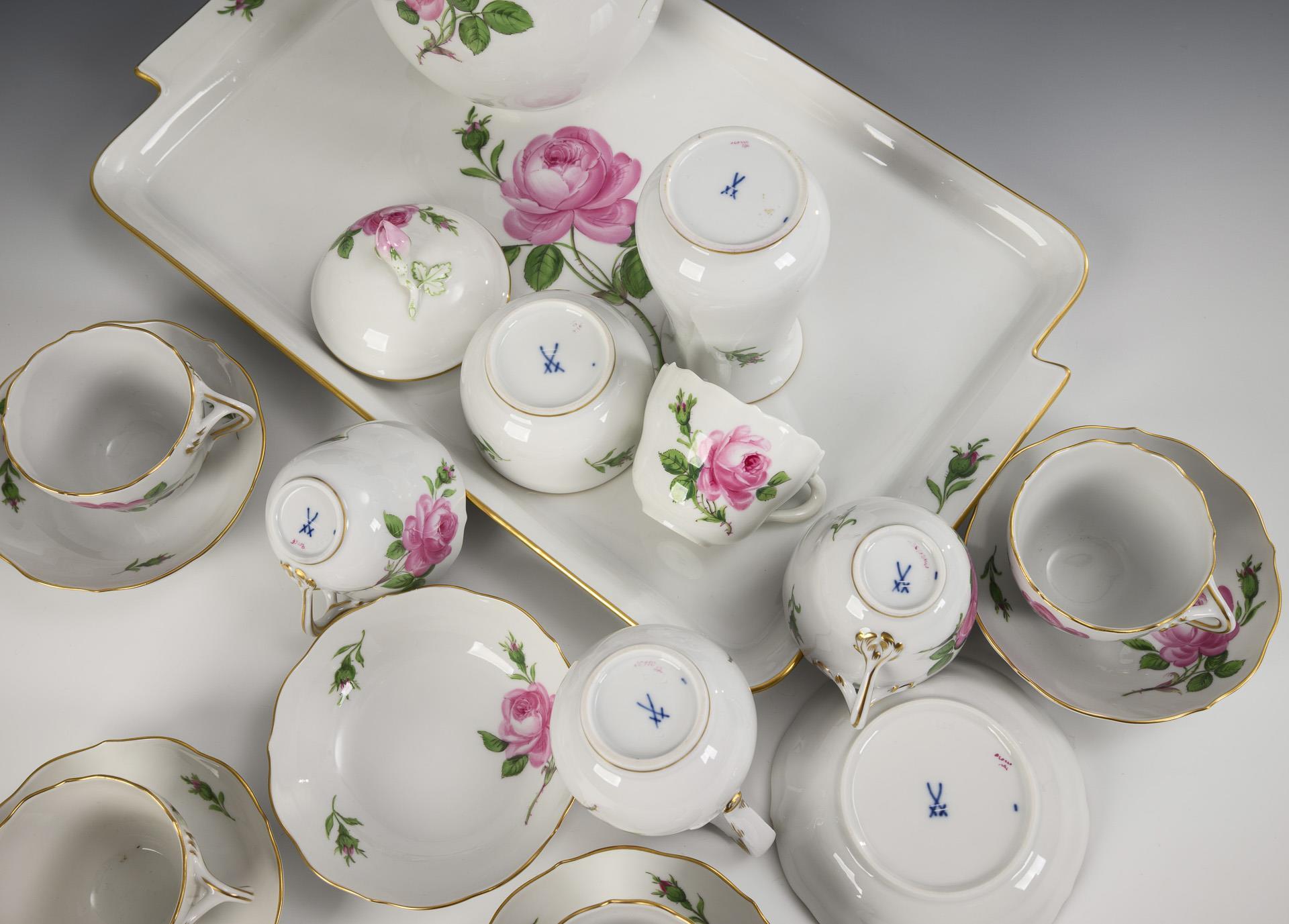 18 Teile. Mokkakanne (H 22 cm), Milchkännchen, Zuckerdose, 6+1 Mokkatassen, 6 Untertassen, 1 Vase (H 11 cm) und 1 rechteckiges Tablett (L 38 cm).