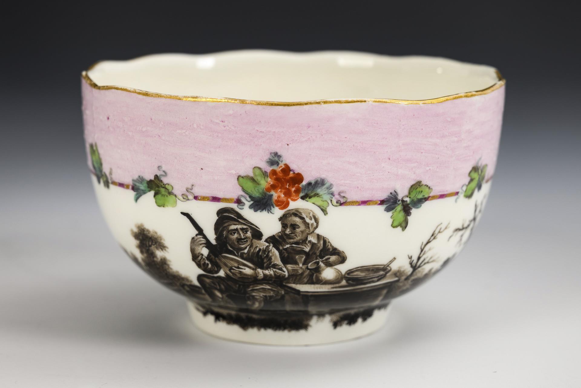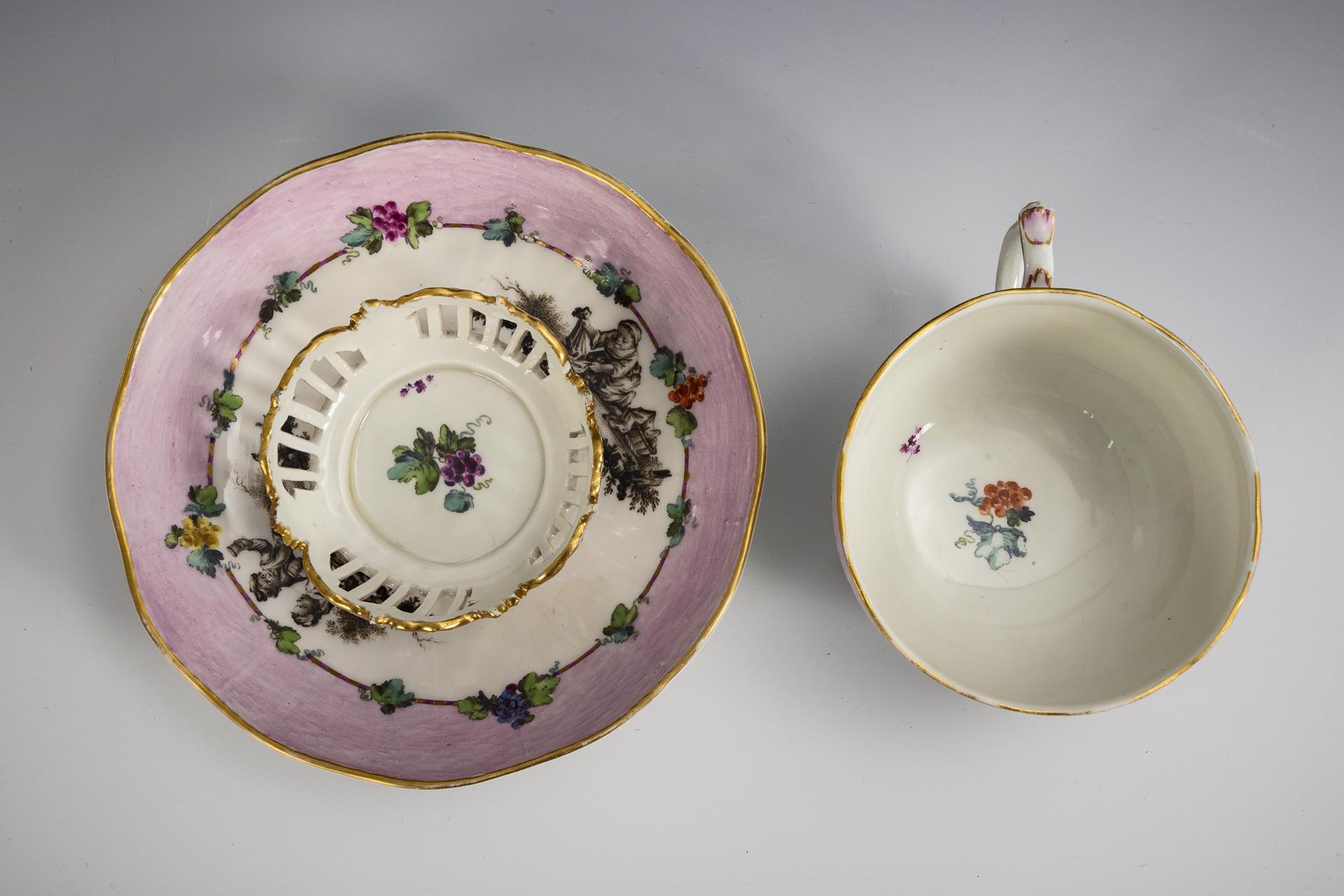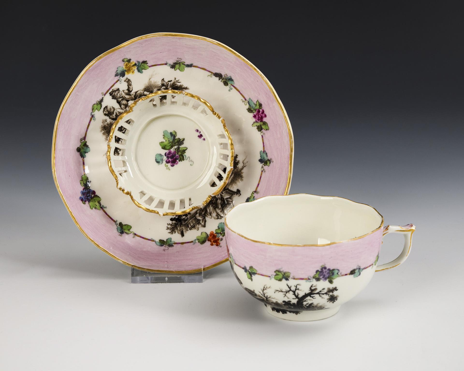 Bauchige Tasse mit dem Reliefdekor "Altozier" sowie Untertasse für eine Trembleuse mit durchbrochenem Standring. Beide mit rosafarbener Bordüre und Weinrebe sowie schwarzlotgemaltem Bauernmotiv.