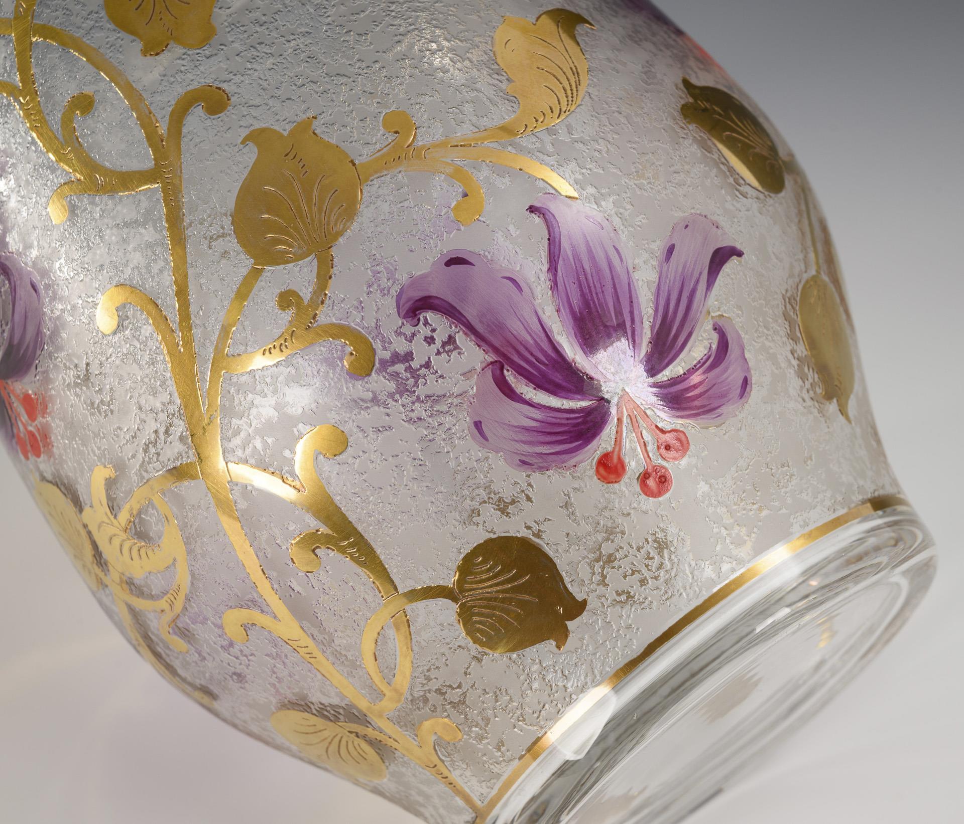 Auf der Wandung geätzte, goldstaffierte und teils polychrom emailbemalte Blütenranken. Minimaler Goldabrieb.